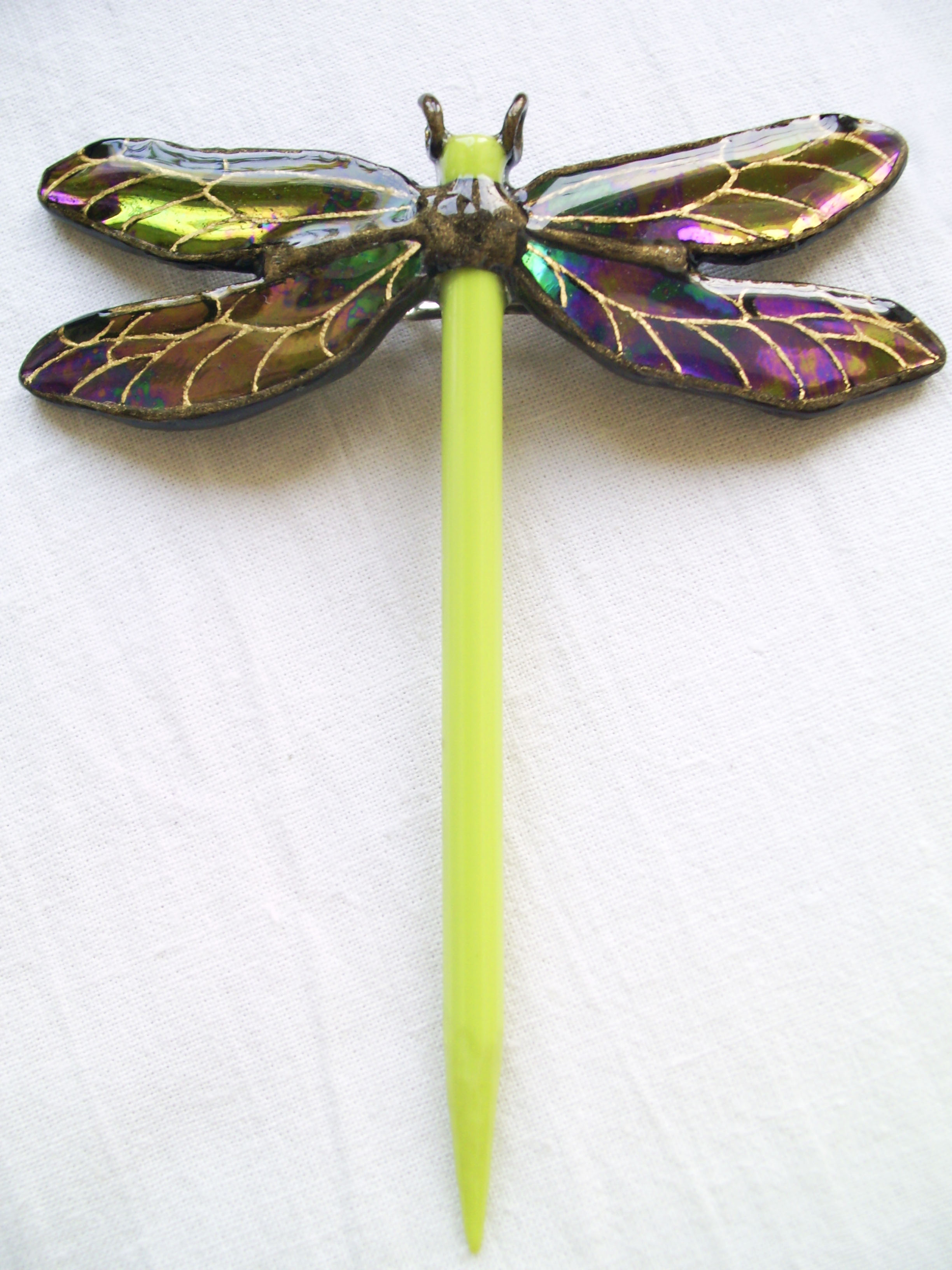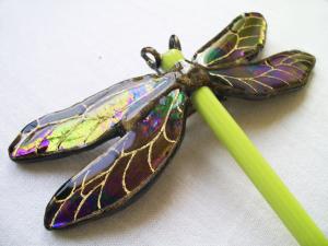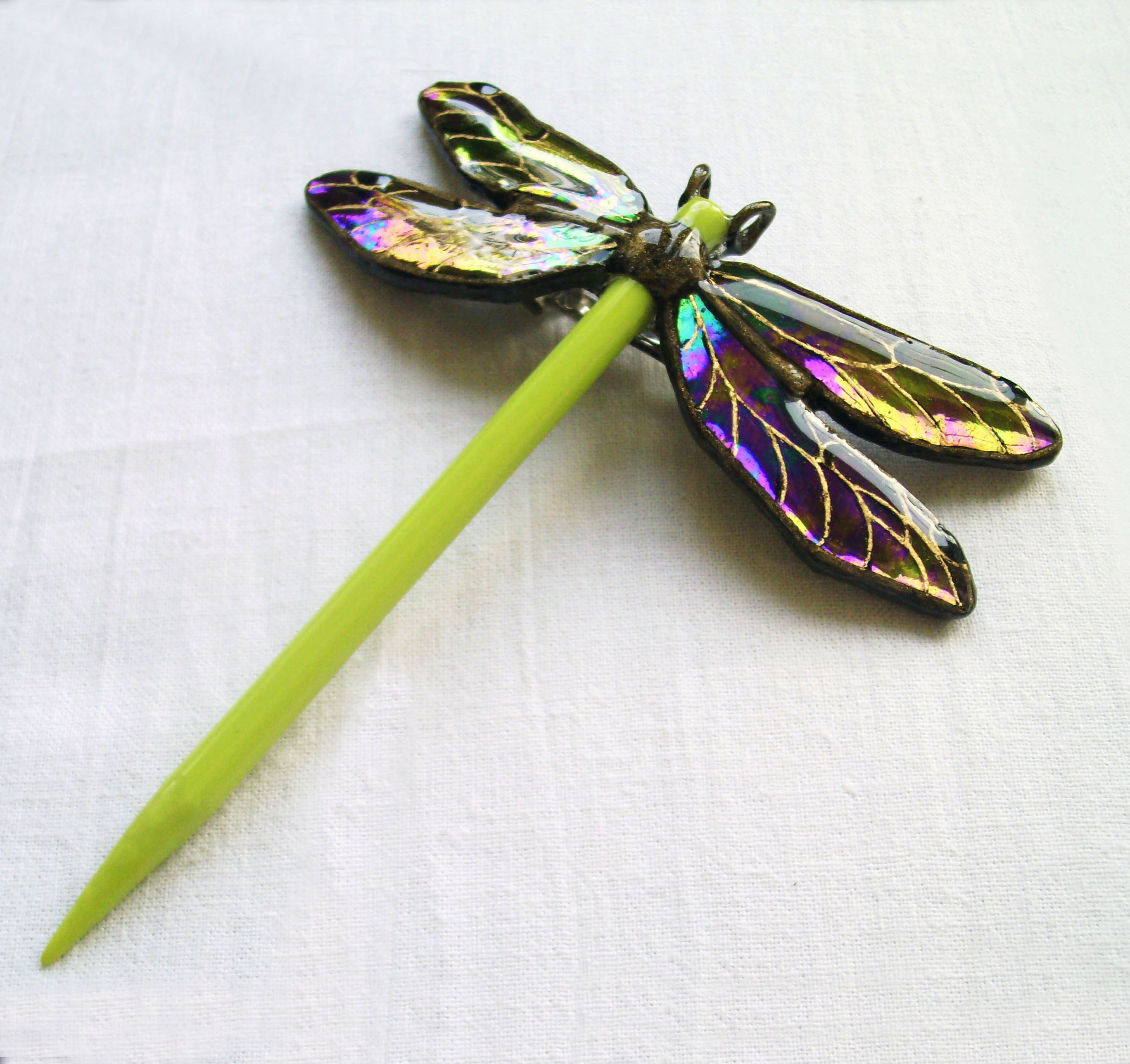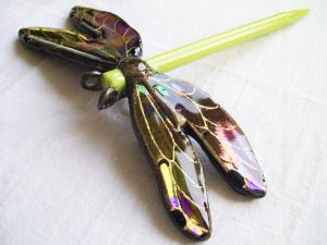 Egy rendelésre készített szecessziós részben pedig keleties hangulatot idíző szitakötő, melyet copfba, kontyba, fixen feltűzött frizurába lehet tűzni, és a hátulján lévő csat részével rögzíteni.