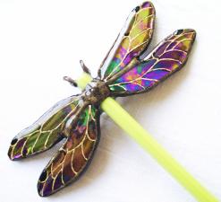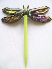 Gyönyörű színkavalkád, a szárnyai szivárványos irizált üvegből készültek, ezt festettel meg arannyal , hogy szárny-erezete is legyen. alapja világoszöld hegyezett üvegpálca. Mindene ultra biztosan rögzített, forrasztott, ragasztott, a 3D üveglakkal pedig domború felületű és csillogó lett