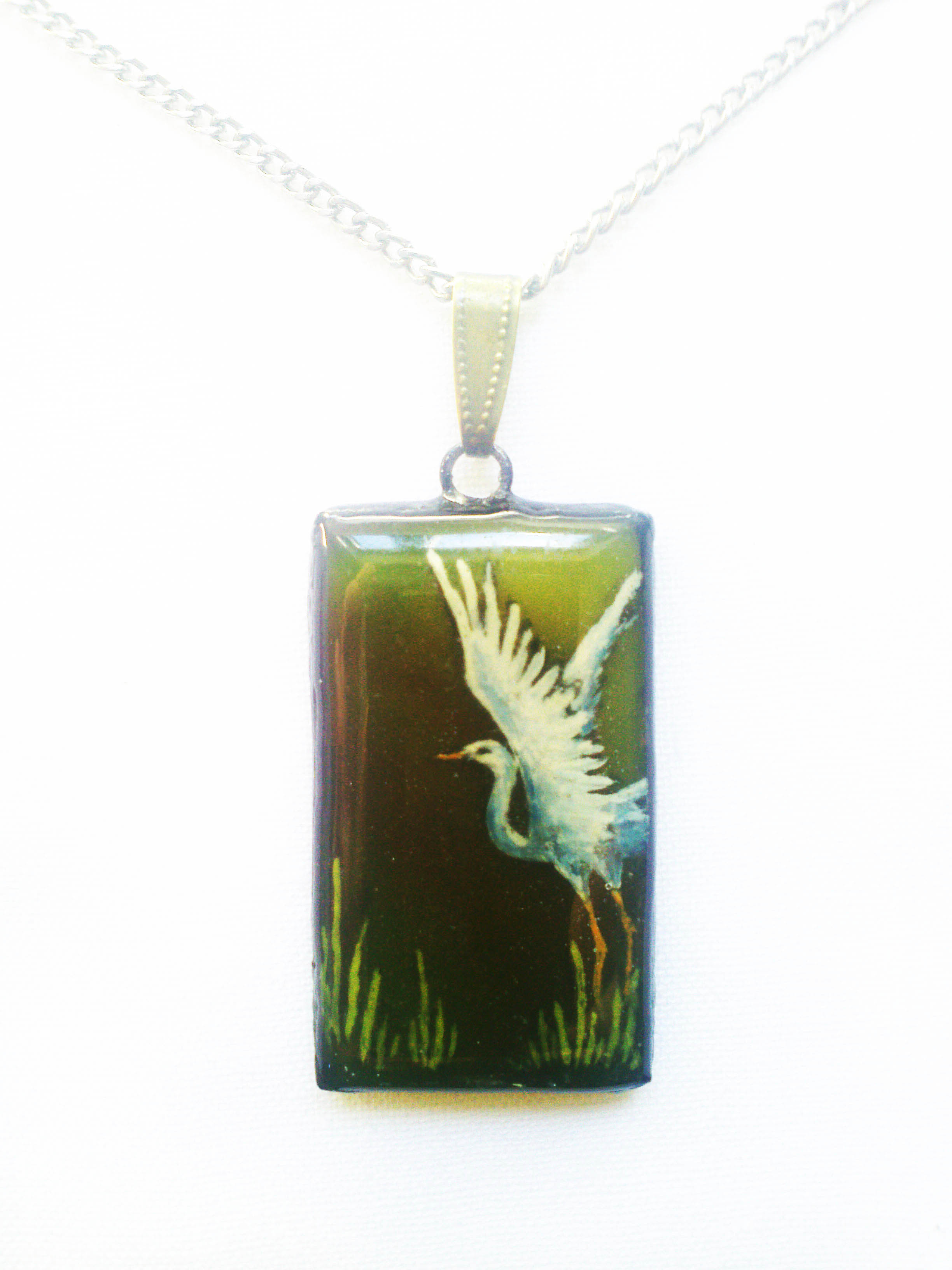 Sötétzöld háttér üveg-alapon egy meseszép vízimadár, egy fehér gém, mely szárnyait eregeti.