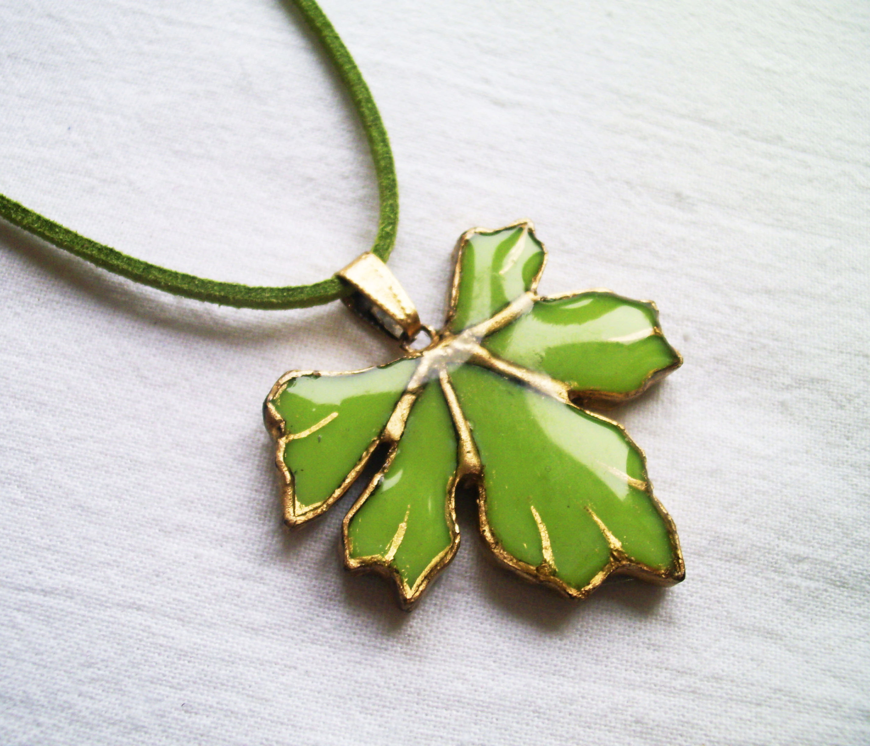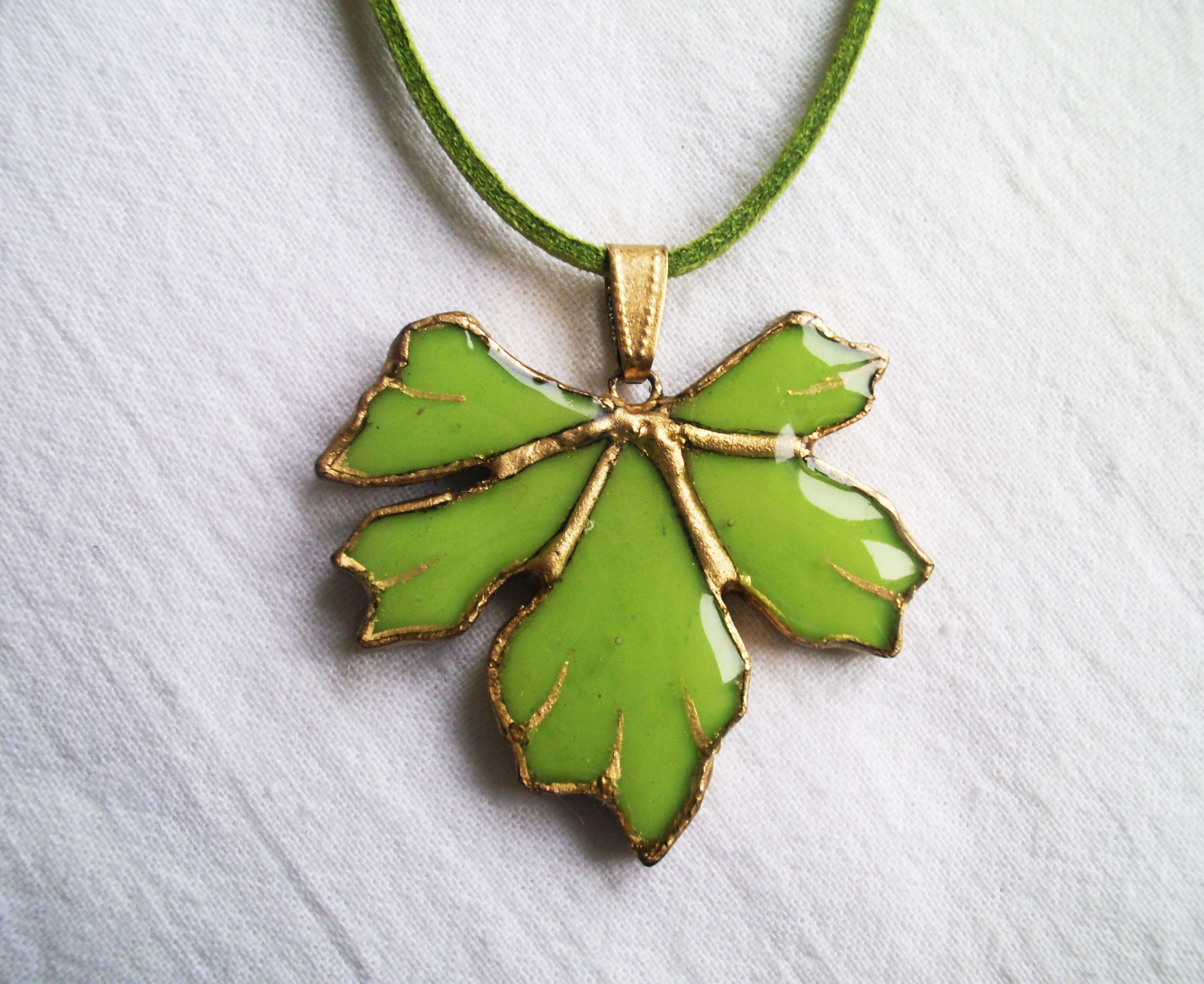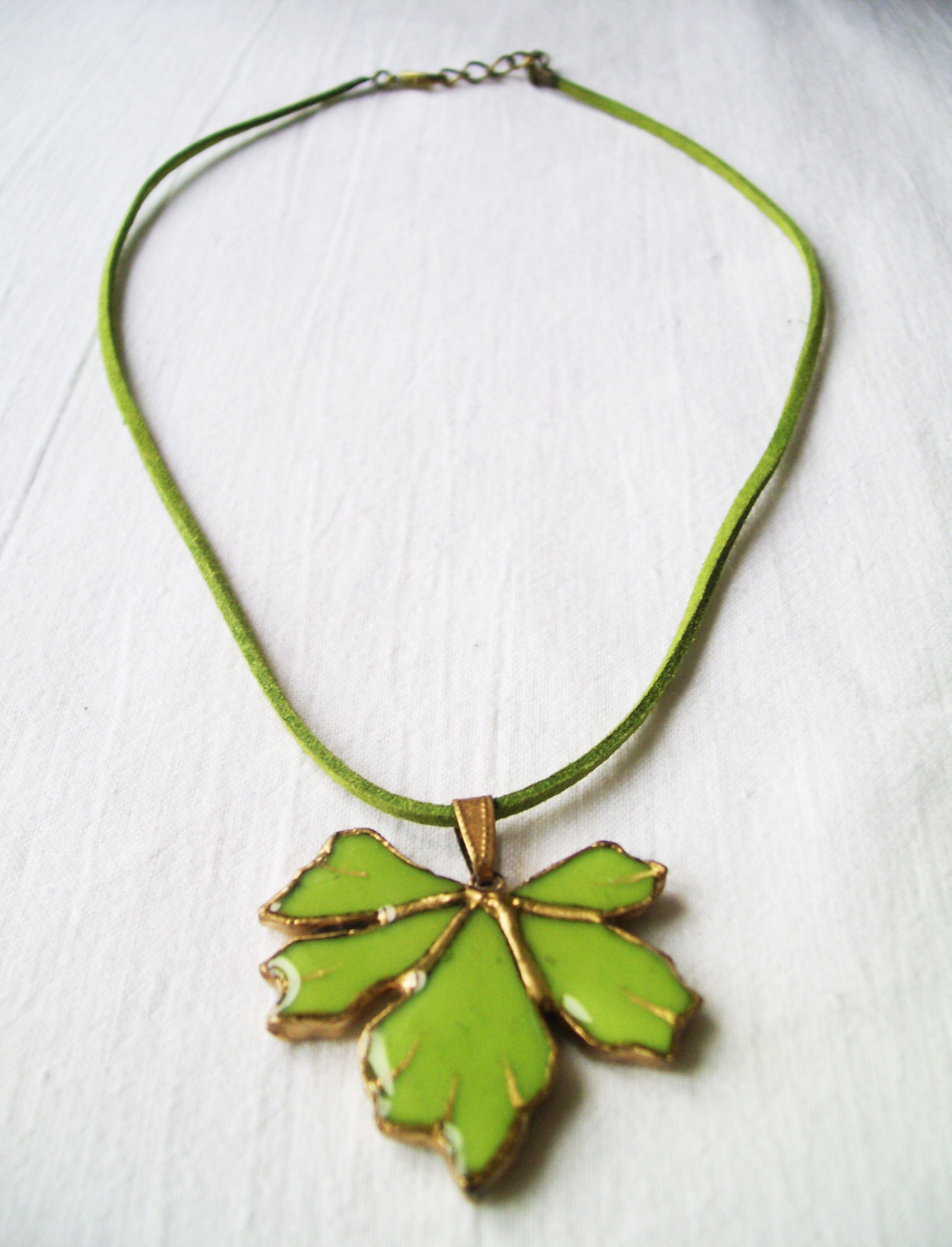 Meleg zöld árnyalatú, üvegből kifaragott juharlevél. Nagyon kellemes viselet és szinte bármihez felvehető. a természet üdeségét idézi egész évben és bárhová visszük, kellemes hangulatot kölcsönözhet viselőjének.