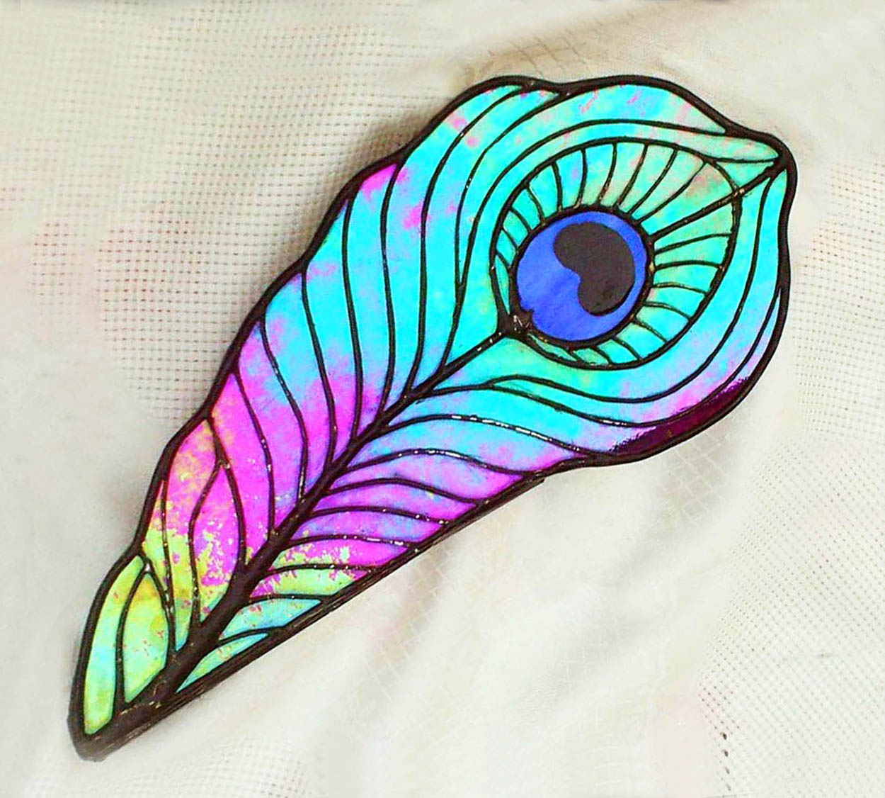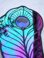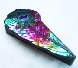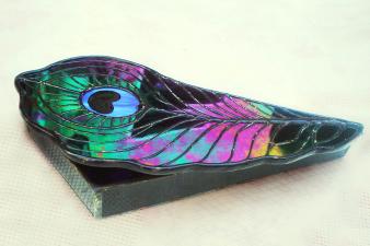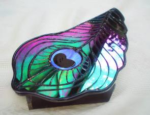 Varázslatosan színes és elegáns üvegkülönlegesség. Egyedi tervezés alapján kivételesen szép csillogó irizált üvegből készült kincses ládika, amely már önmagában is ékszernek minősül. A doboz alsó része kívül diszkrét fekete. Tökéletes pávatollformát alkot formál, közepén a jellegzetes kék pávaszemmel.