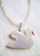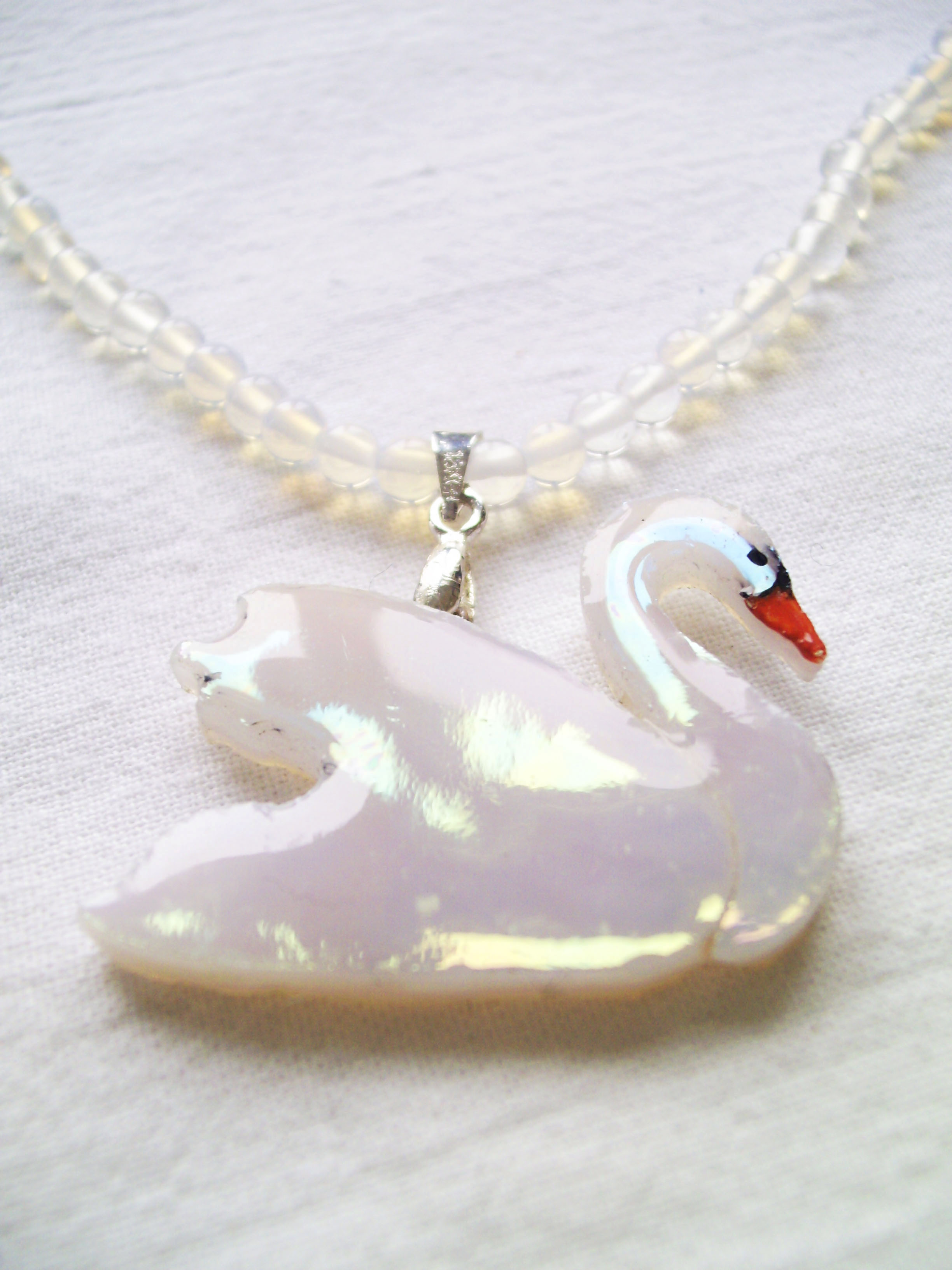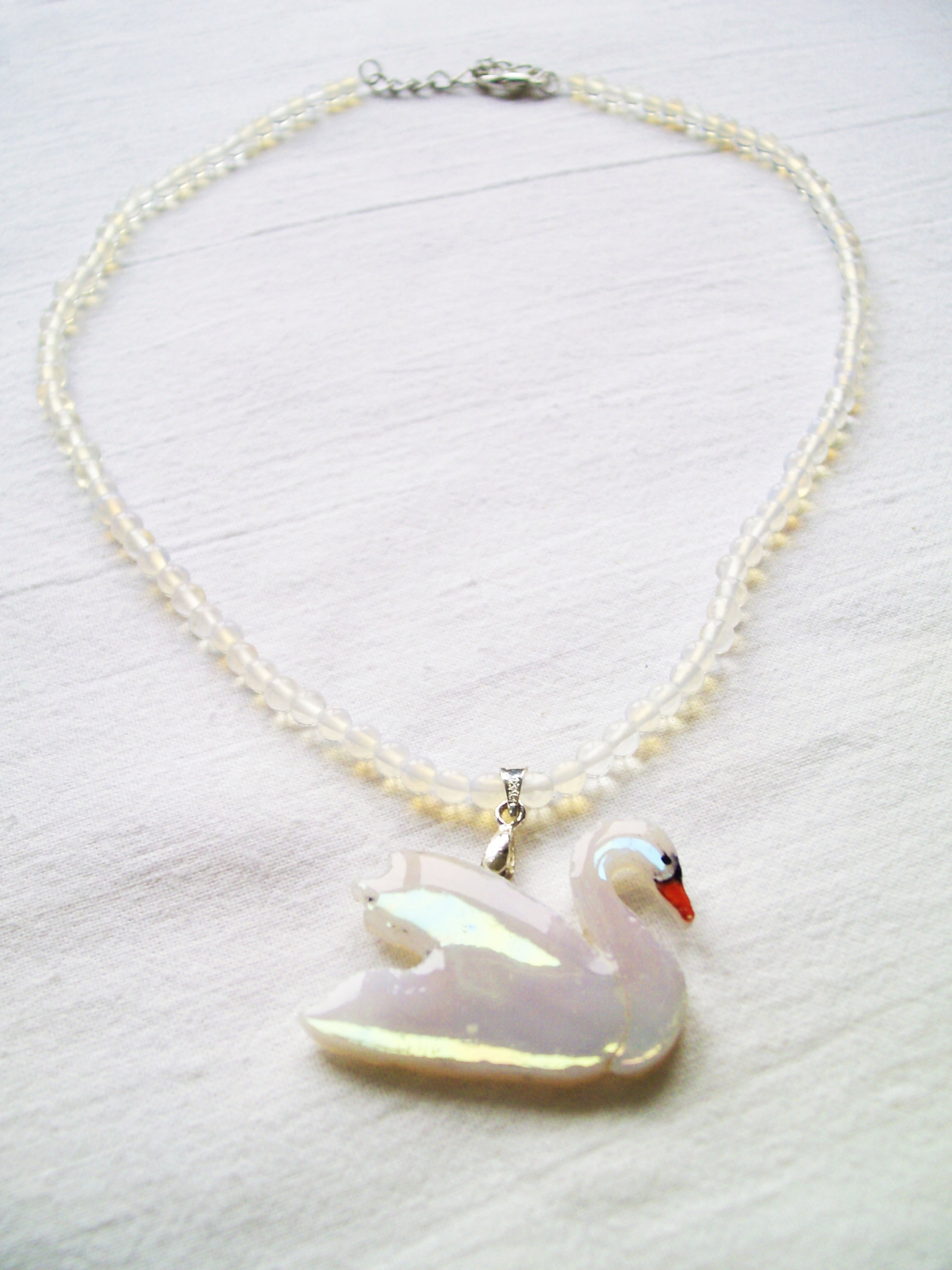 Gyönyörű elegáns, méltóságteljes fehér hattyú, irizált fehér színben ragyogó úszó tünemény, hozzá illő, valódi holdkő-opalit féldrágakő nyaklánccal.