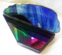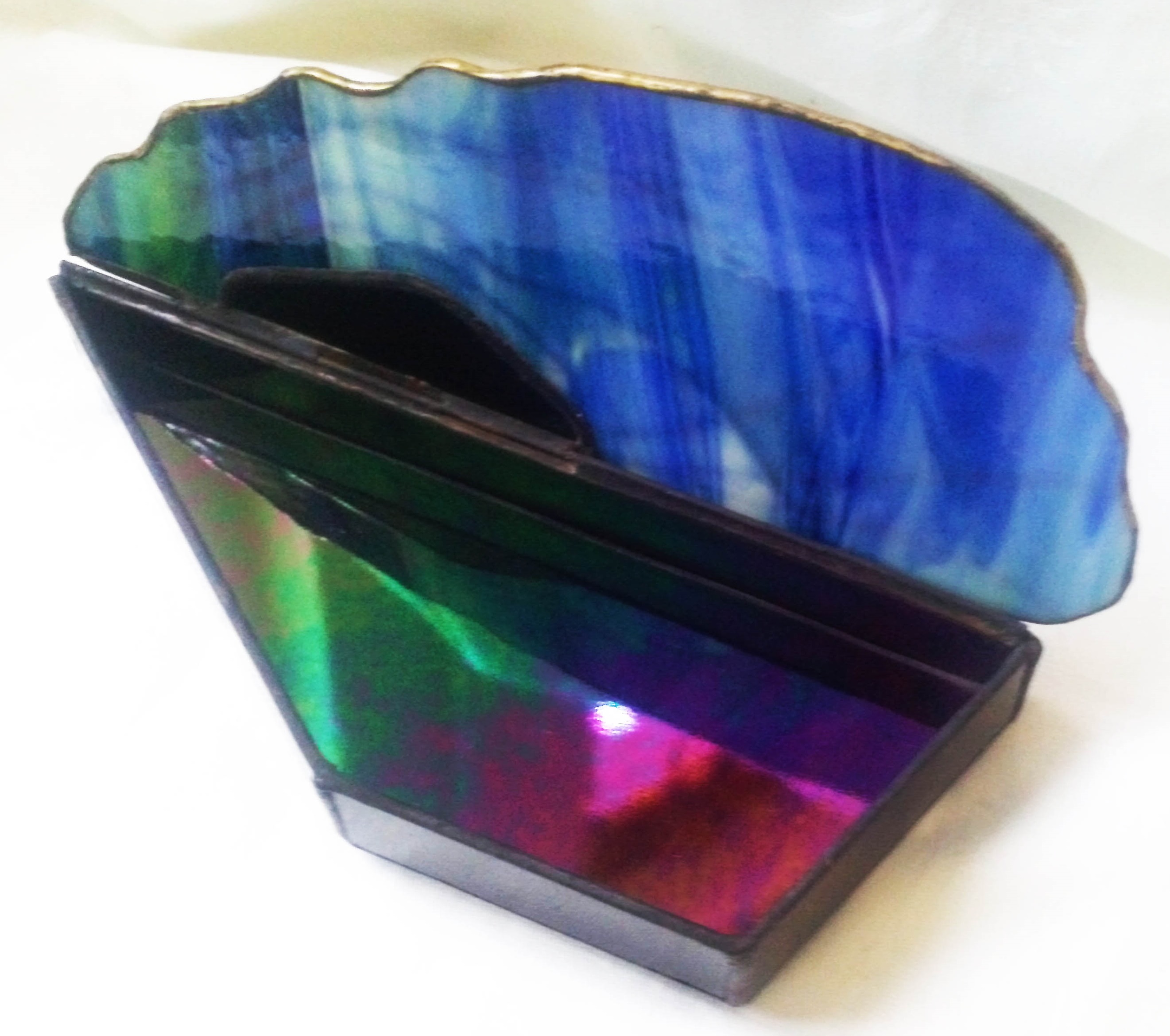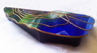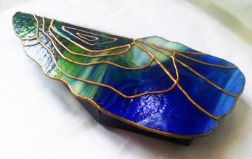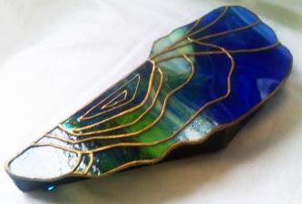 Az eredeti kéklagúna kagyló ékszerdoboz, mely csodálatos Uroboros üvegből készült, most újraihlette magát egy másik üvegből, Wissmach kék -zöld, melynél ügyeltem arra, hogy az eredeti formát megtartva hasonlóak legyenek a a színek is. Bár itt nem a türkiz dominál, sokkal inkább a zöld és a kobaltkék játéka és átmenetei, melyek az arannyal kombinálva teszik csodálatos színjátékossá ezt az exkluzív ékszerdobozt. Belső befogadó része irizált szivárványos üvegből készült, mely még nagyobb fényt kölcsönöz ennek a különleges és egyedi "bútordarabnak".