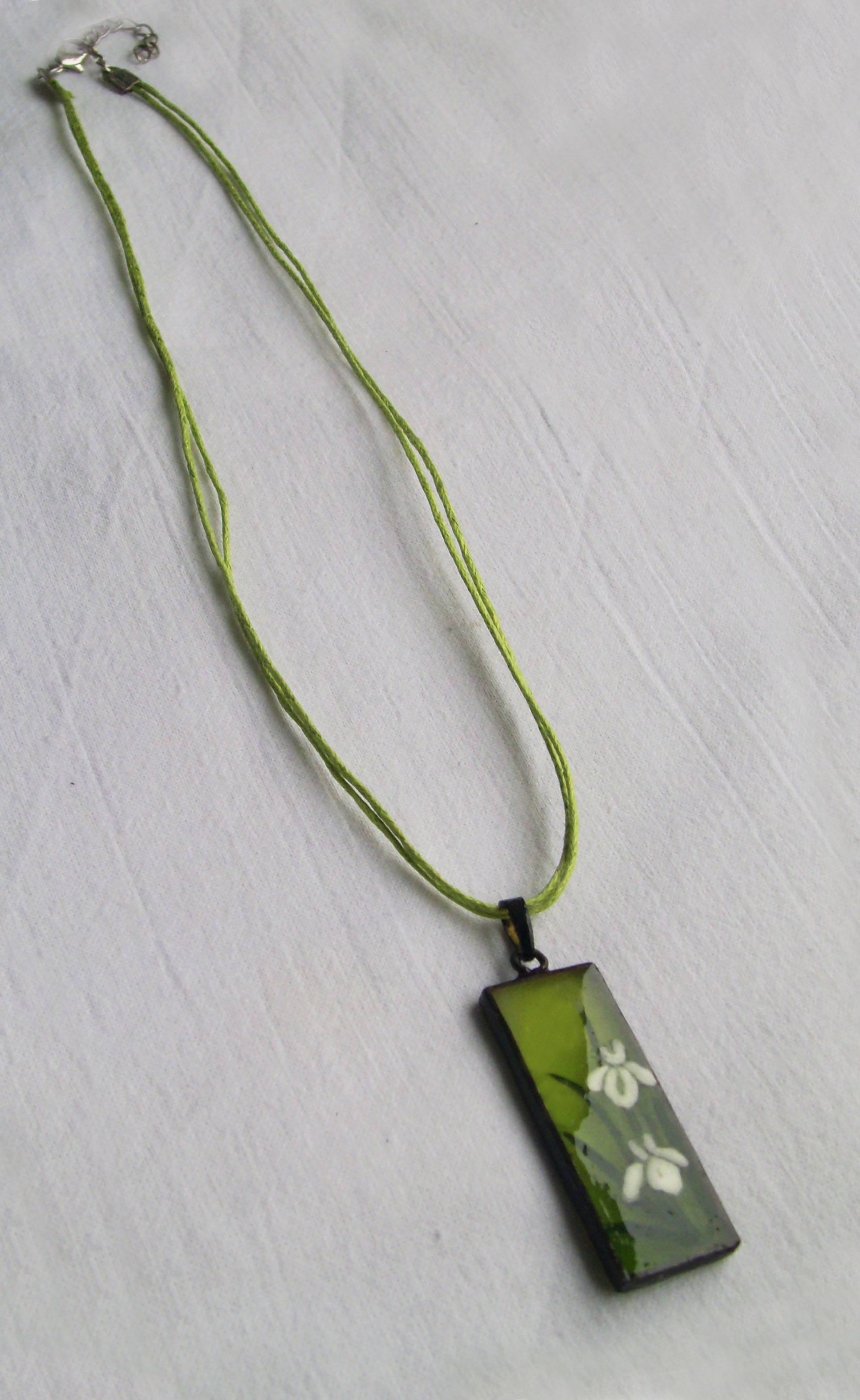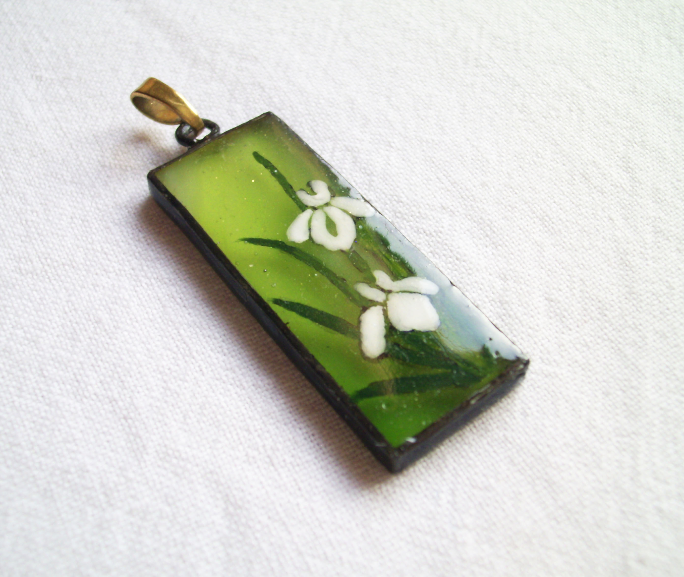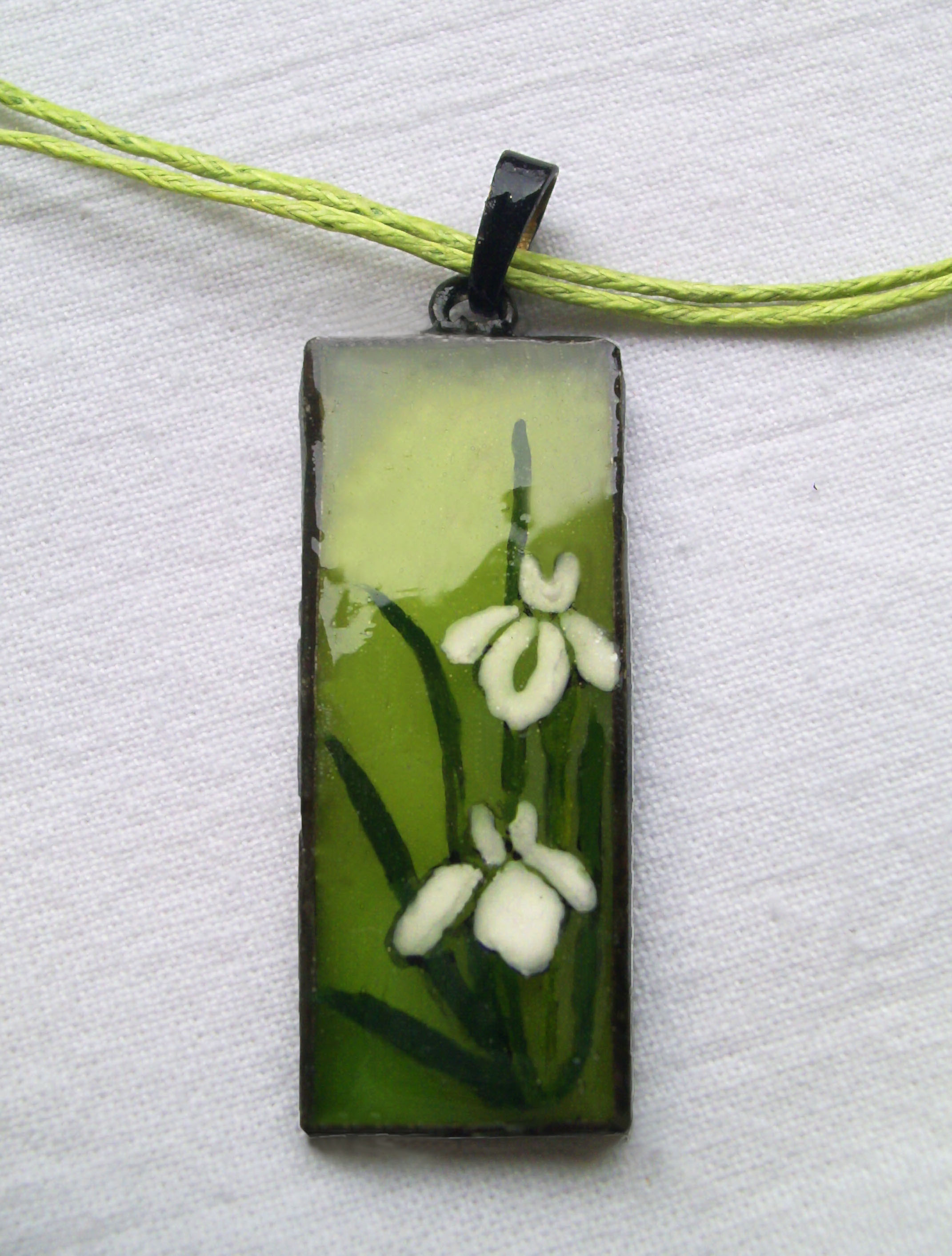 Kellemes, harmonikus zöld háttér-alapra hófehér íriszpárt festettem üvegfestékkel. A felső rétege 3D-s üveglakkal bevont, (a fotón láthatónál az életben domborúbb és csillogóbb). Kedves, bájos, kellemes viselet, hangulata fiatalos és nagyon nőies. Évszaktőól függetlenül viselhető, az örök tavaszt és napfényt idézi.