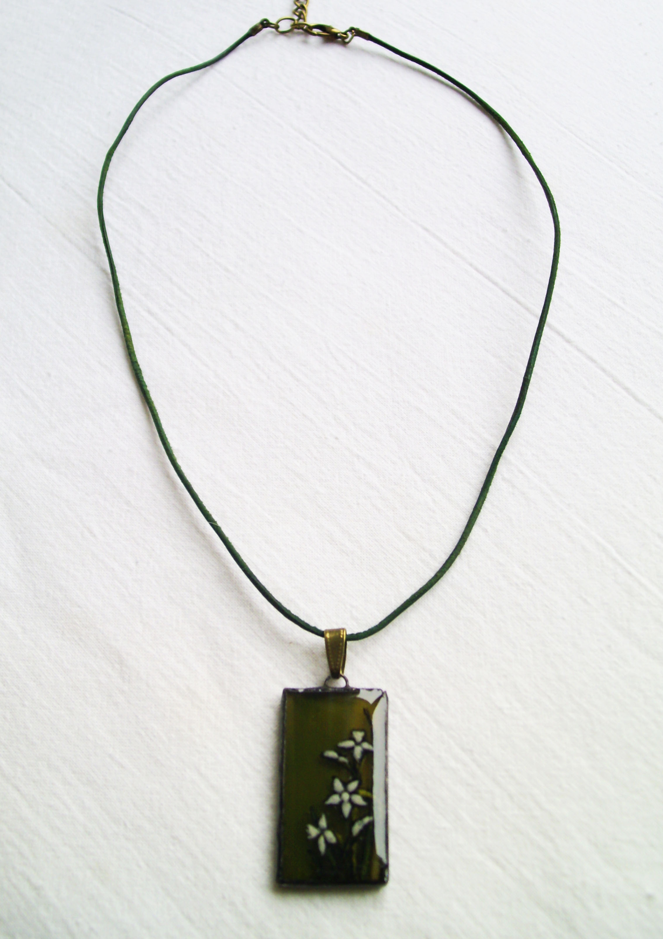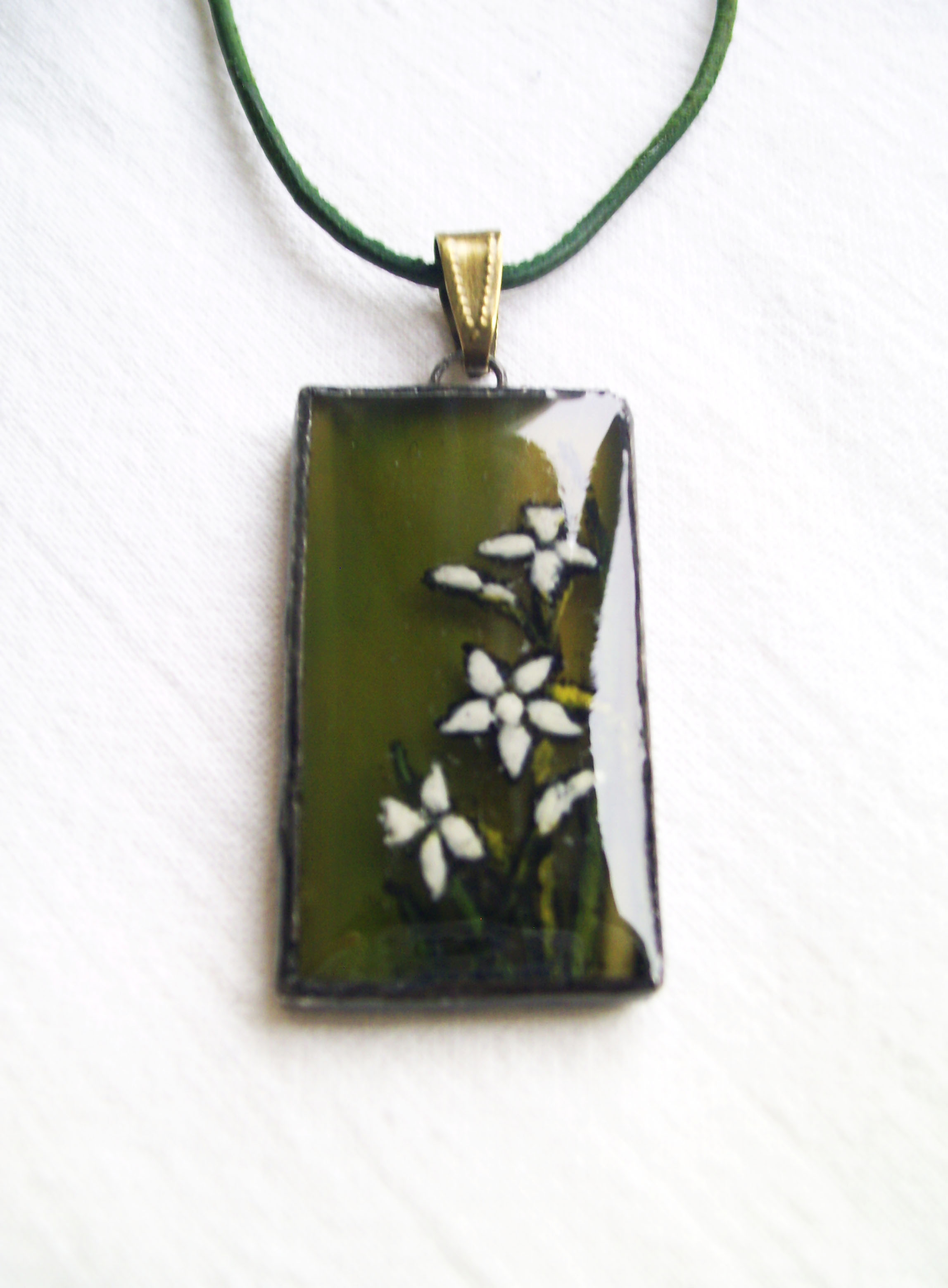 Minden részlete kézzel készített, saját tervezésű, időigényes aprólékos kivitelezésű munka. Üvegből faragtam ki, csiszoltam, befoglaltam, kézzel festettem, 2-3x lakoztam, a ráfordított energiával együtt sok szív is van benne.