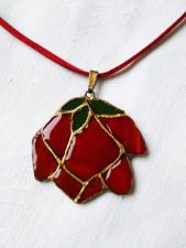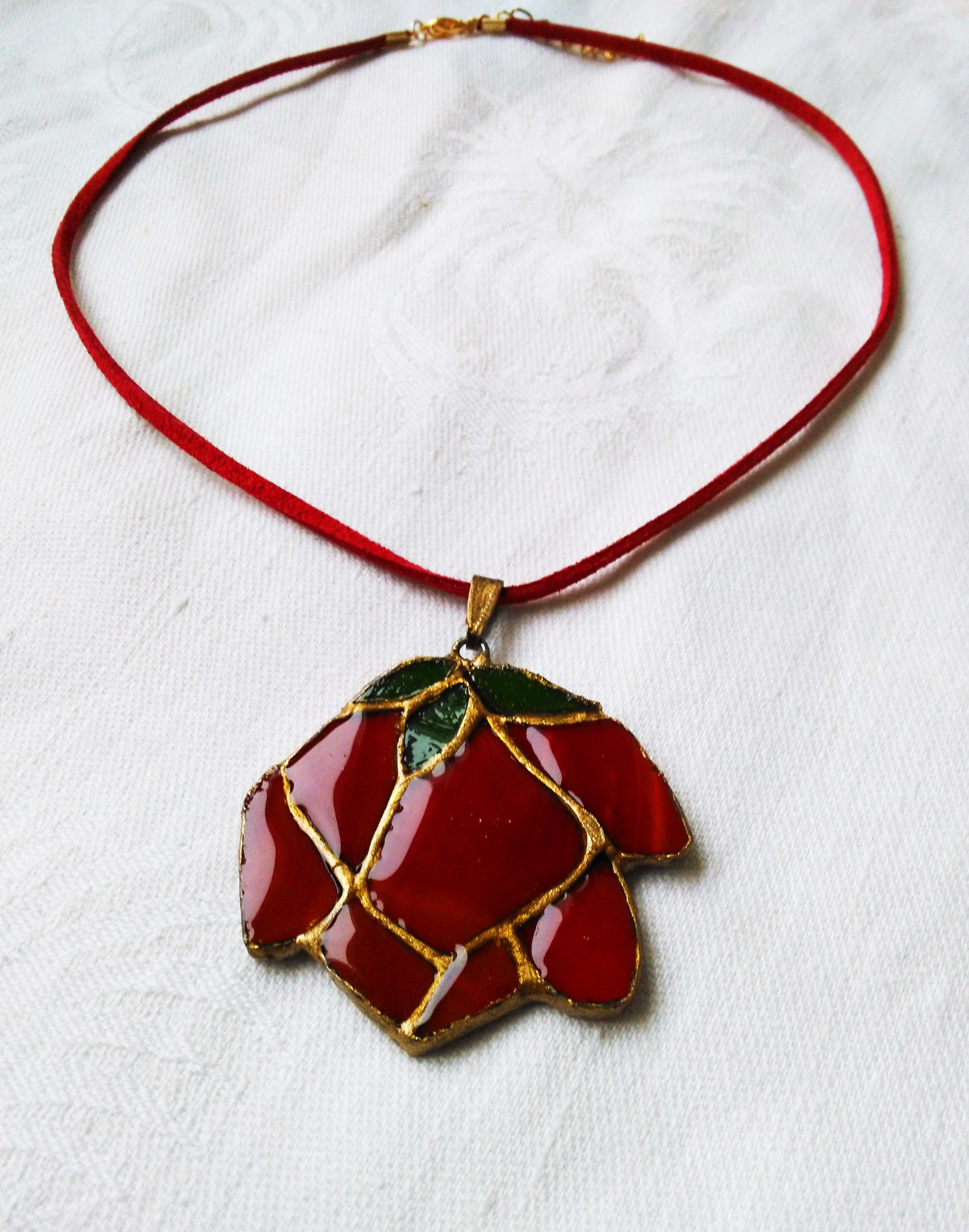 Élénkpiros Fusing üveget tiffany technikával rózsa formára alakítottam, a széleit arannyal festettem meg, (de ez el is hagyható róla). A képen még nincs rajta a 3D-s üveglakk, csak egy sima lakkozás, de később ez is rákerült ettől szép domborúak lettek a szirmok (csak itt ost nem látszik)