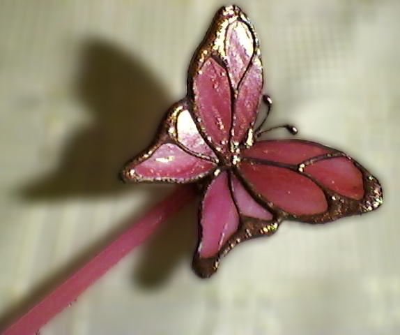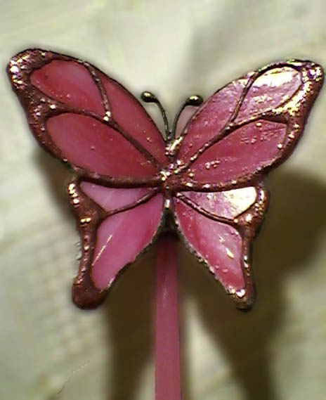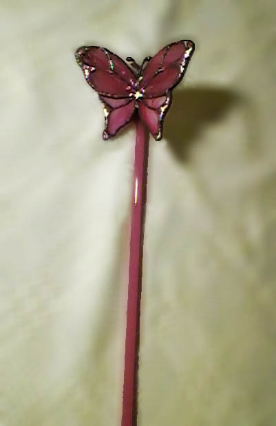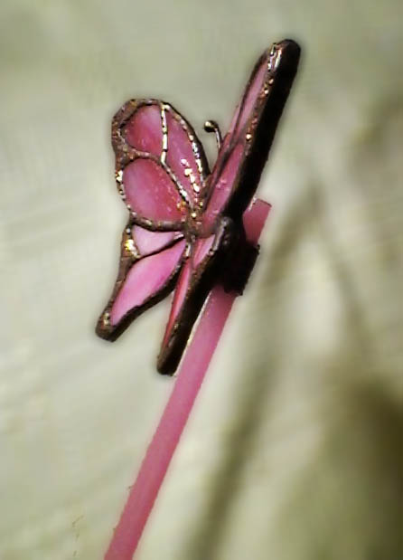 Üvegpálca végén ülő rózsaszín pillangó. Beleszúrhatjuk egy növény vagy csokor virág mellé, de akasztani is lehet damilra, ez esetben az ablakunkban vagy a plafonon röpdösnek szabadon. Kis Csillogással is megspékeltem