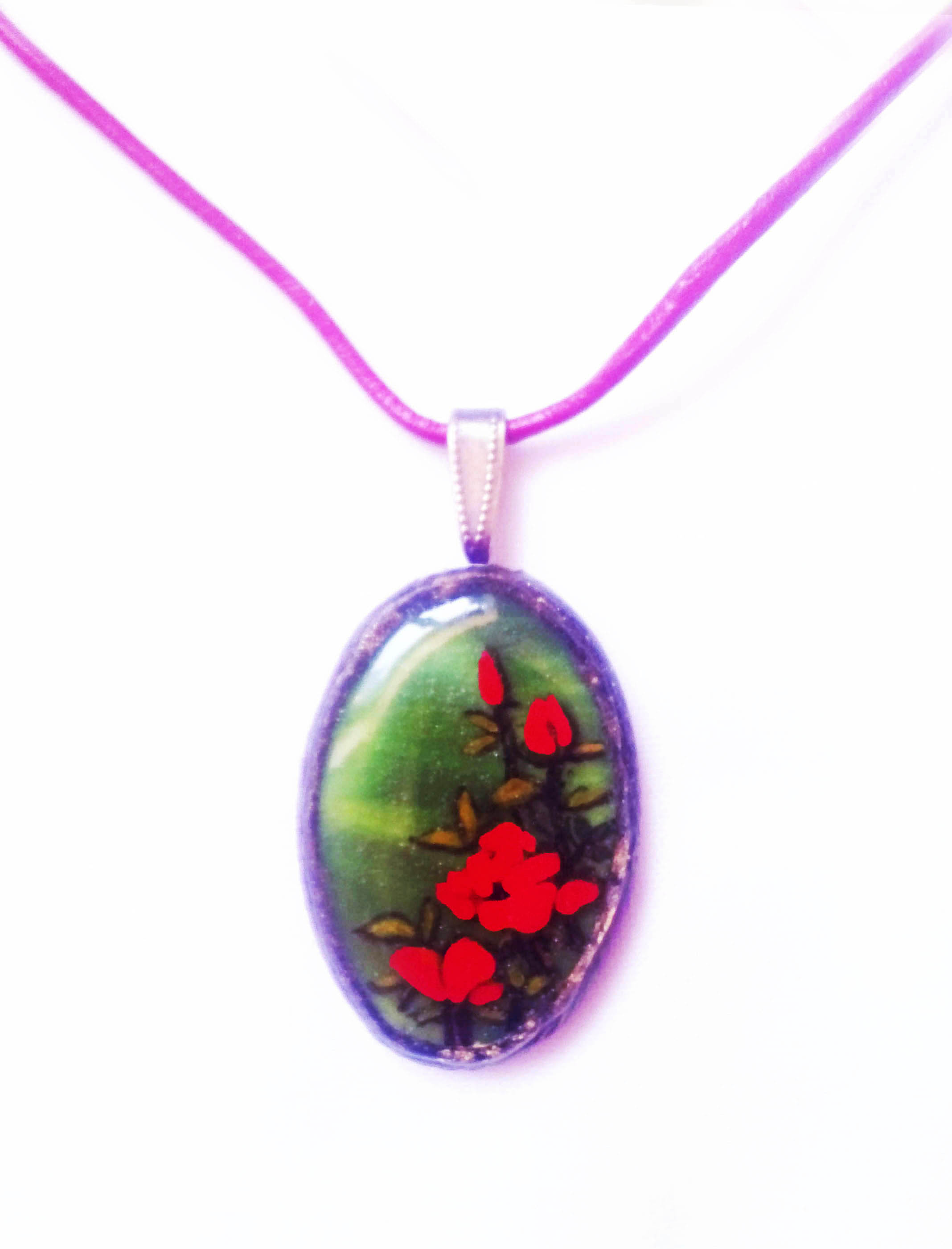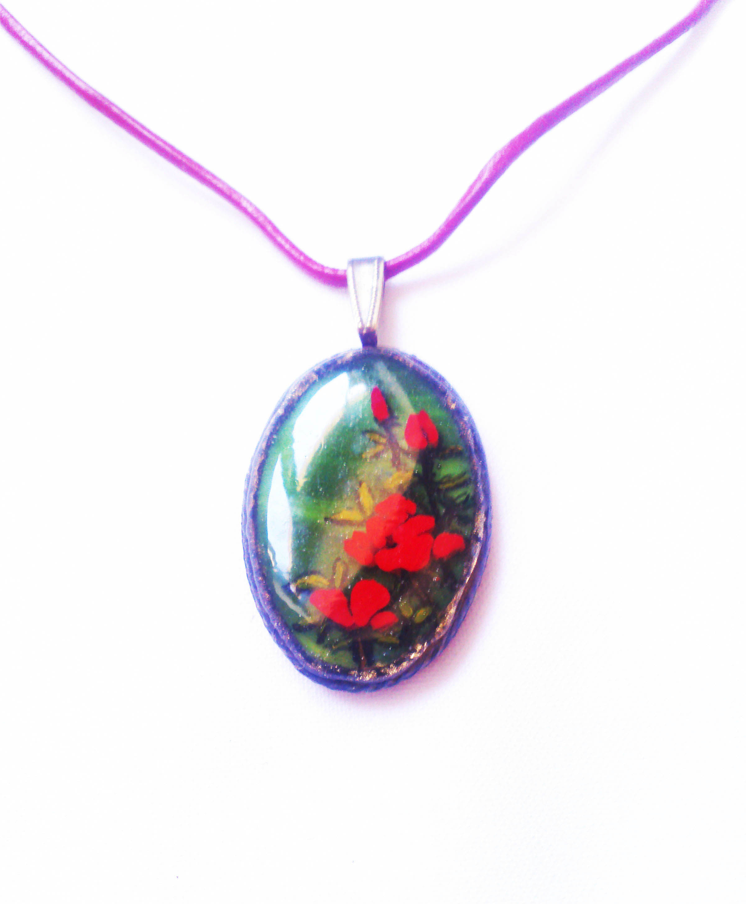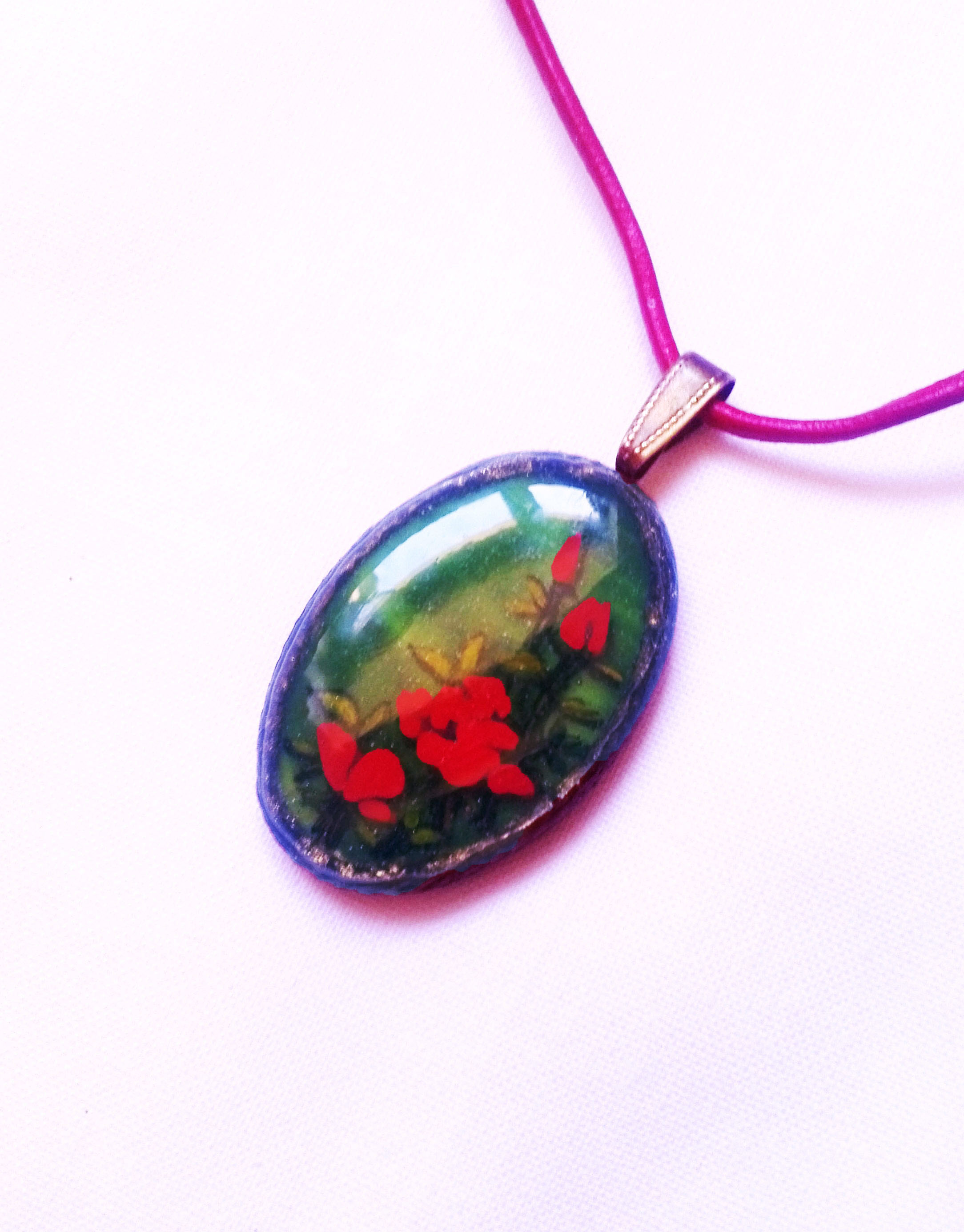 Aprólékos, finom kivitelezésű munka. Az alap zöld üveget oválisra csiszolom, szélére drót sodronyt forrasztok díszítésnek, majd kézzel ráfestem a miniatűr képet, többször lakkozom: szintén 3D-s üveglakkal. Több napig készül, szárad, újrafestem, újralakkozom... így kapom meg ezt a végeredményt.