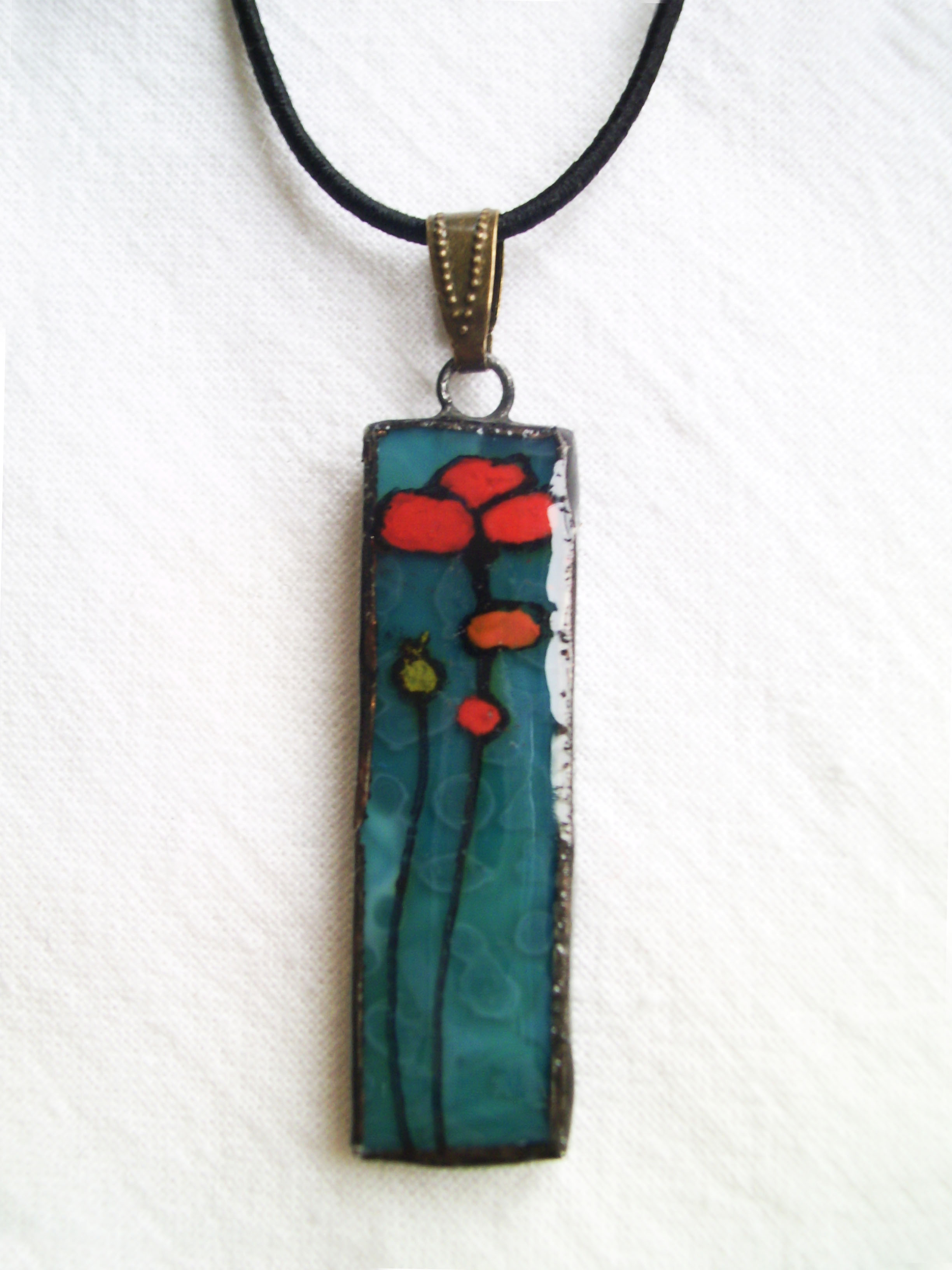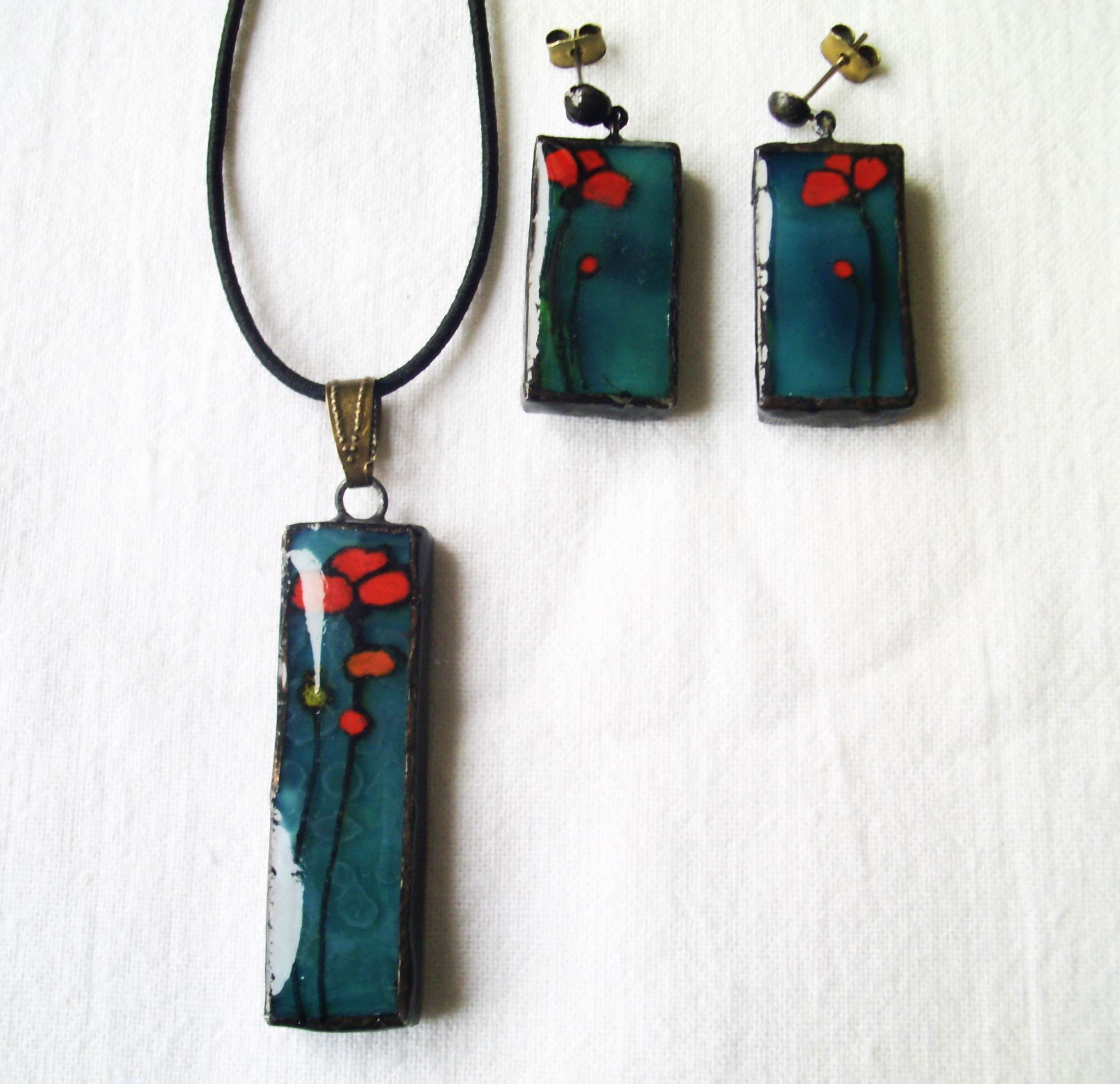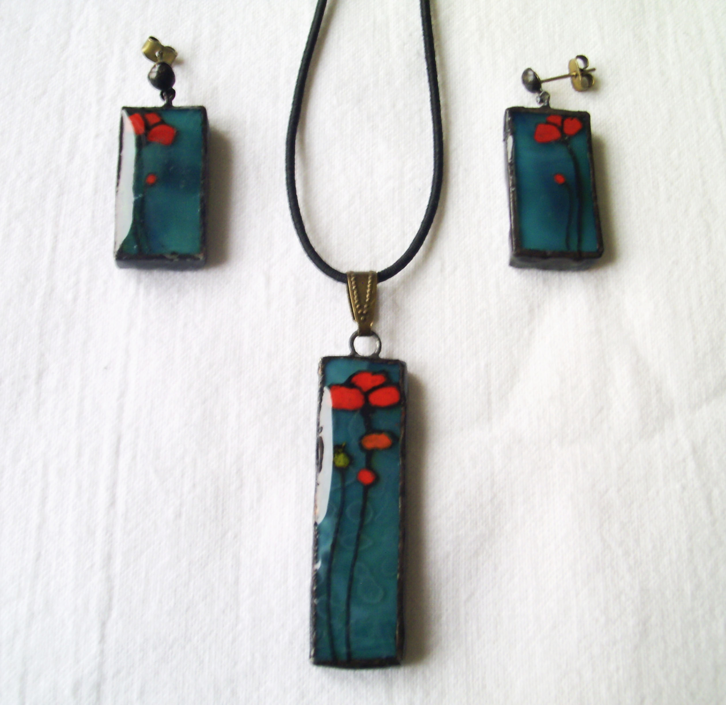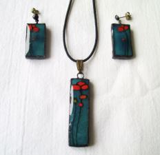 Türkizes mélykék alapüvegre virítóan piros pipacsok kerültek.