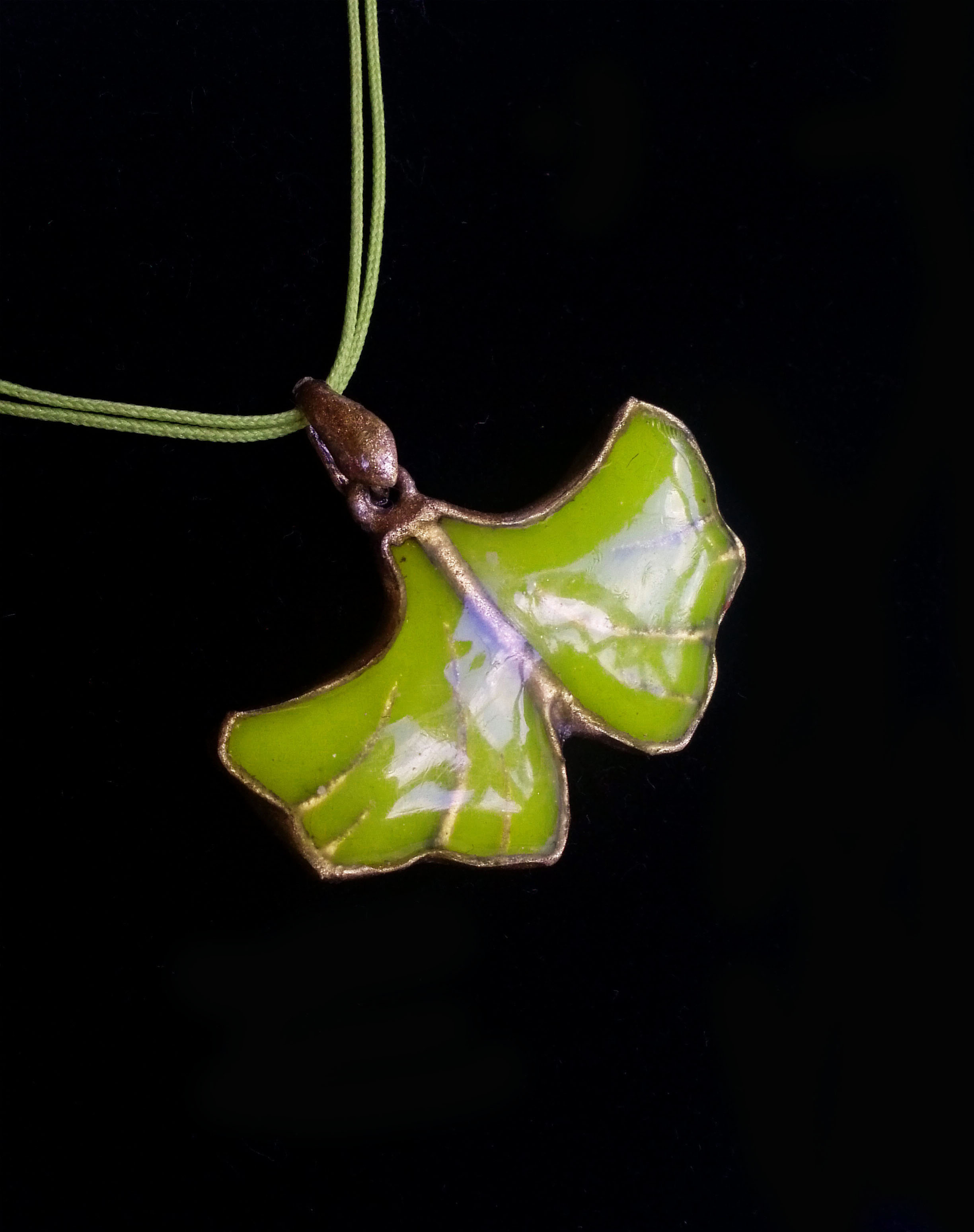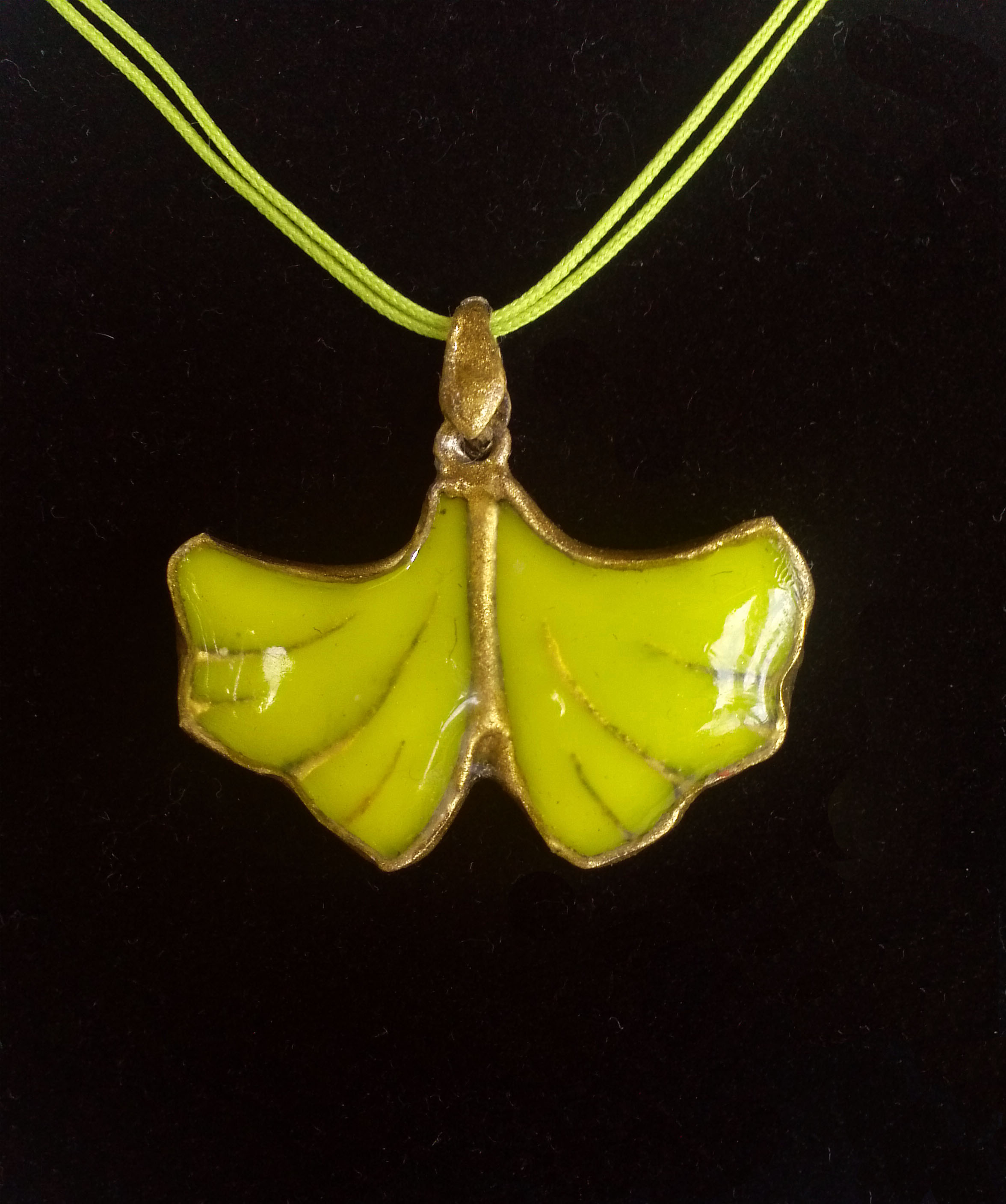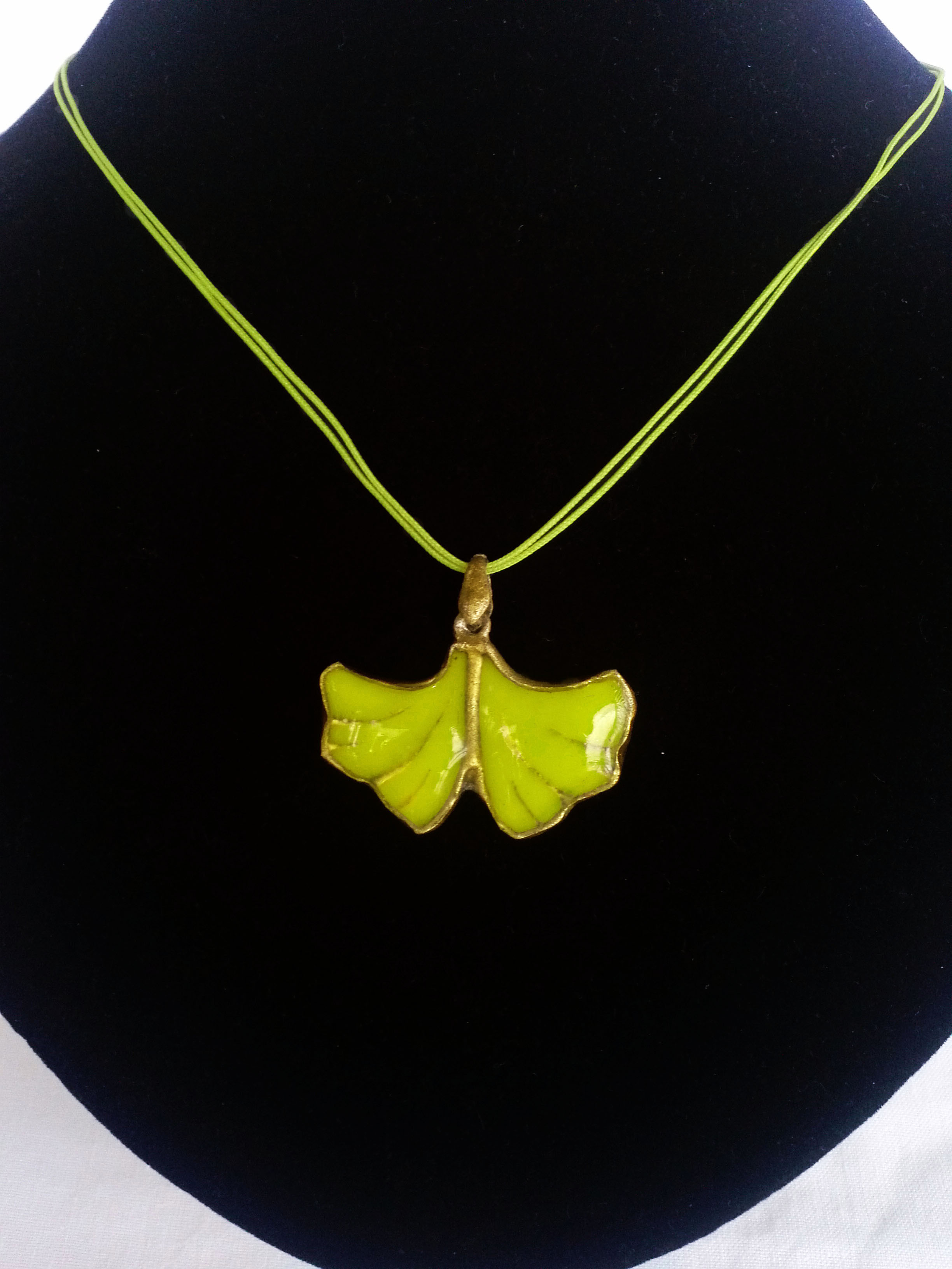 Egy csodaszép Ginkgo levél domborúra lakkozott felülettel, szép ívvel illeszkedik a nyakba, Különleges viselet, életteli színvilág