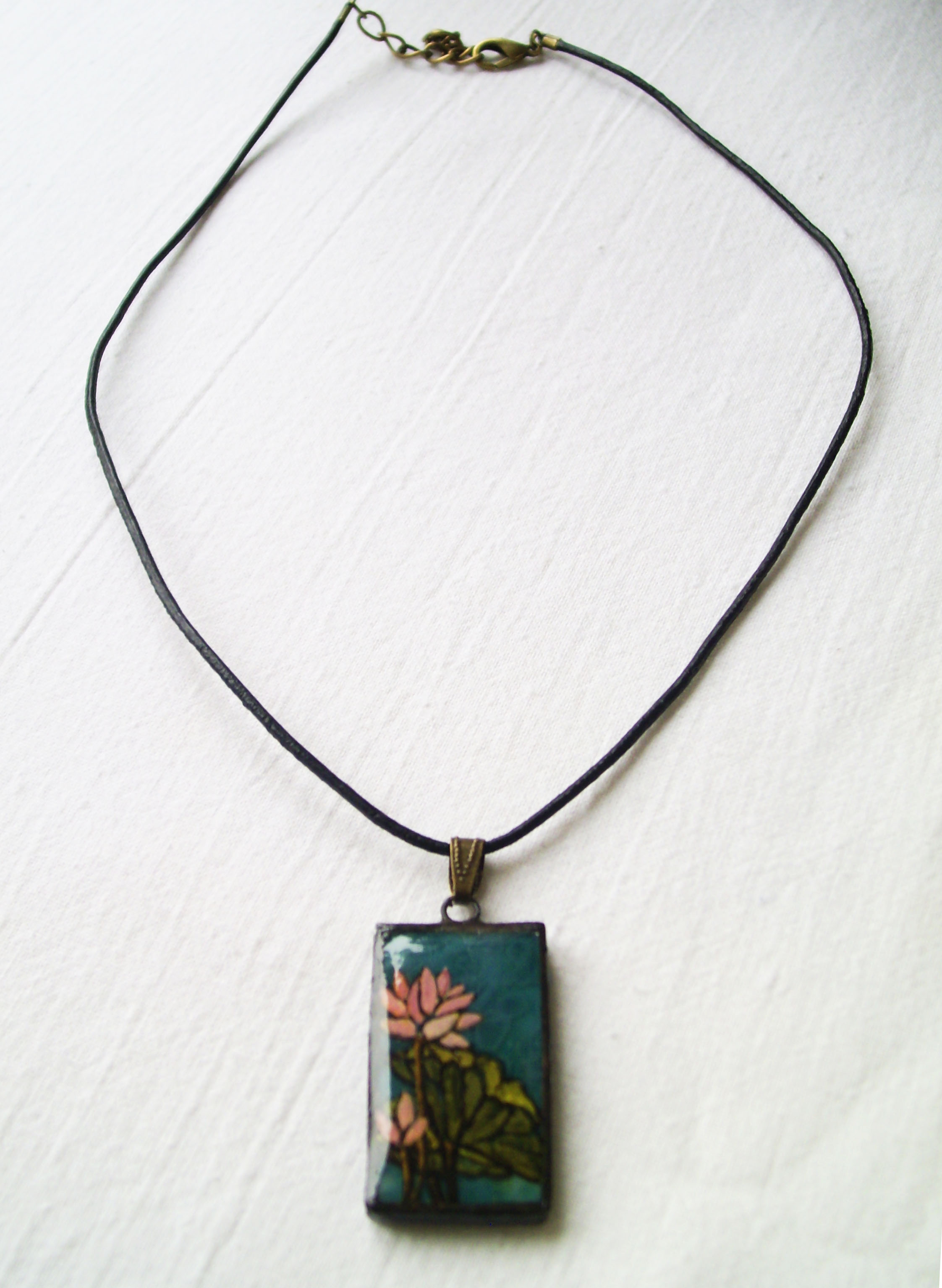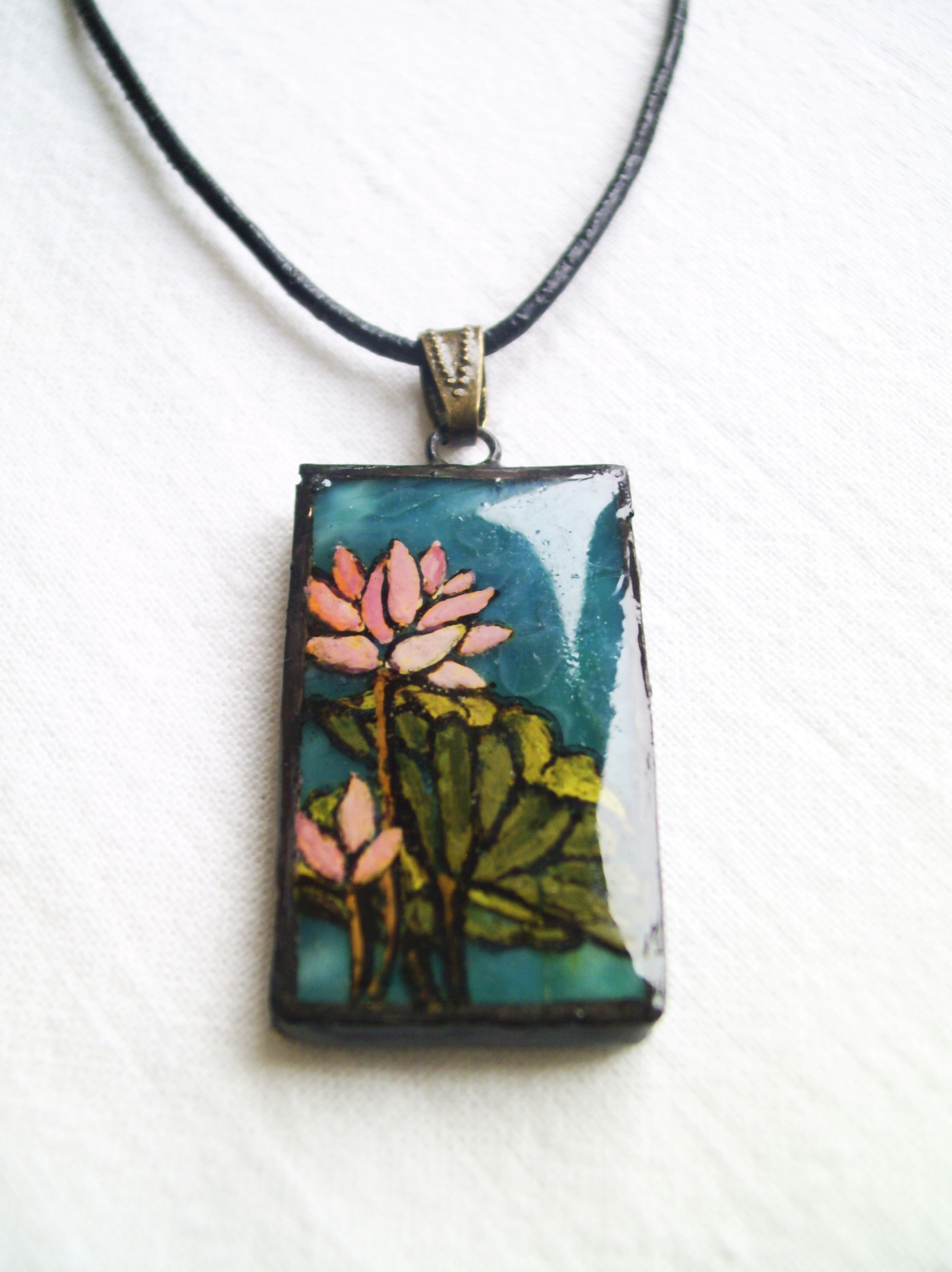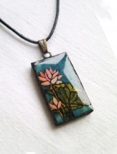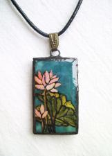 A lótusz mindig szimbolikus, kibomlást, kiteljesedést és tökéletességet jelképez. Virágai és levelei élethűek, csodaszép kék üveg háttéralapra van ráfestve.
