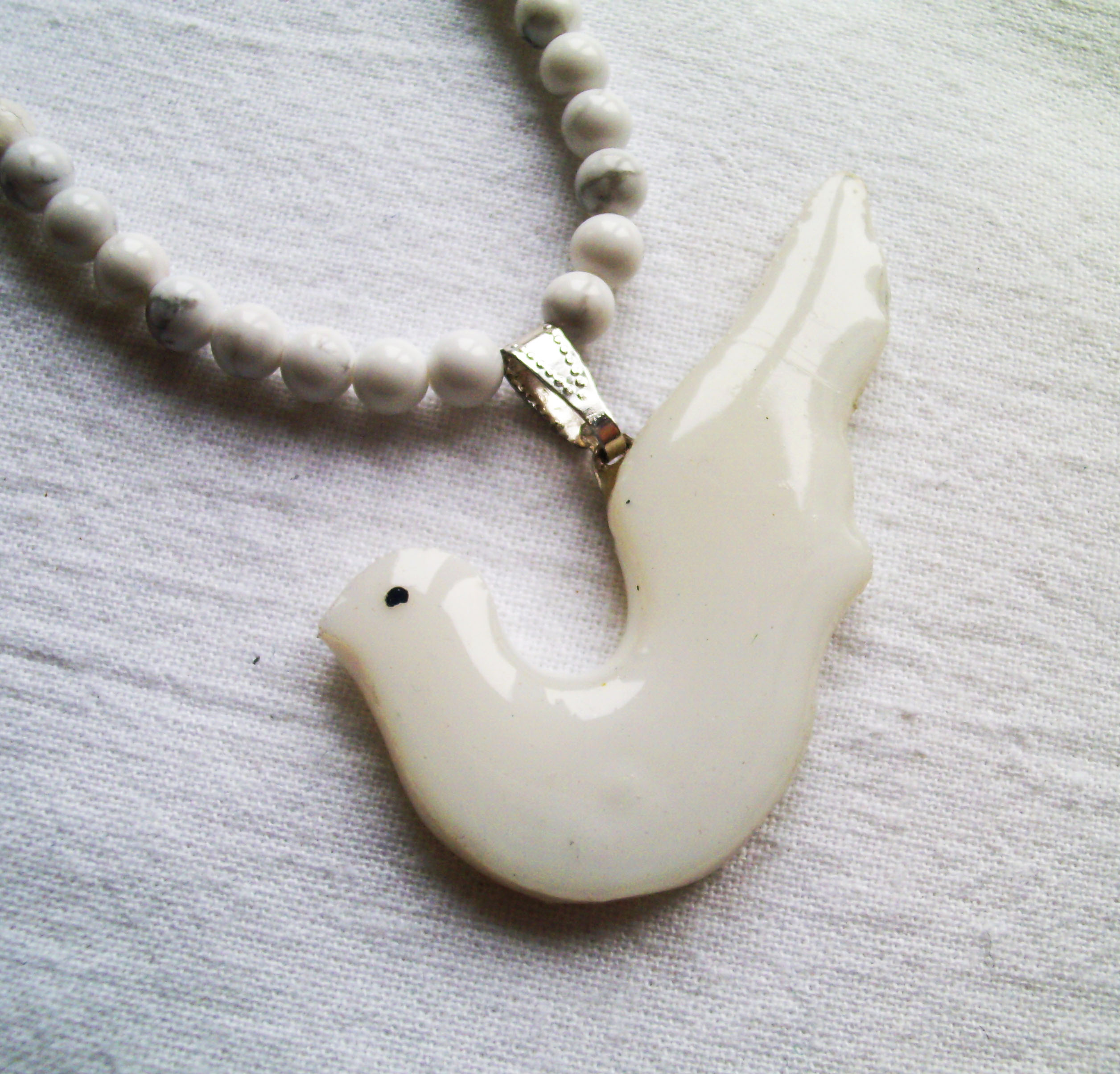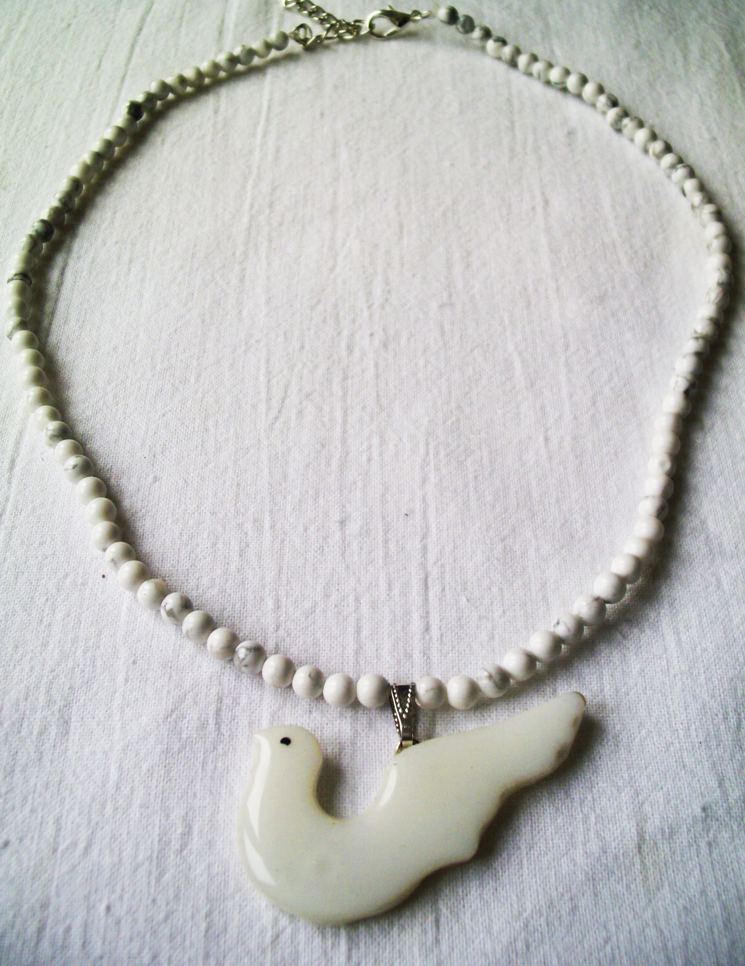 Hófehér üvegből készítettem egy stilizált formájú galambot. Nagyon finom kivitelezésű akár romantikus akár trendi viseletnek, de különösen szép szimbólum is a fehér galamb. Nyakláncként Howlit féldrágakő gyöngyfüzért választottam, így a medál és a nyaklánc egymás szépségét erősítik.