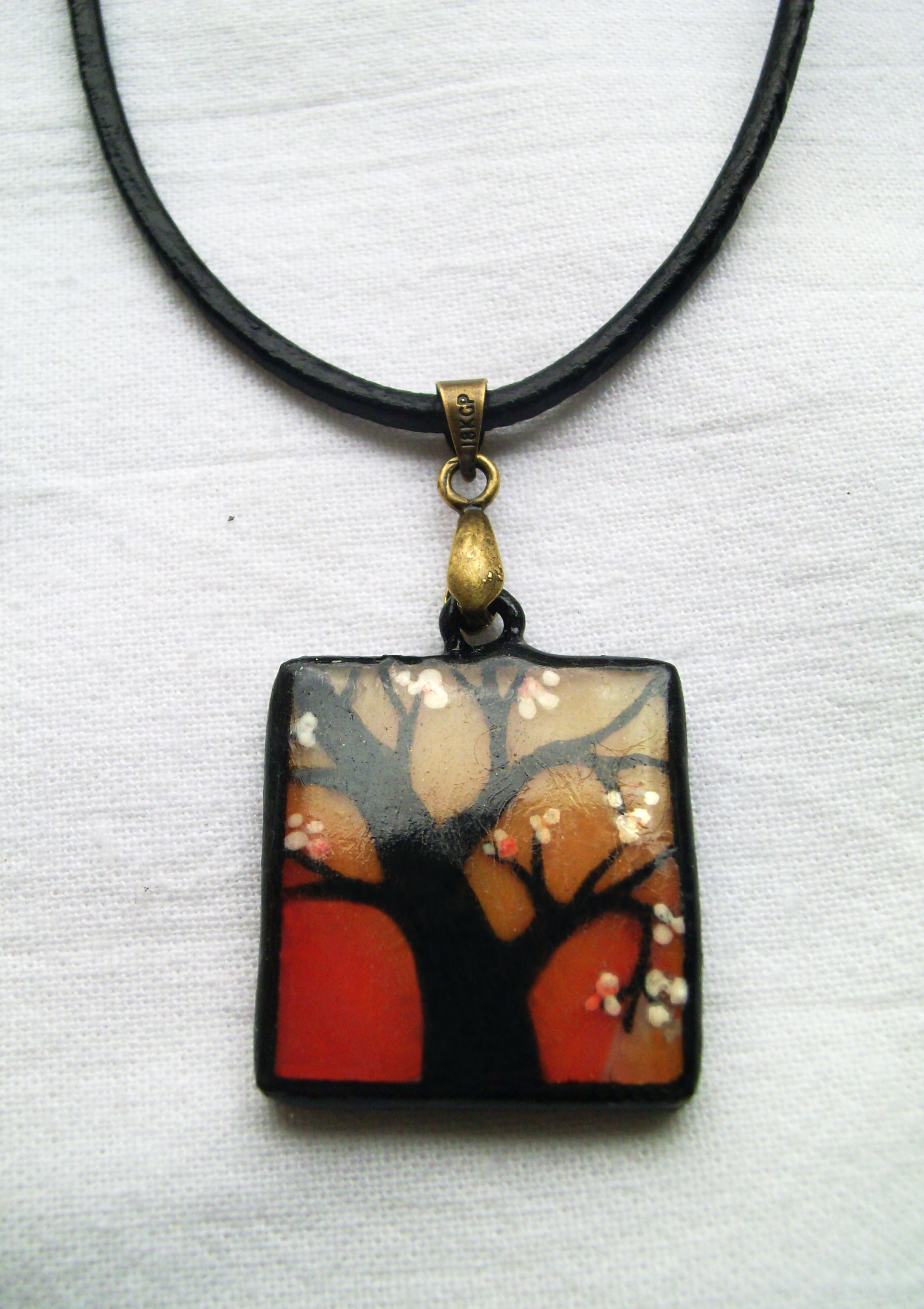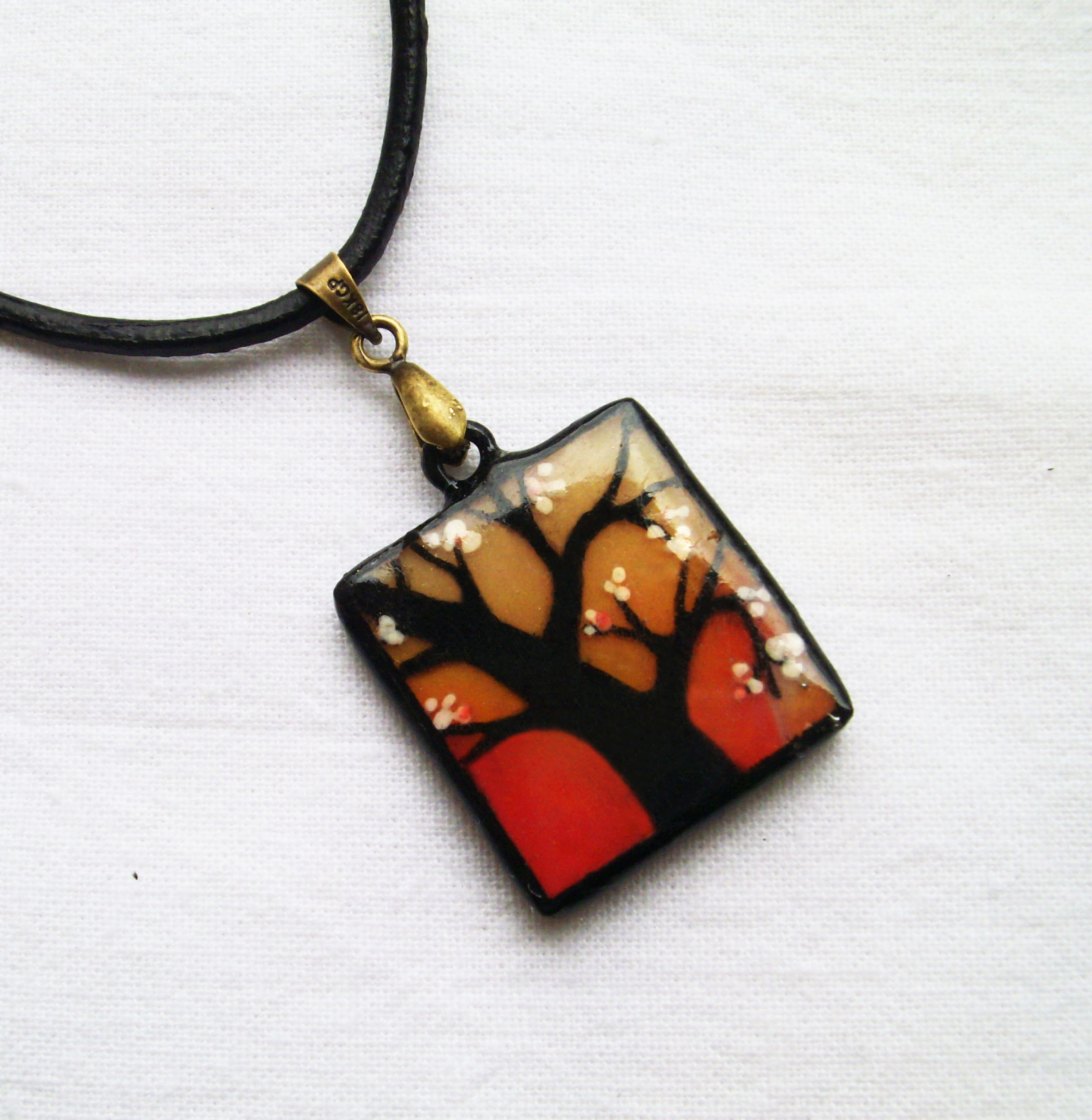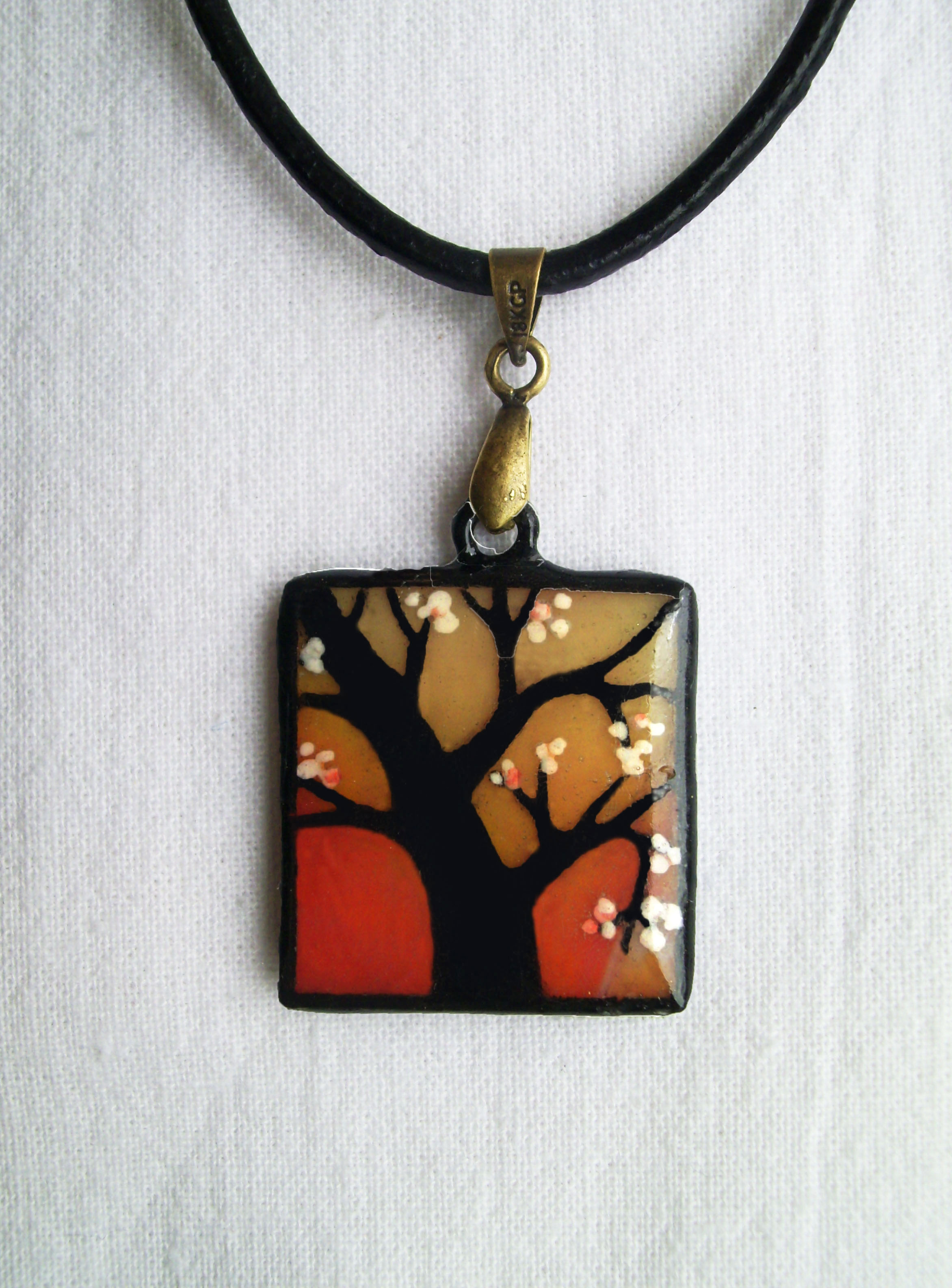 Az alapüvegnek egy színátmenetes meleg árnyalatú narancsot választottam, erre festettem rá ezt a pompás, hajladozó ágú, virágzó fát.