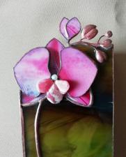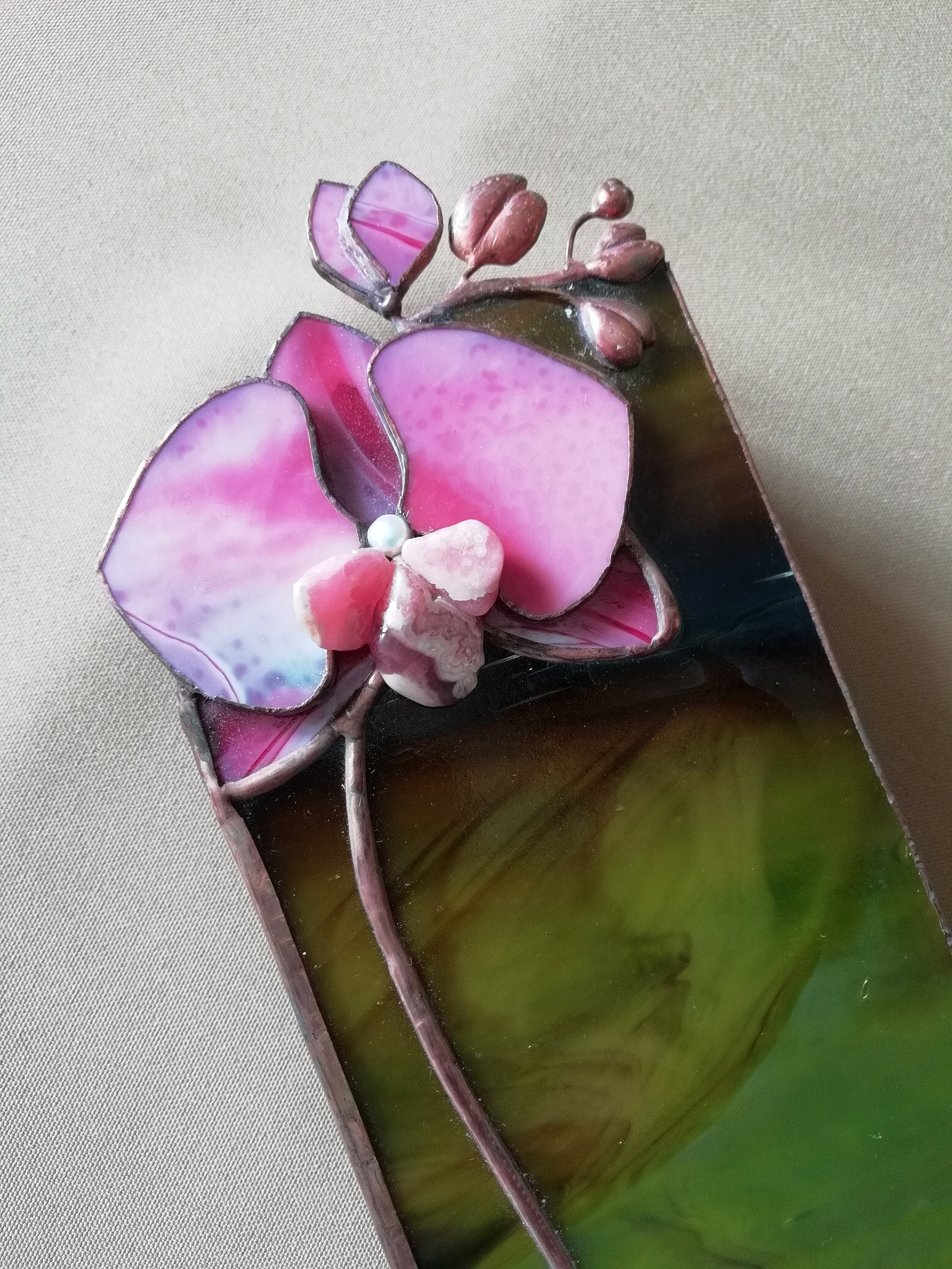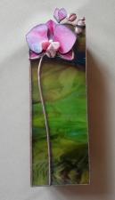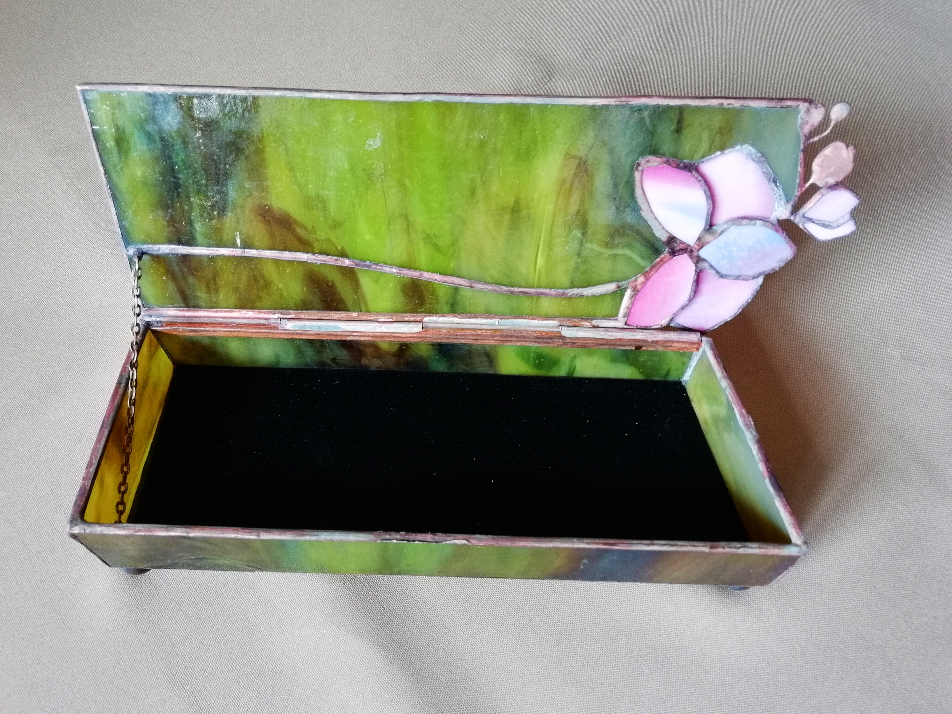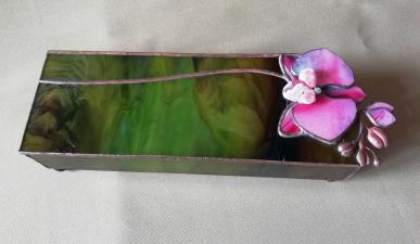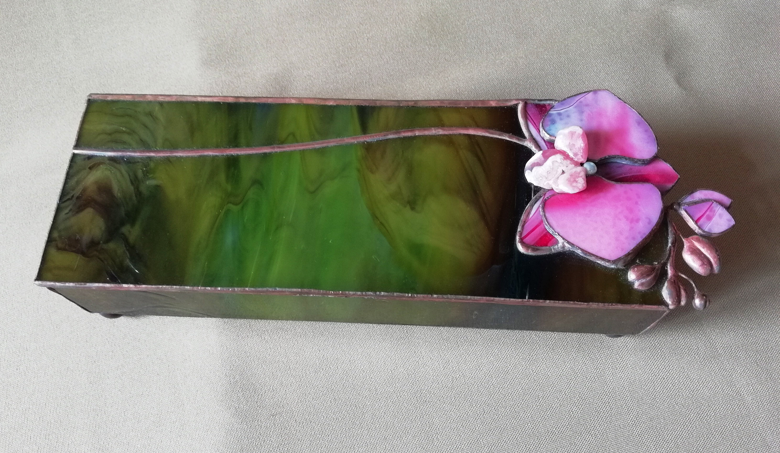 Filigrán kivitelezésű, fényűző, sziporkázóan színes üvegkülönlegesség. A Lilás-rózsaszínes árnyalatú üveg, melyből a virágfej készült remekül kiegészíti és kontrasztossá teszi az olajzöld alapot, mely a doboz testét alkotja. A virág bibéje rodokrozit féldrágakőből vannak, közepe tenyésztett gyöngy, lábai csiszolt sárkányachátok. A virágbimbók igazi kis ékszerek, aprólékosak, finoman kidolgozottak. Réz színű patinával, zöld bársony belsővel, fedelet tartó lánccal elegáns megjelenésű, értékes ékszerek vagy értékek tárolására egyaránt alkalmas.