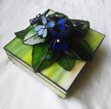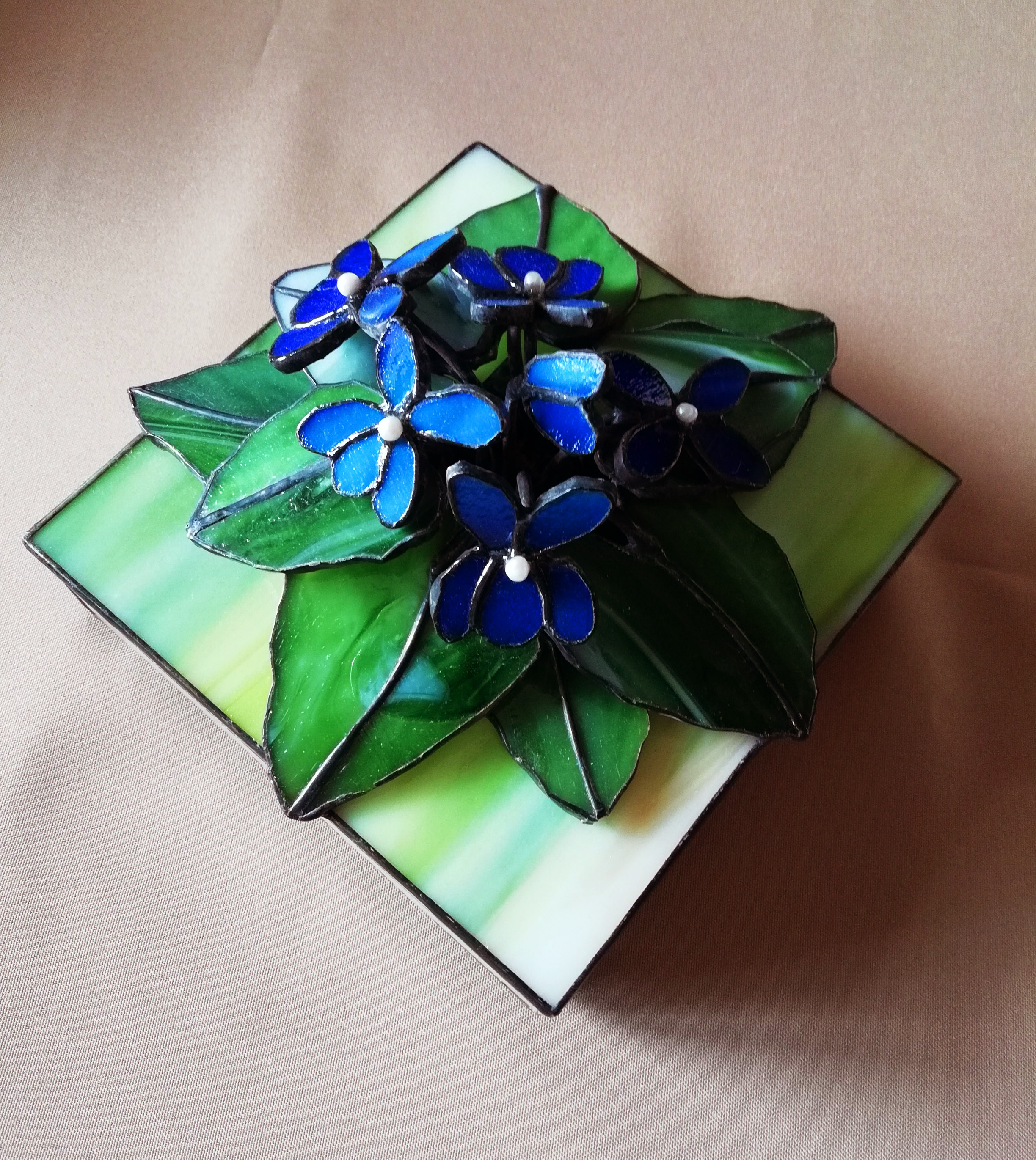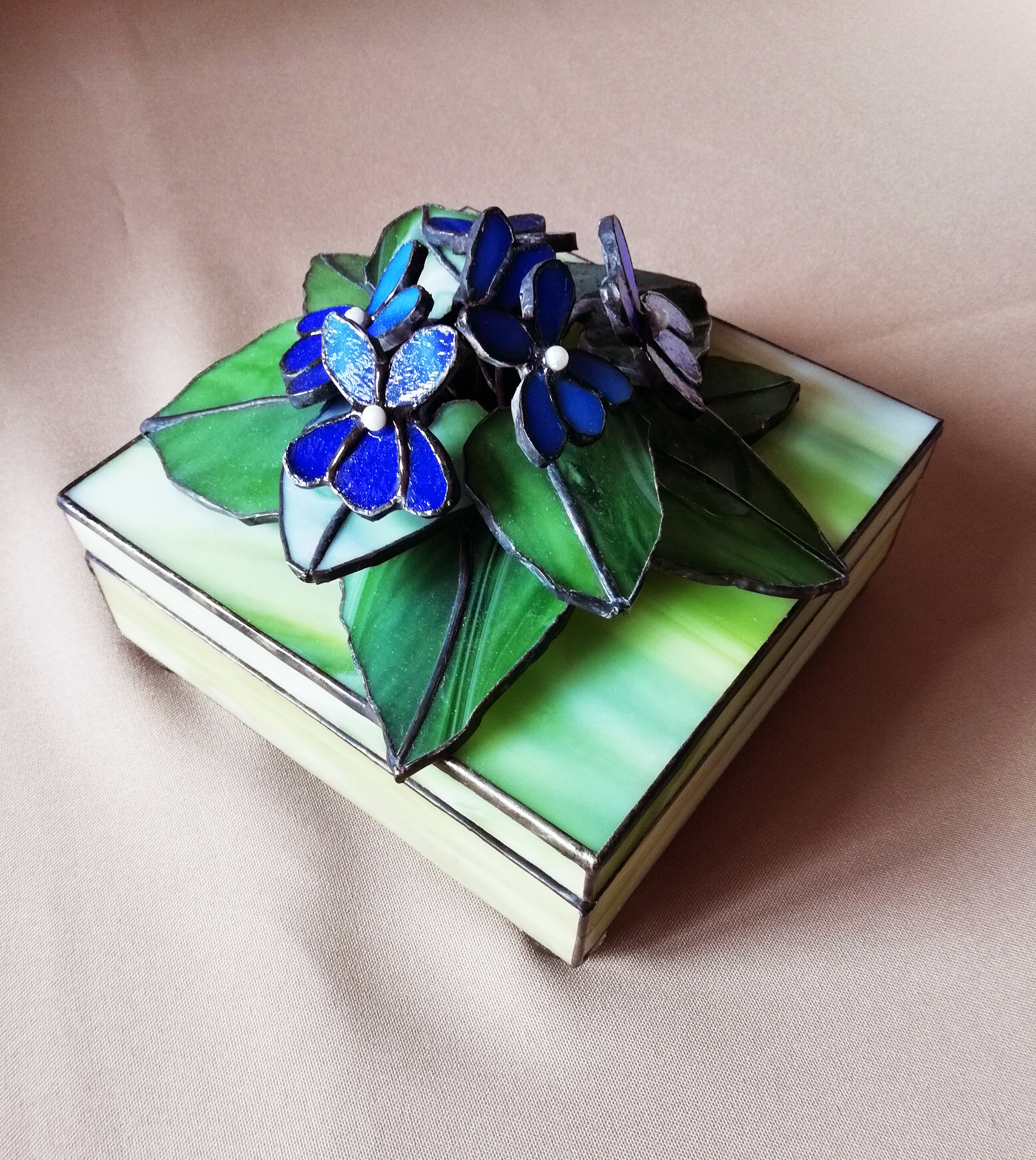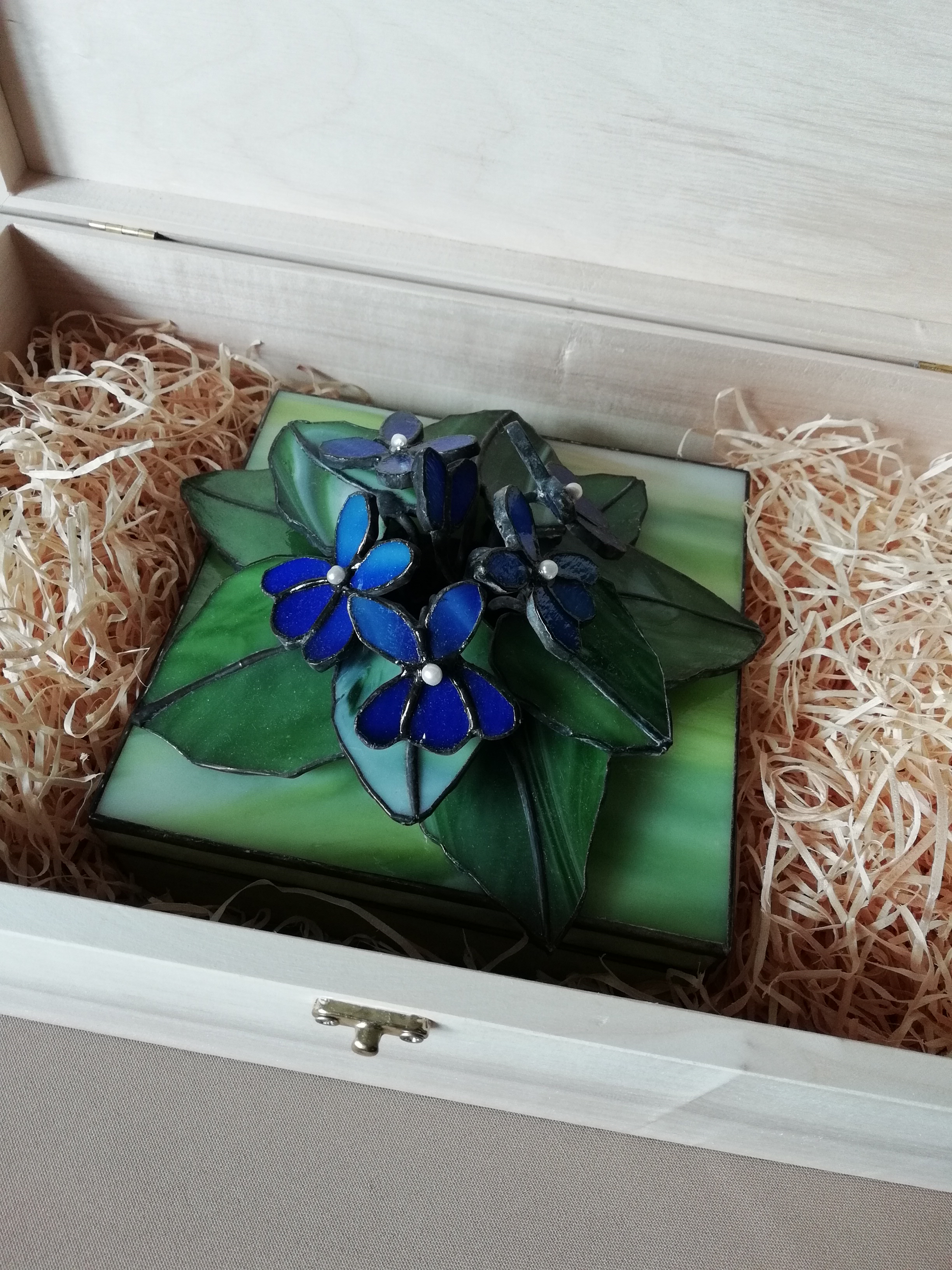 Valódi, 3 dimenziós ibolyacsomócska telepedett ennek a doboznak a fedelébe. Élénk kék virágfejek, tenyésztett gyöngy virágközép, olajzöld levelek, világoszöld doboztest, bársony belső, üveggyöngy lábak, belső fedéltartó lánc. Kedves értékes "örökzöld" üvegkülönlegesség, mely minden korban és minden időben szép és ízléses marad, divattól, trendtől független. Minden korosztály részére kitűnő ajándék, ékszereink méltó tárolására alkalmas iparművészeti alkotás. Stella Perle-logós fa-díszdoboz jár hozzá, így igazán exkluzív ajándék.
