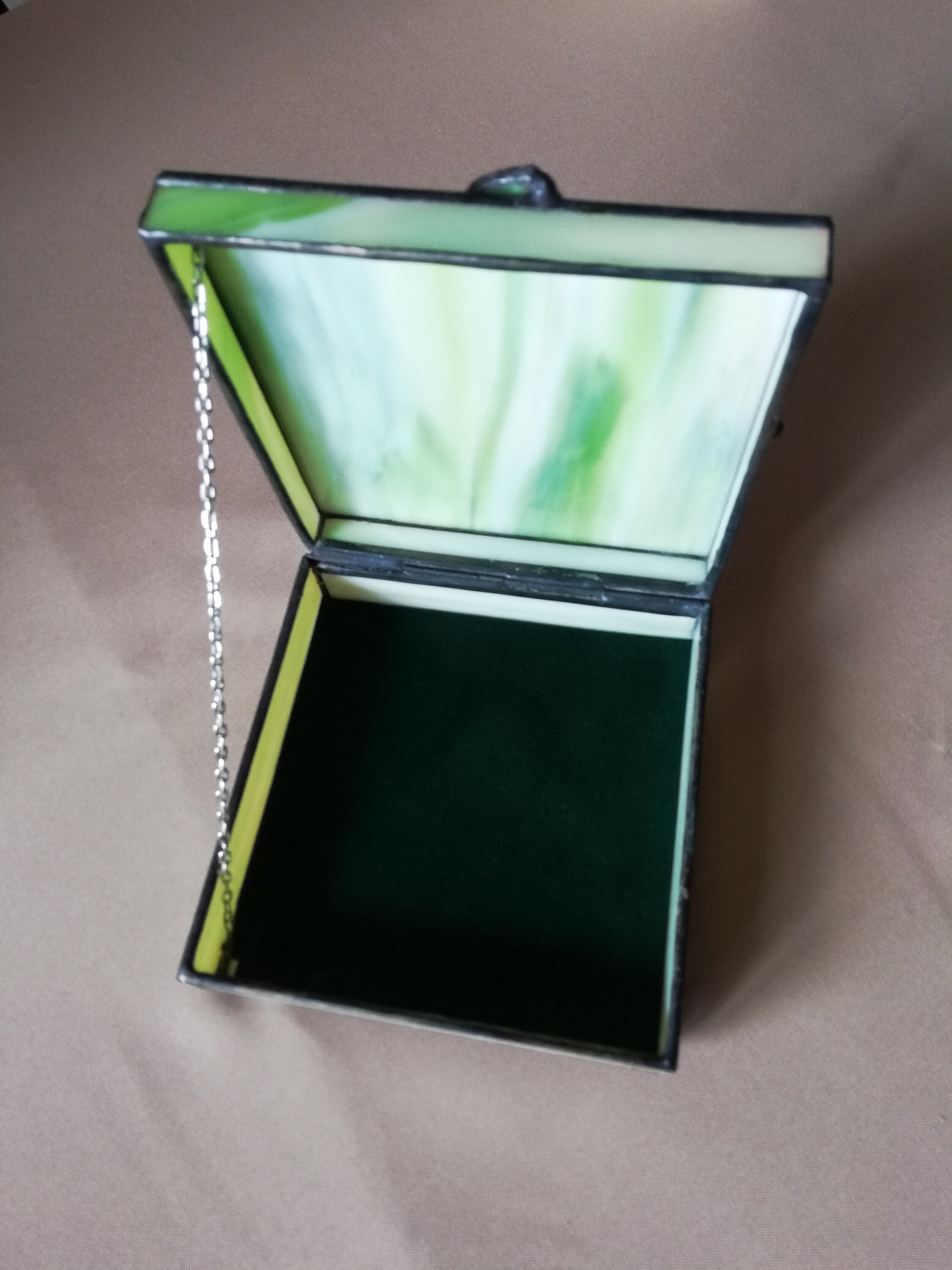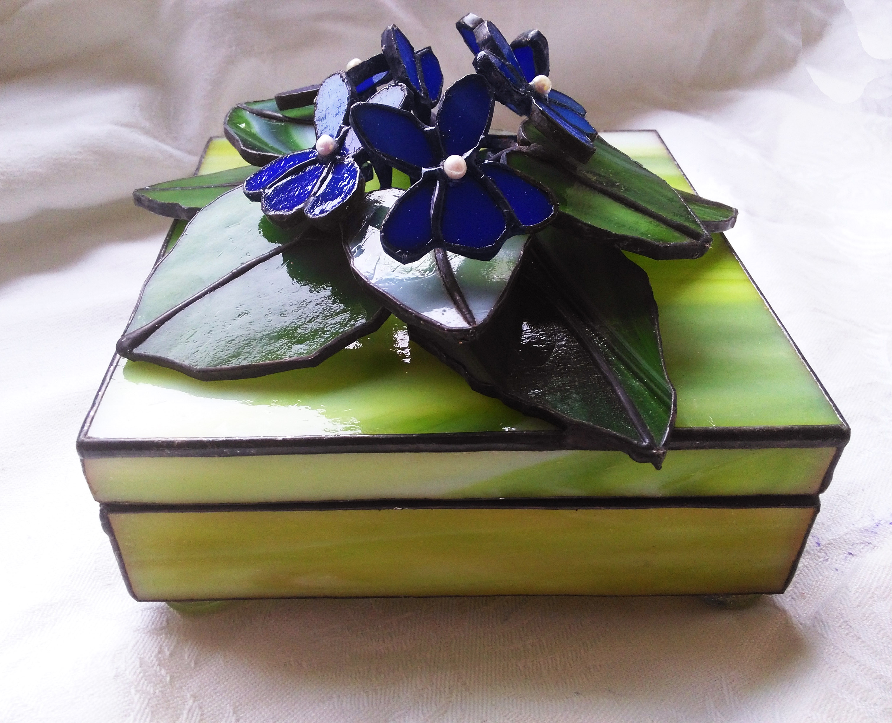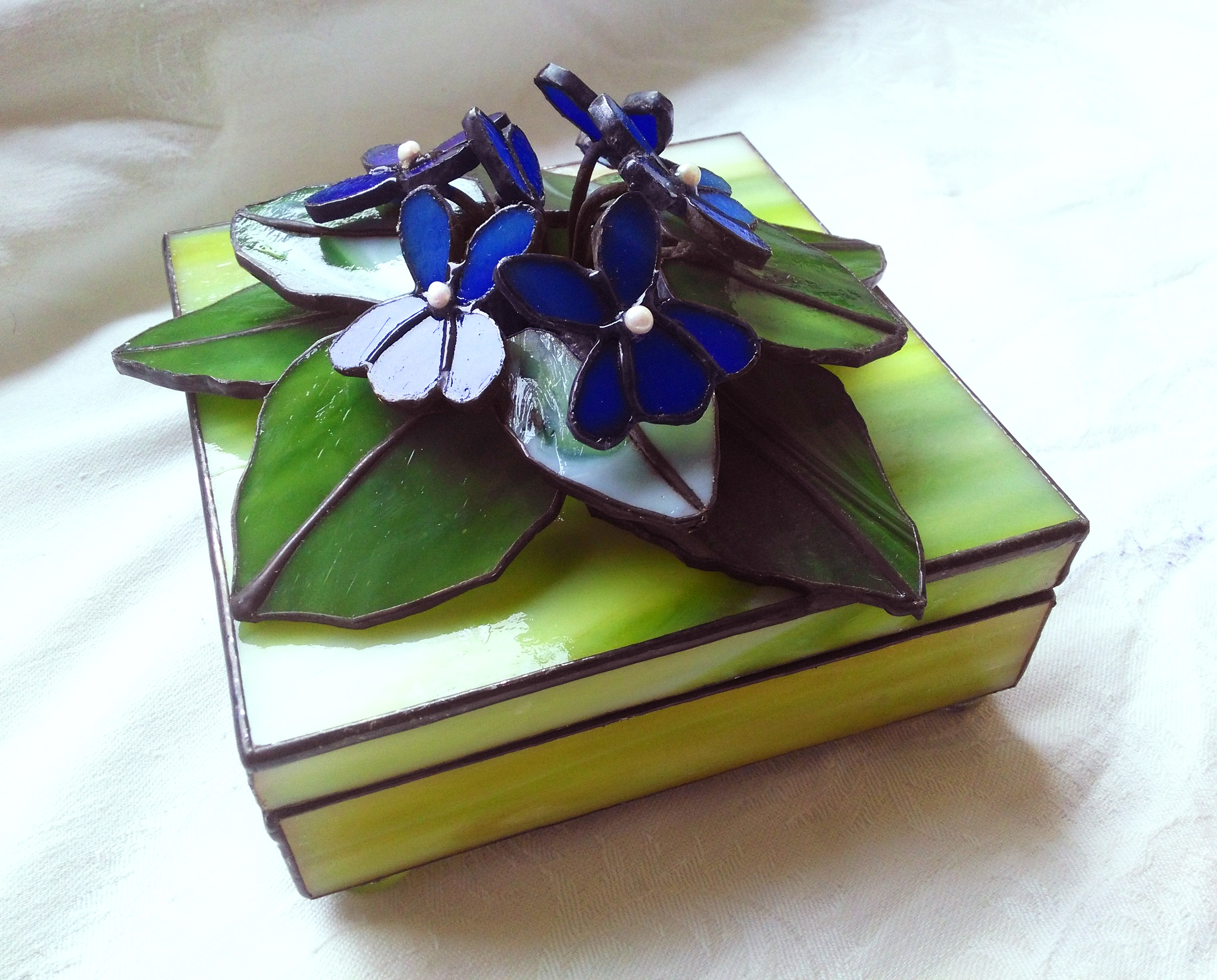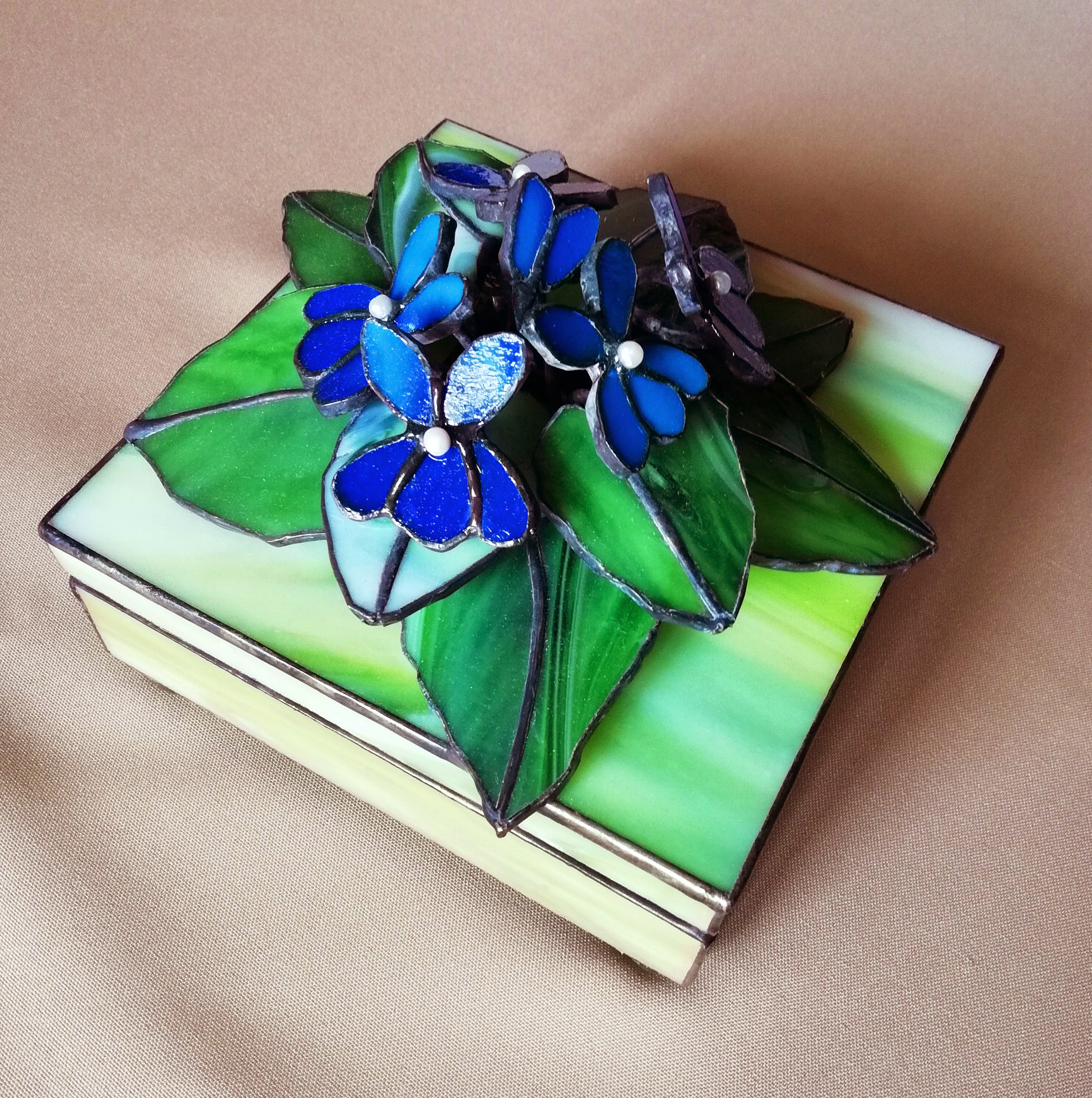 Valódi, 3 dimenziós ibolyacsomócska telepedett ennek a doboznak a fedelébe. Élénk kék virágfejek, tenyésztett gyöngy virágközép, olajzöld levelek, világoszöld doboztest, bársony belső, üveggyöngy lábak, belső fedéltartó lánc. Kedves értékes "örökzöld" üvegkülönlegesség, mely minden korban és minden időben szép és ízléses marad, divattól, trendtől független. Minden korosztály részére kitűnő ajándék, ékszereink méltó tárolására alkalmas iparművészeti alkotás. Stella Perle-logós fa-díszdoboz jár hozzá, így igazán exkluzív ajándék.