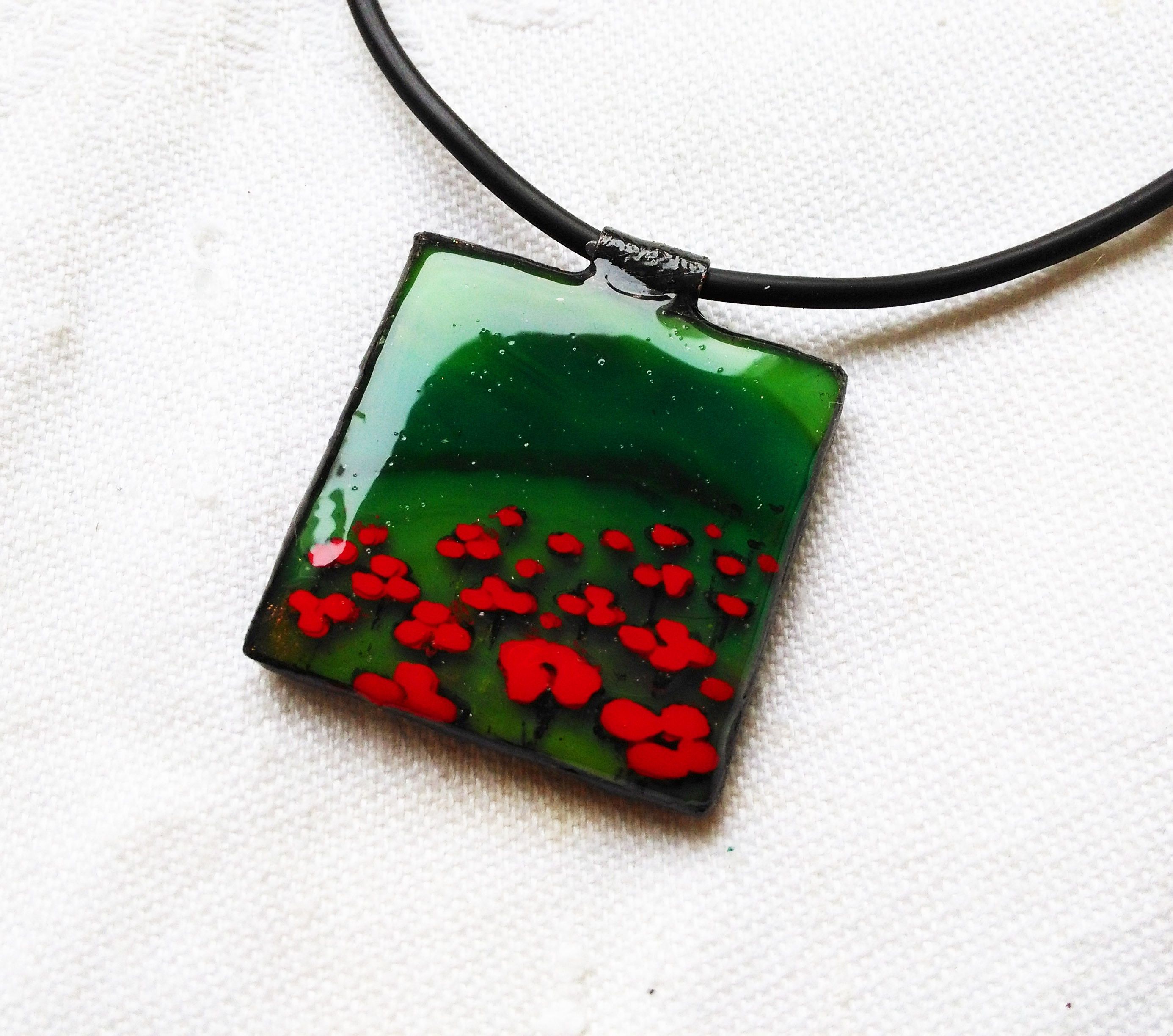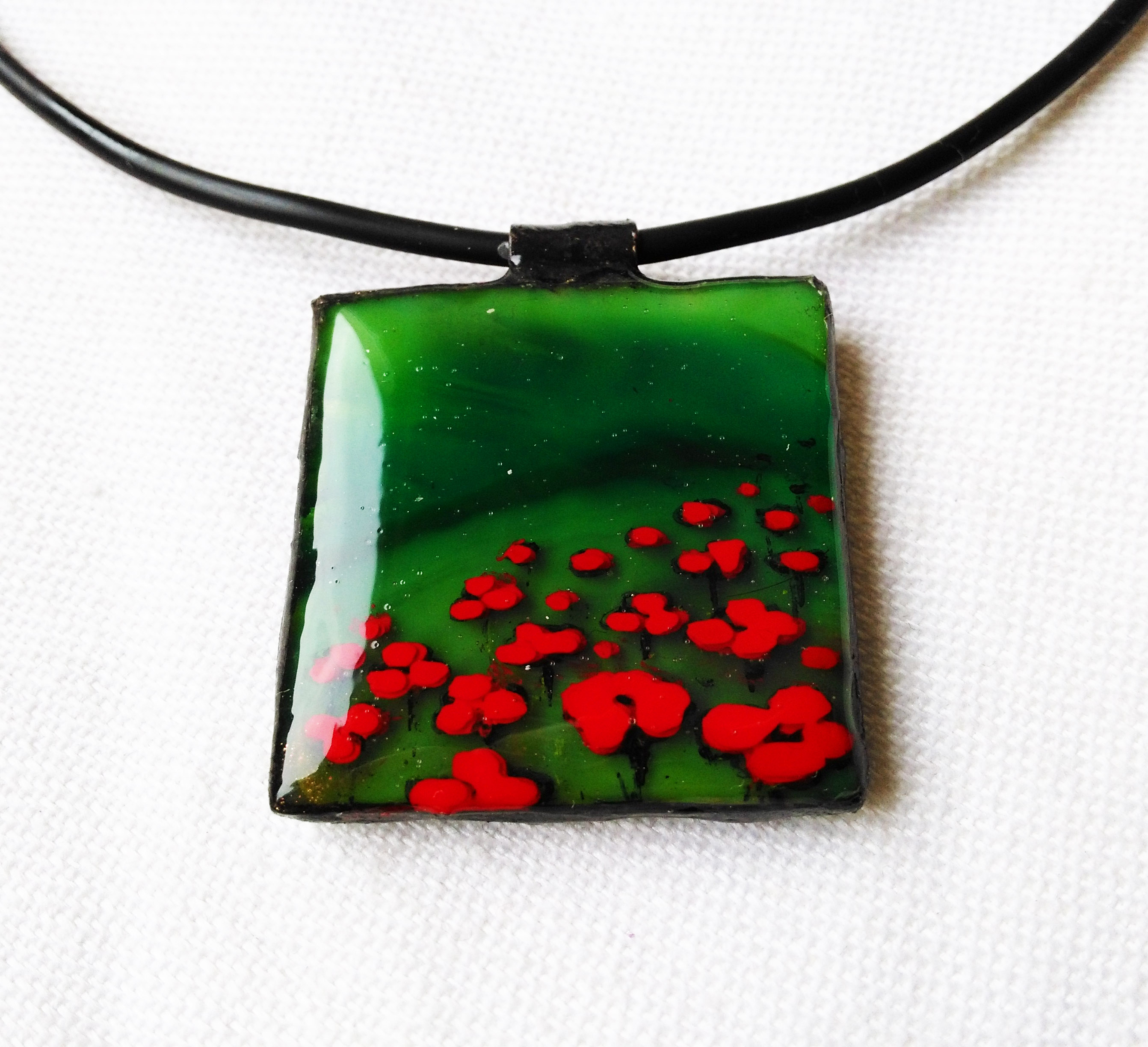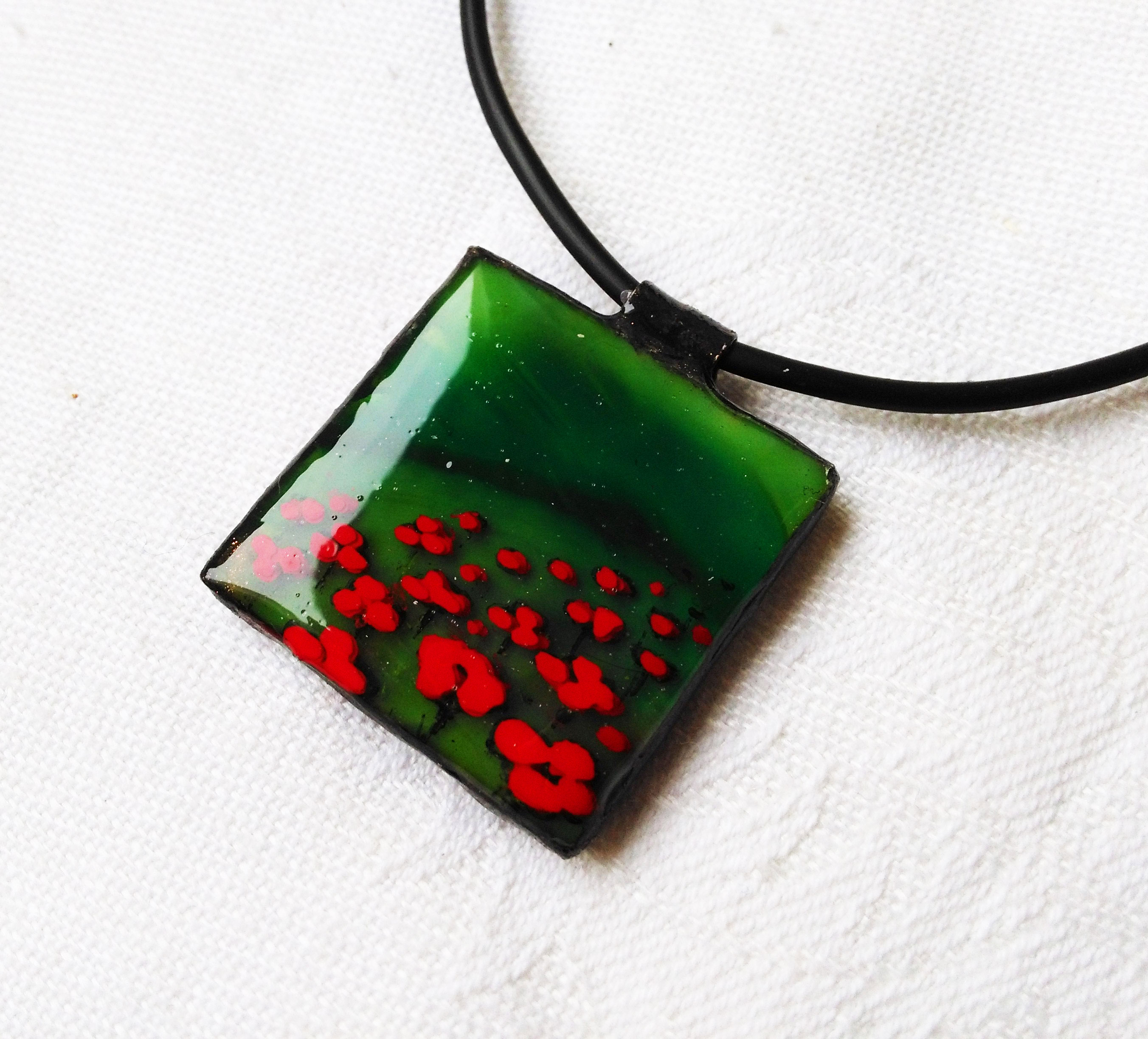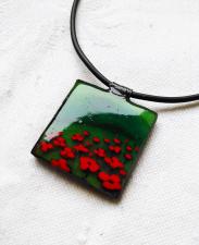3 D-s hatású többször festett és lakkozott élénk piros virágokkal hímzett fűzöld alapú medálka. Aprólékos, rengeteg munkát igénylő, egyedi darab. Nagyon dekoratív, trendi, mégis színes florális, feltűnő, ...minden igényt kielégít. Bőr szíjjal ellátott