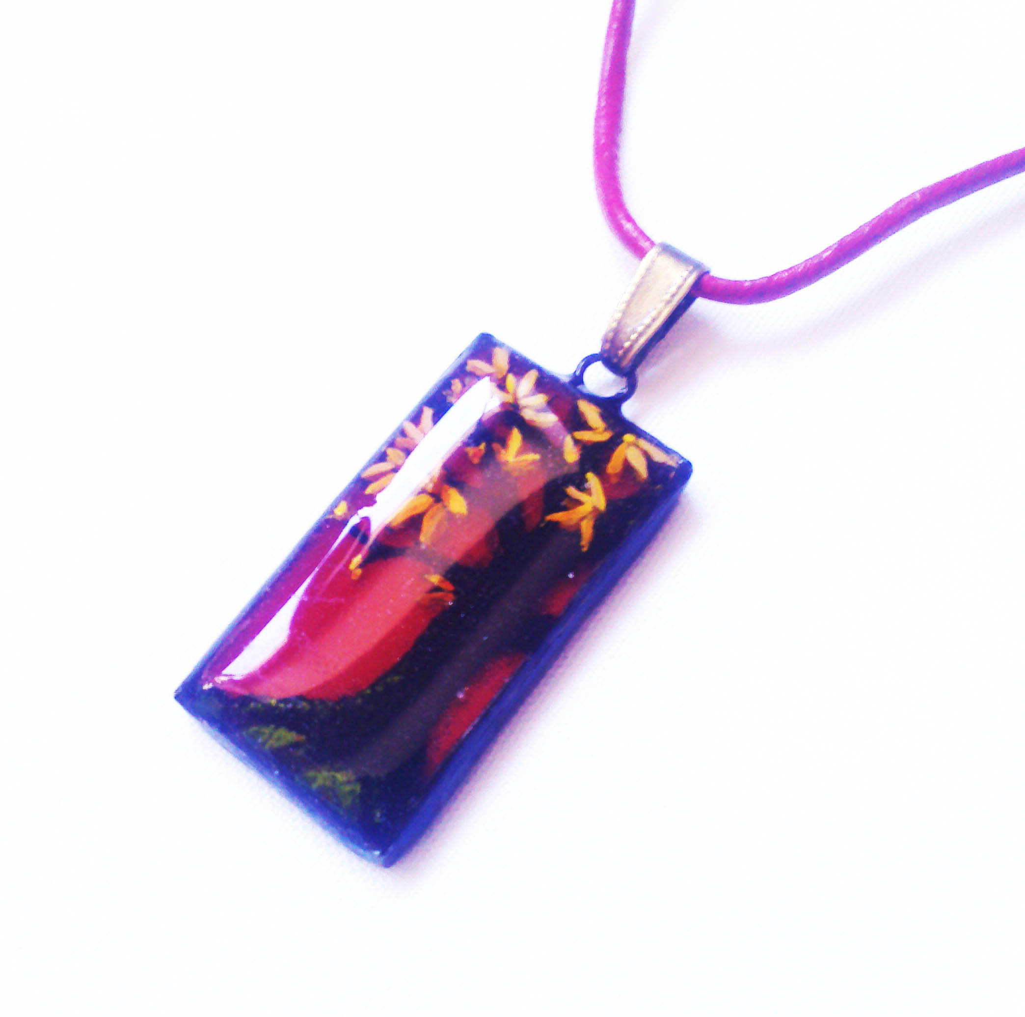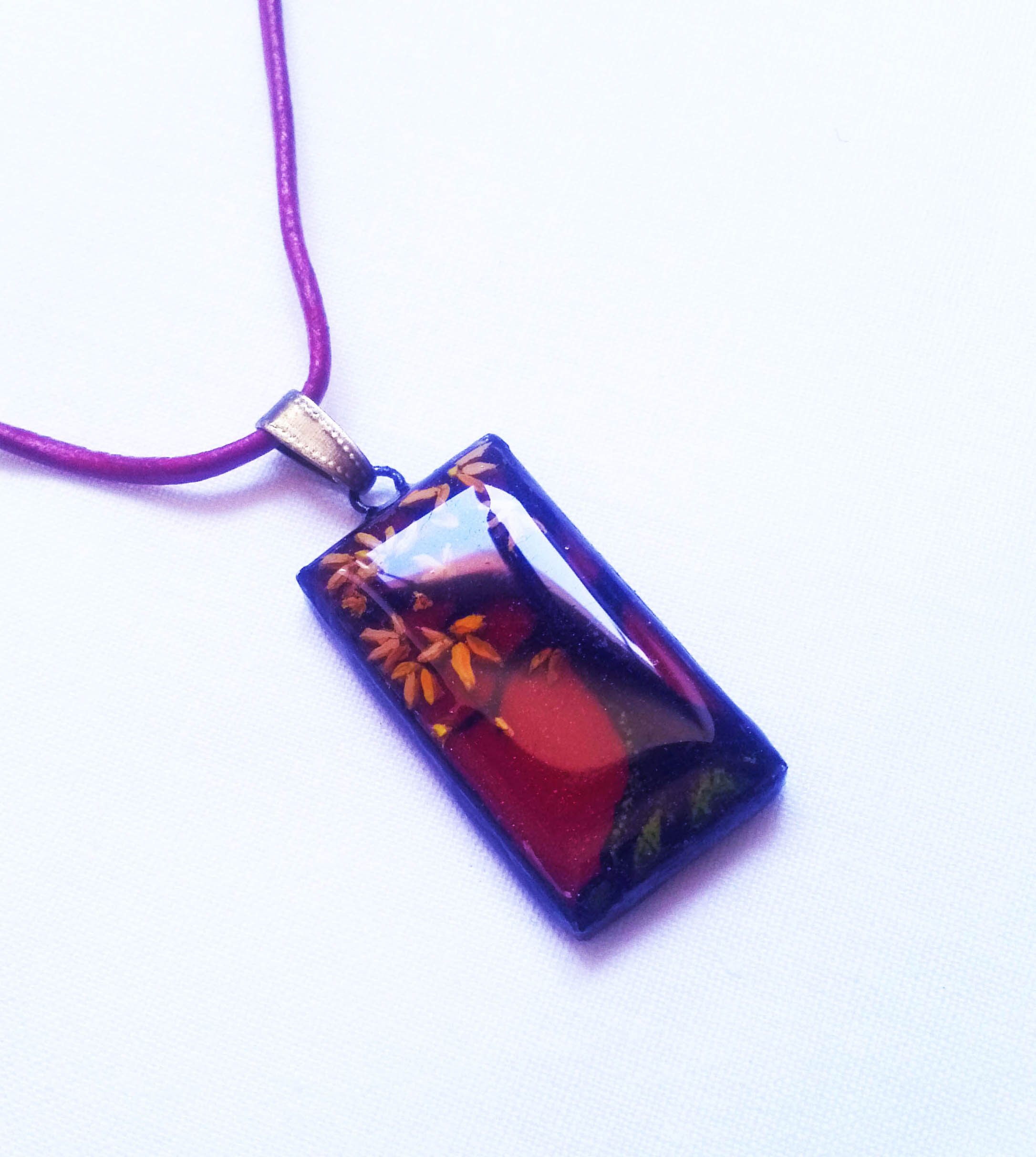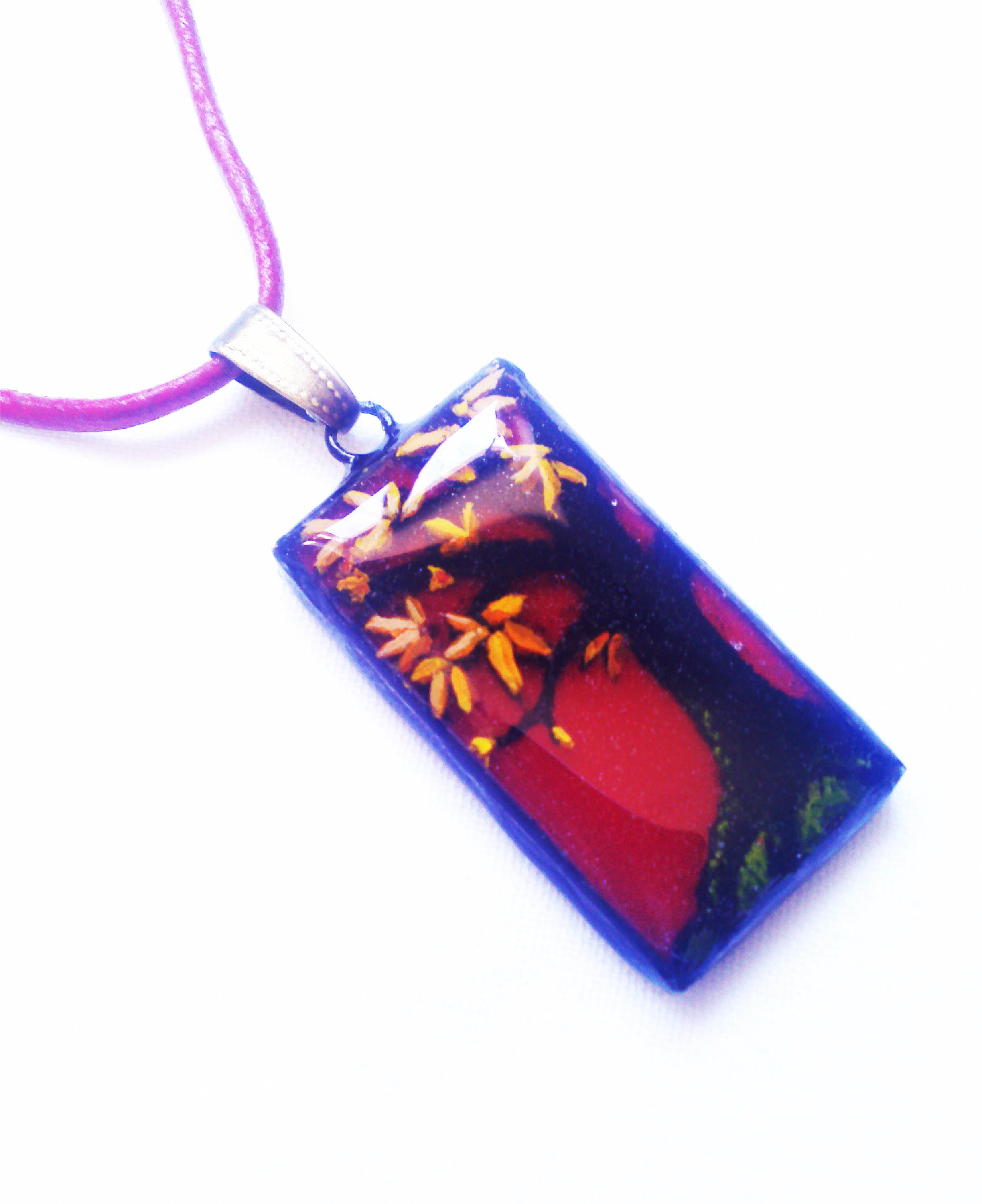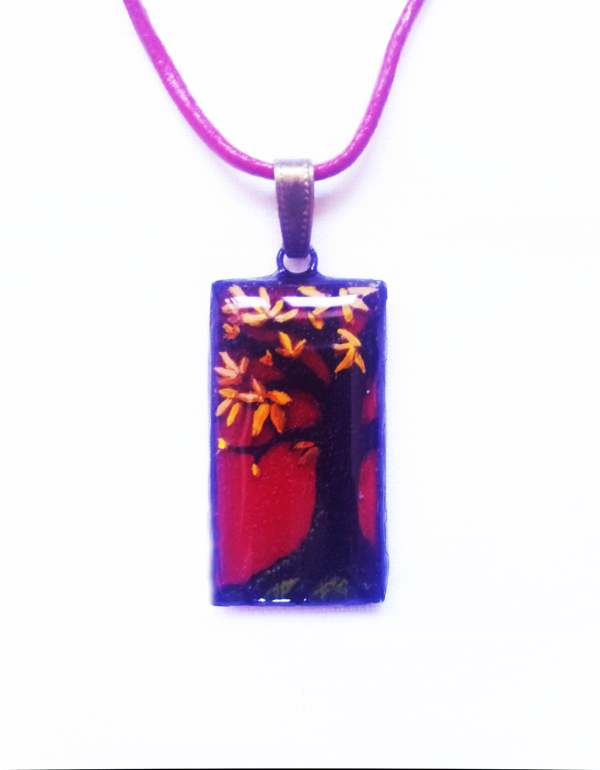 Élénk vörös háttér előterében őszi fa, narancs, skarlát, fekete és zöld harmóniája. 3 Dimenziósan kiemelkedő levelek, domború csillogó, többrétegű üveglakkal. Aprólékos kézi munka.