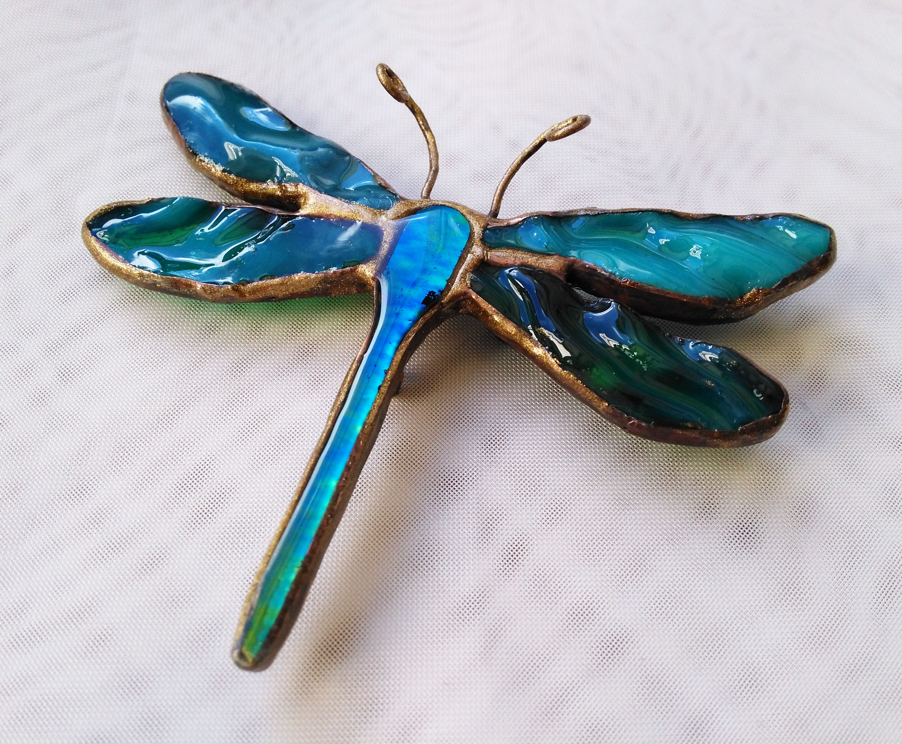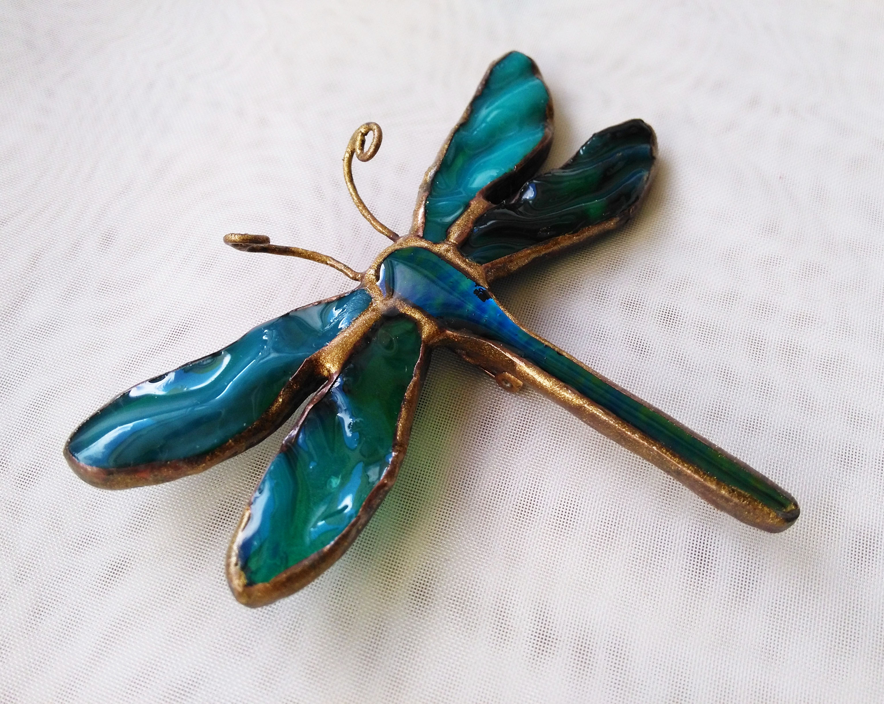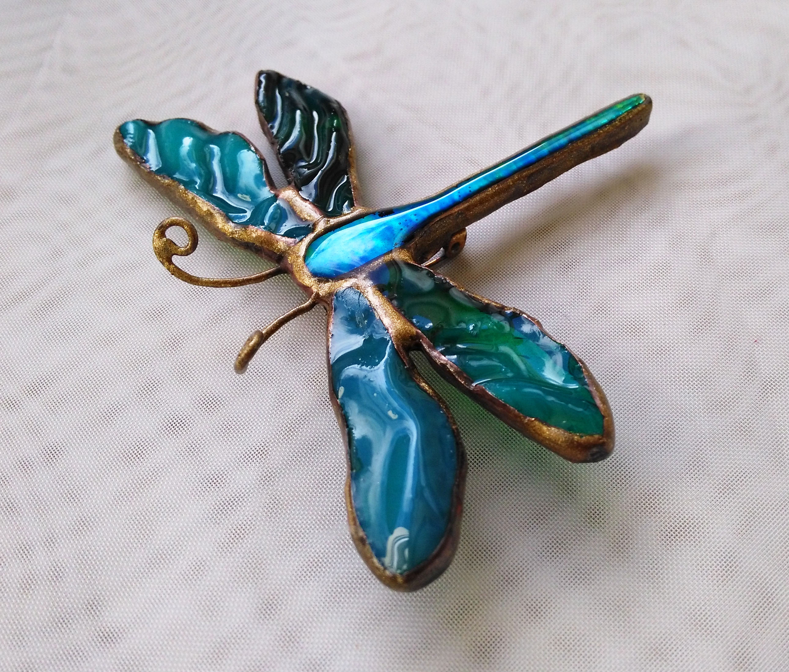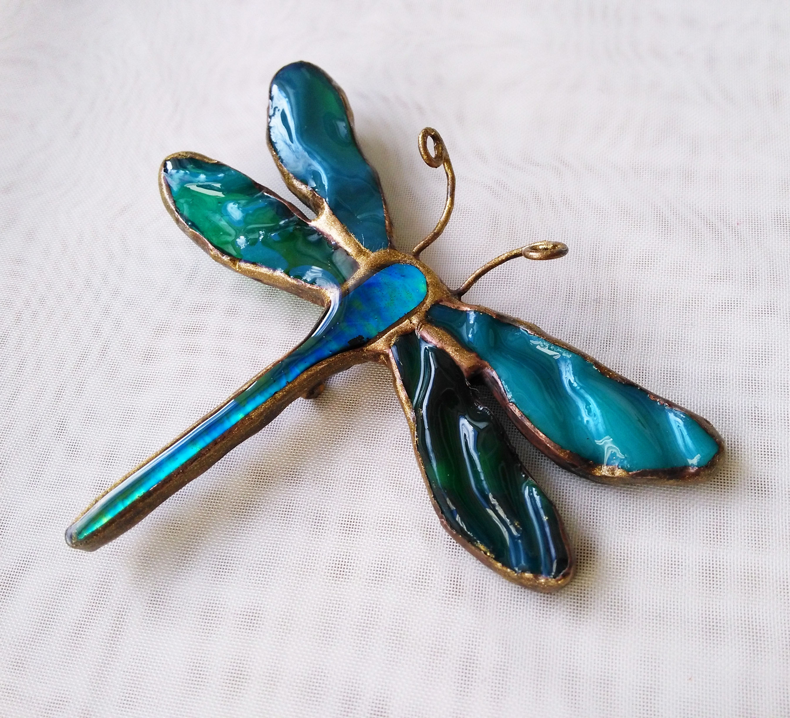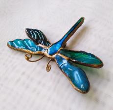 Irizált, szivárványos kék színpompába öltözködő légies tünemény, arany kontúrral elegáns viselet, bármilyen kosztümöt,kabátot, blézert, blúzt, estélyi ruhát vagy kalapot csodálatosan feldob és ékesít. Méretei: 8 x 6 cm