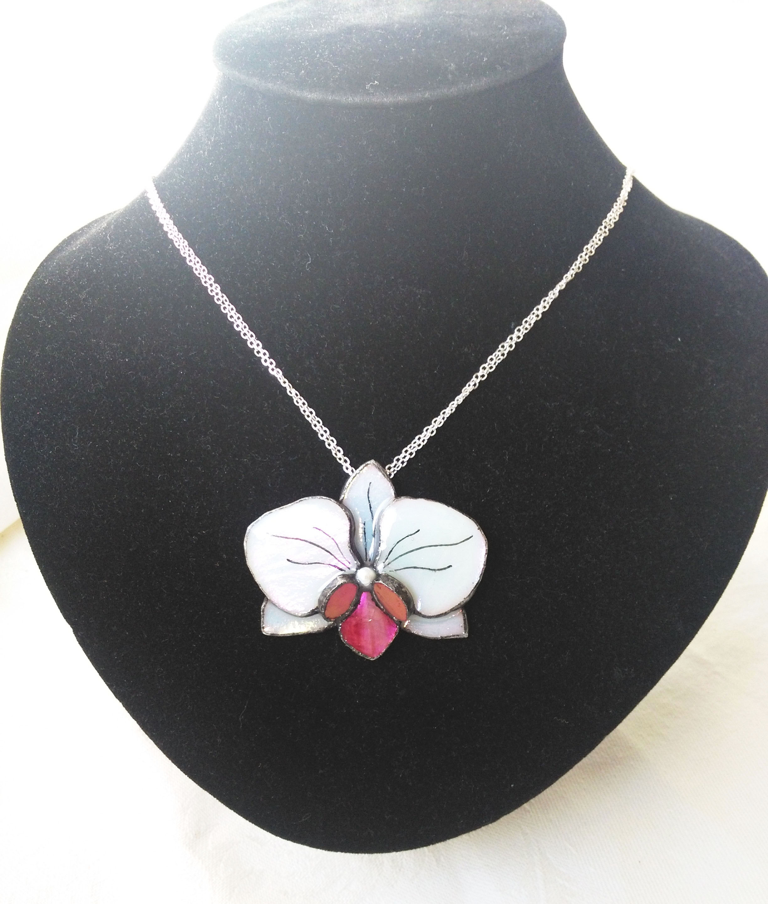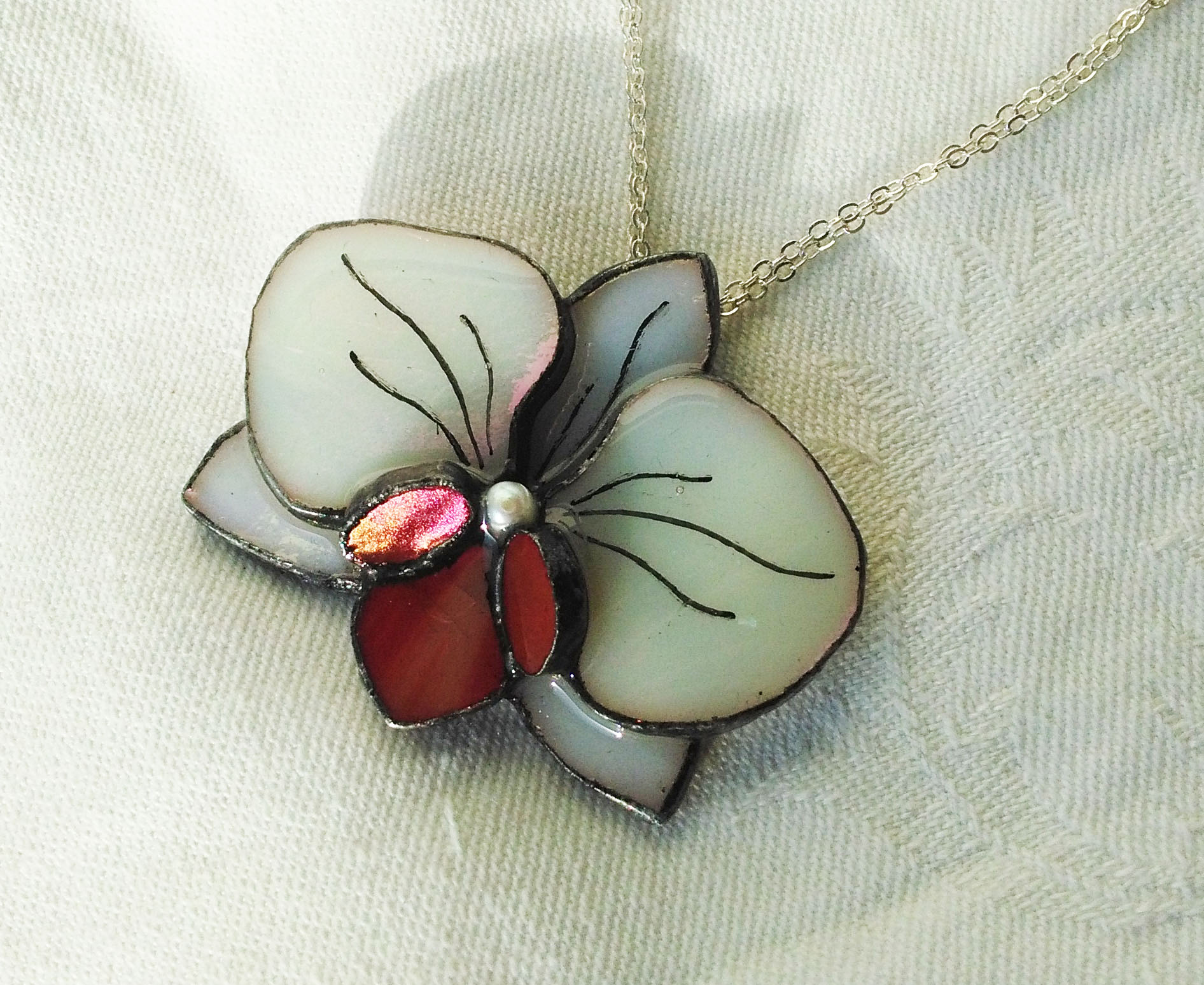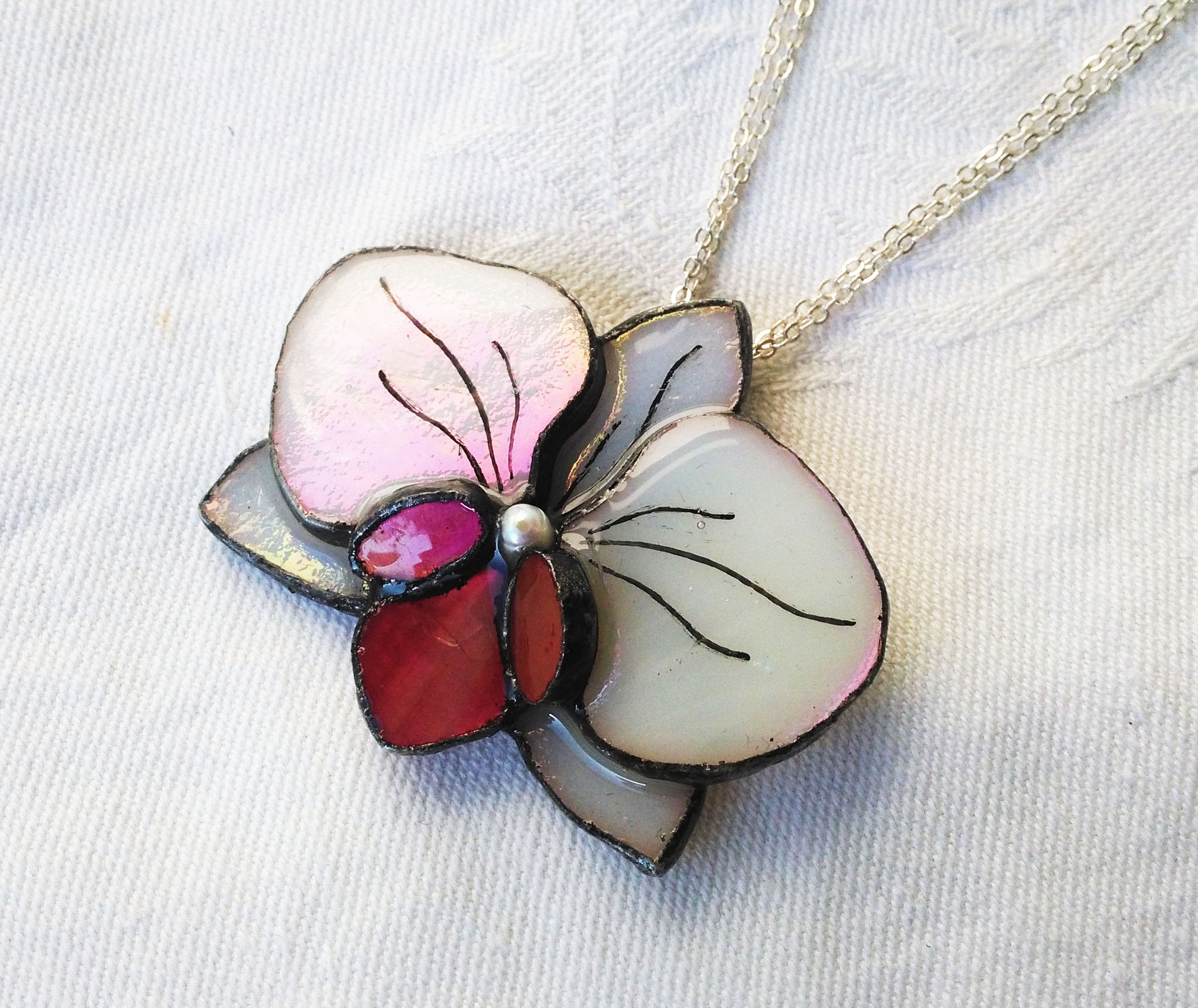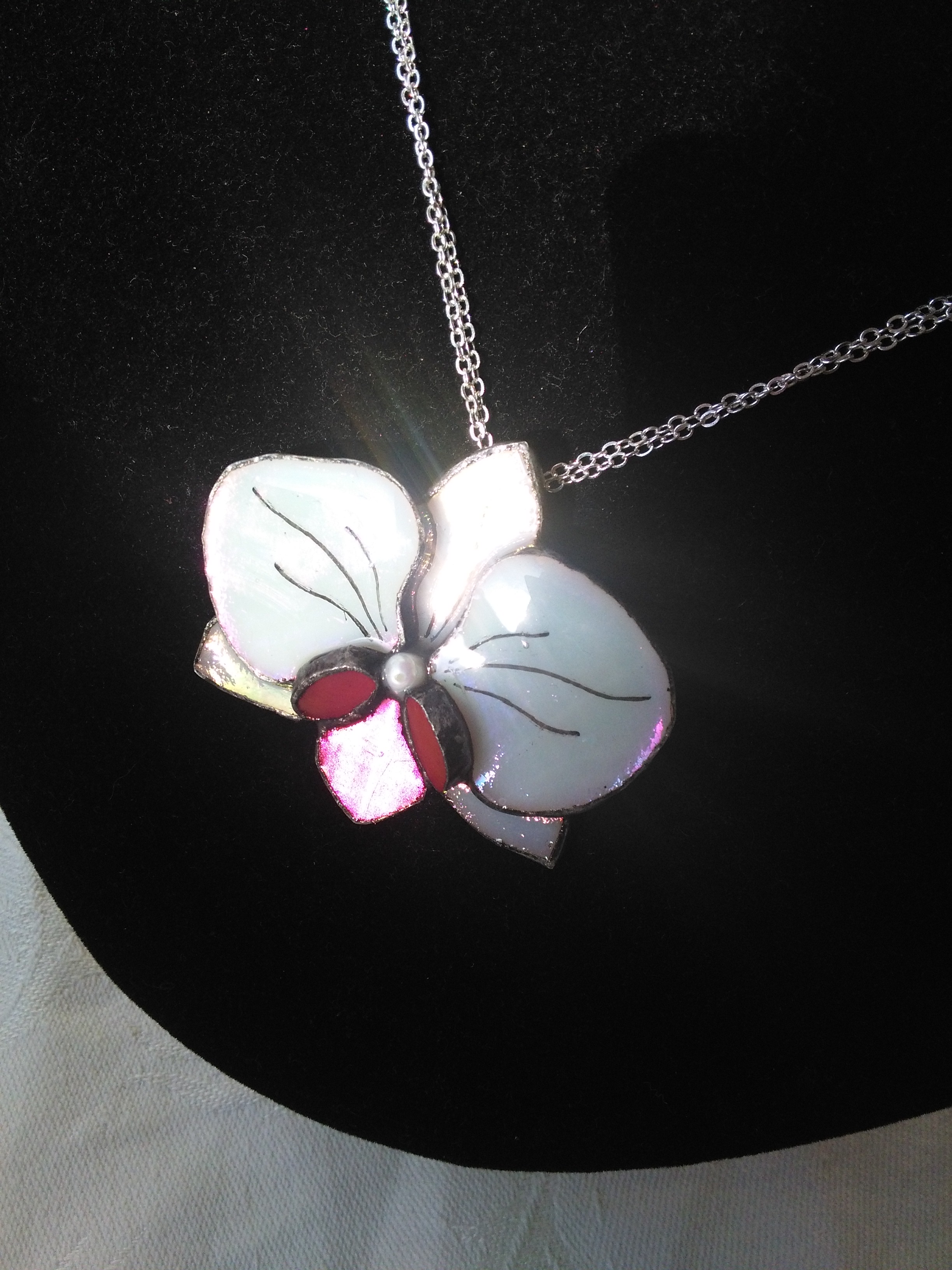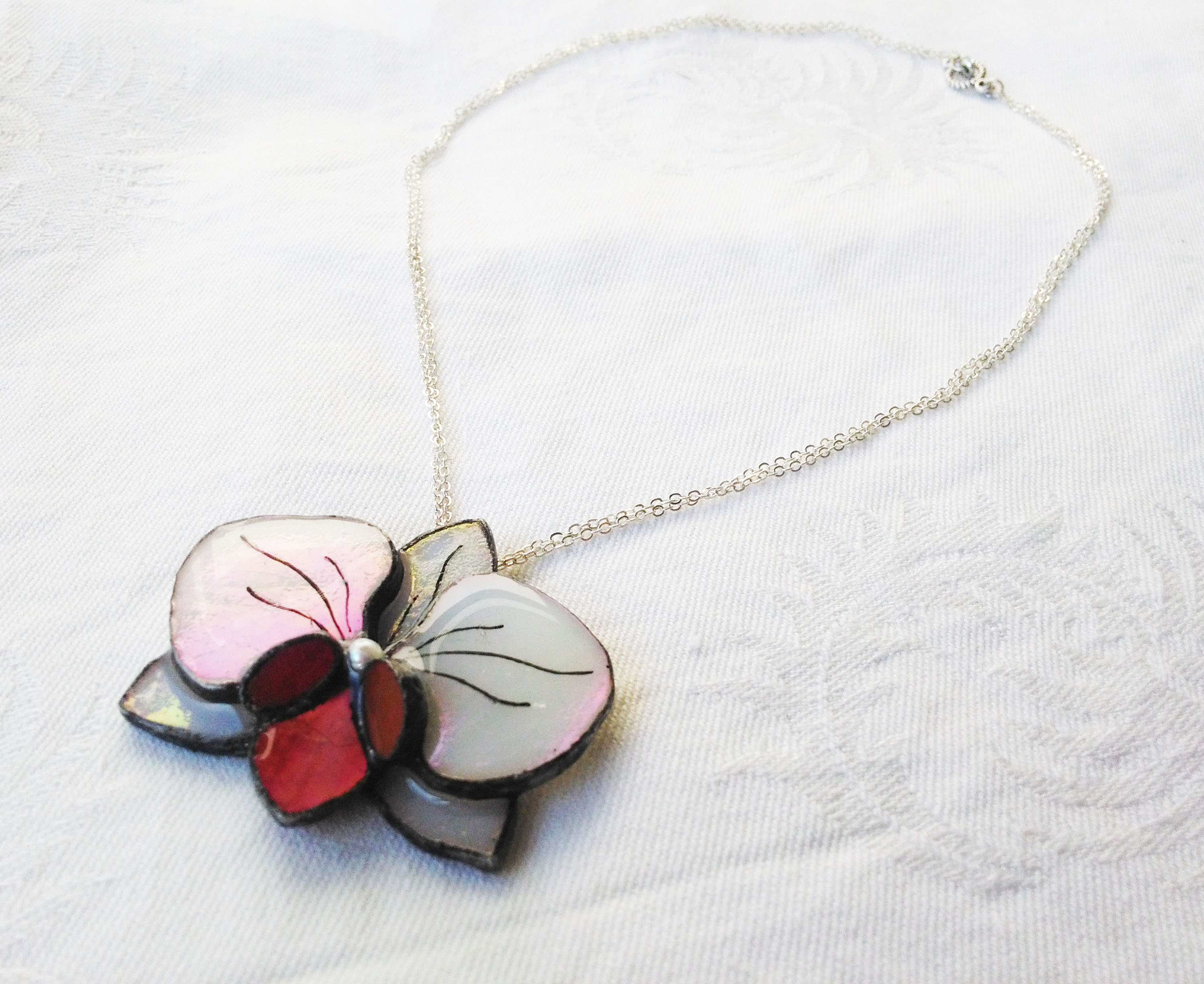Selymesen fehér és rózsaszínesen csillogó finom nőies ékszer. Irizált üveggel, domború lakkal és ezüst színű lánccal készült