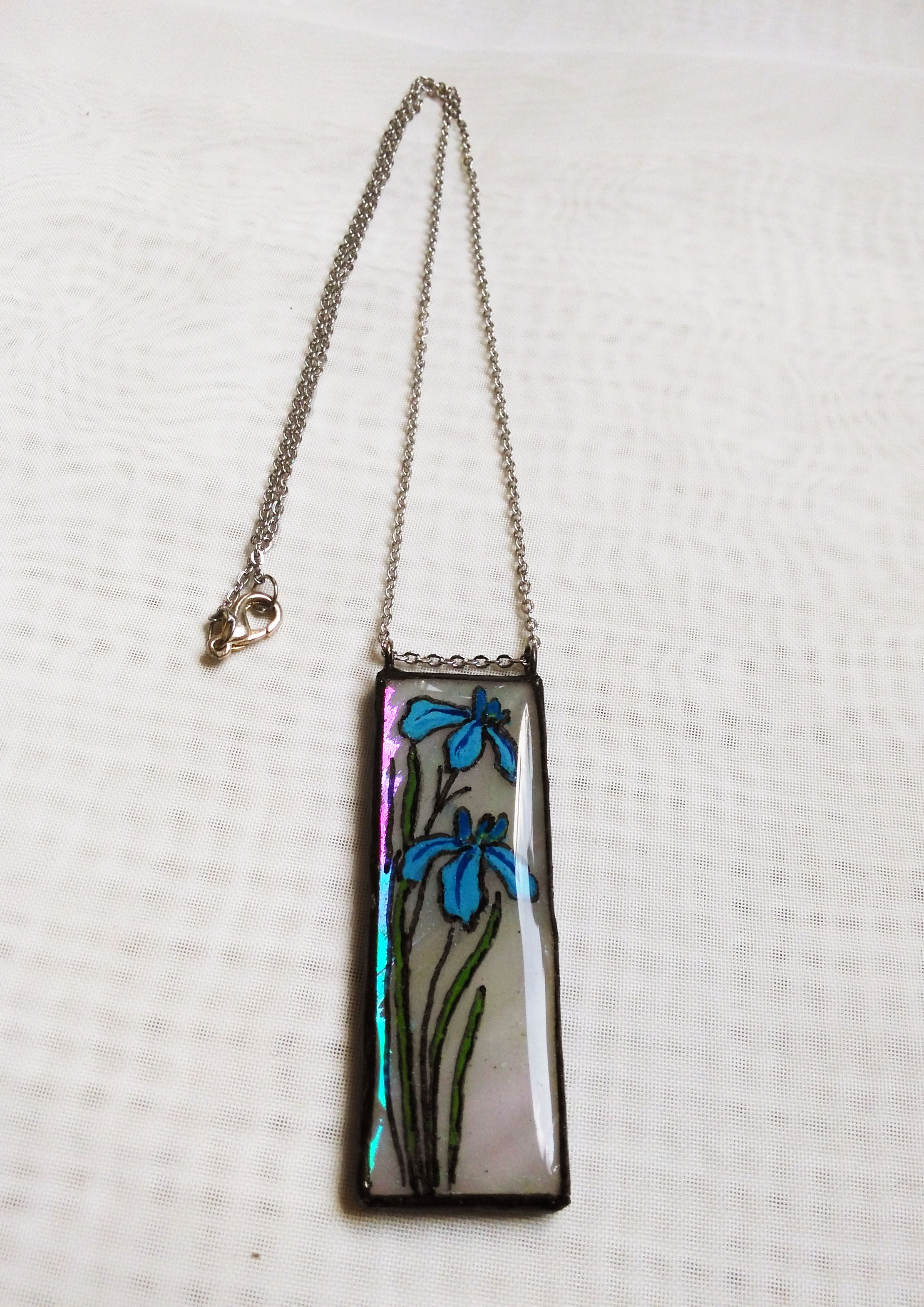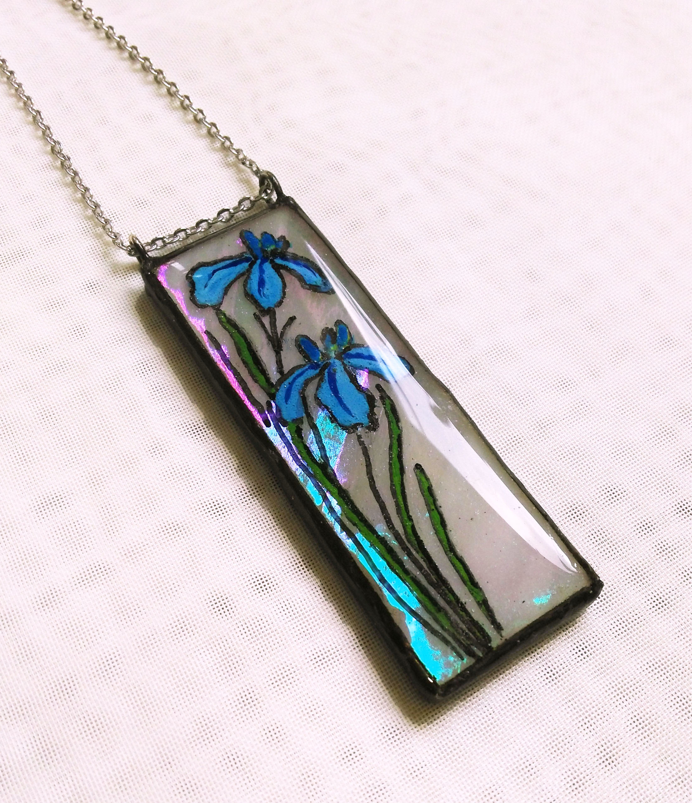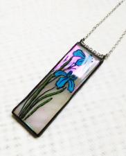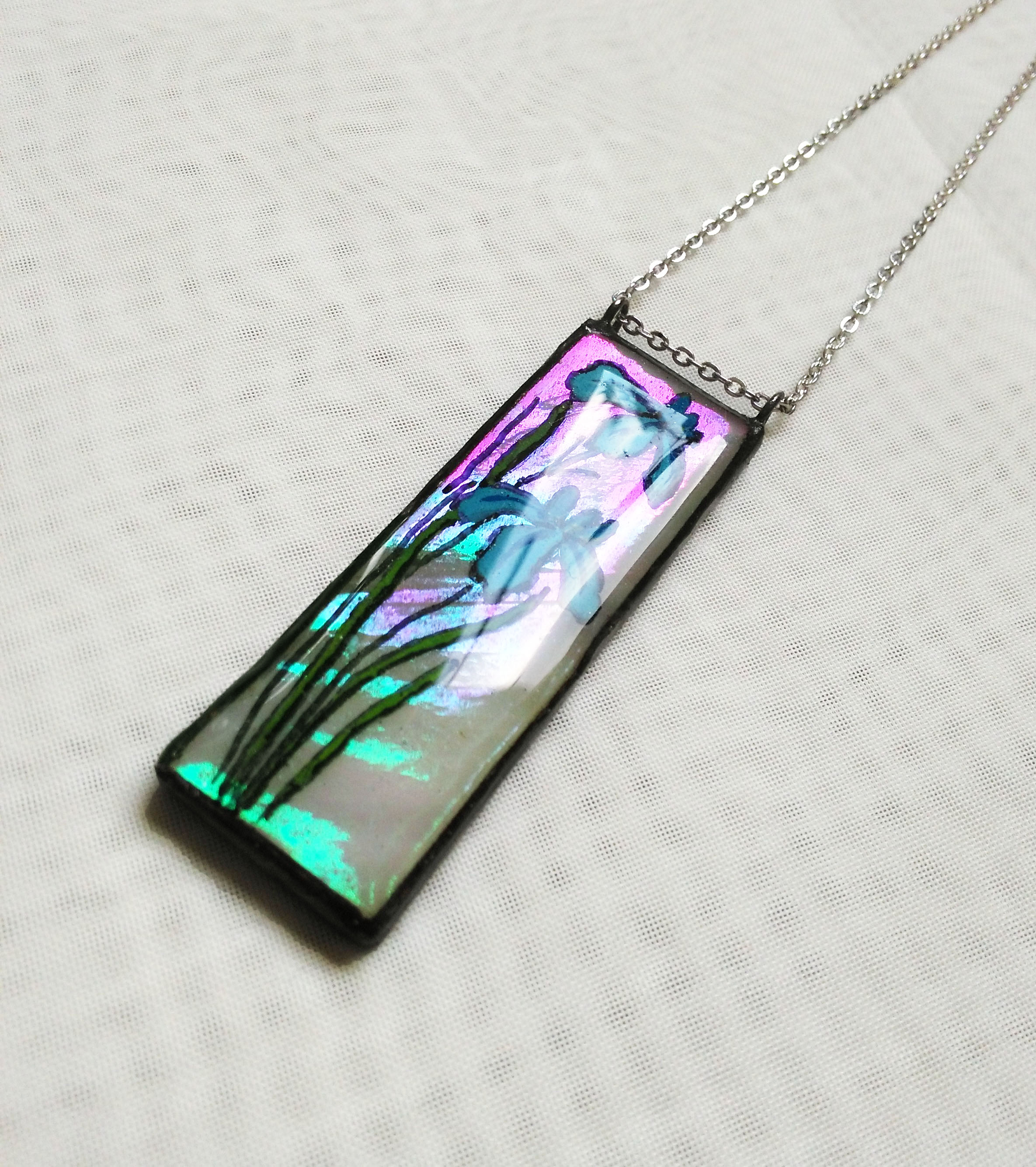 Irizáloan szivarvanyosfehér alapon égszinkék íriszek, m3lyek egymasba fondódnak, szelídek es csillogók egyezerre. Elegáns, nőies darab egy hosszúkás szines úvegformába foglalva.