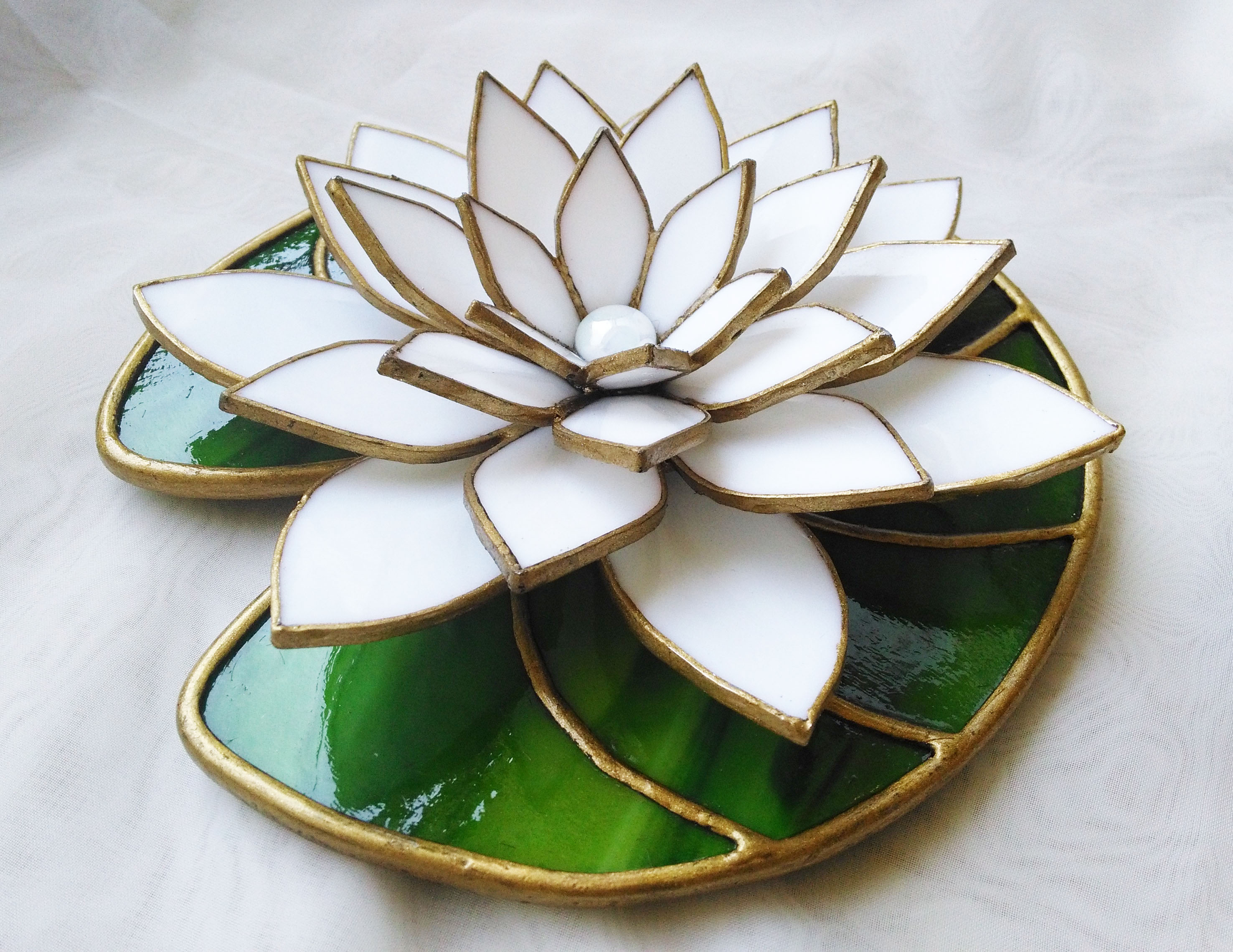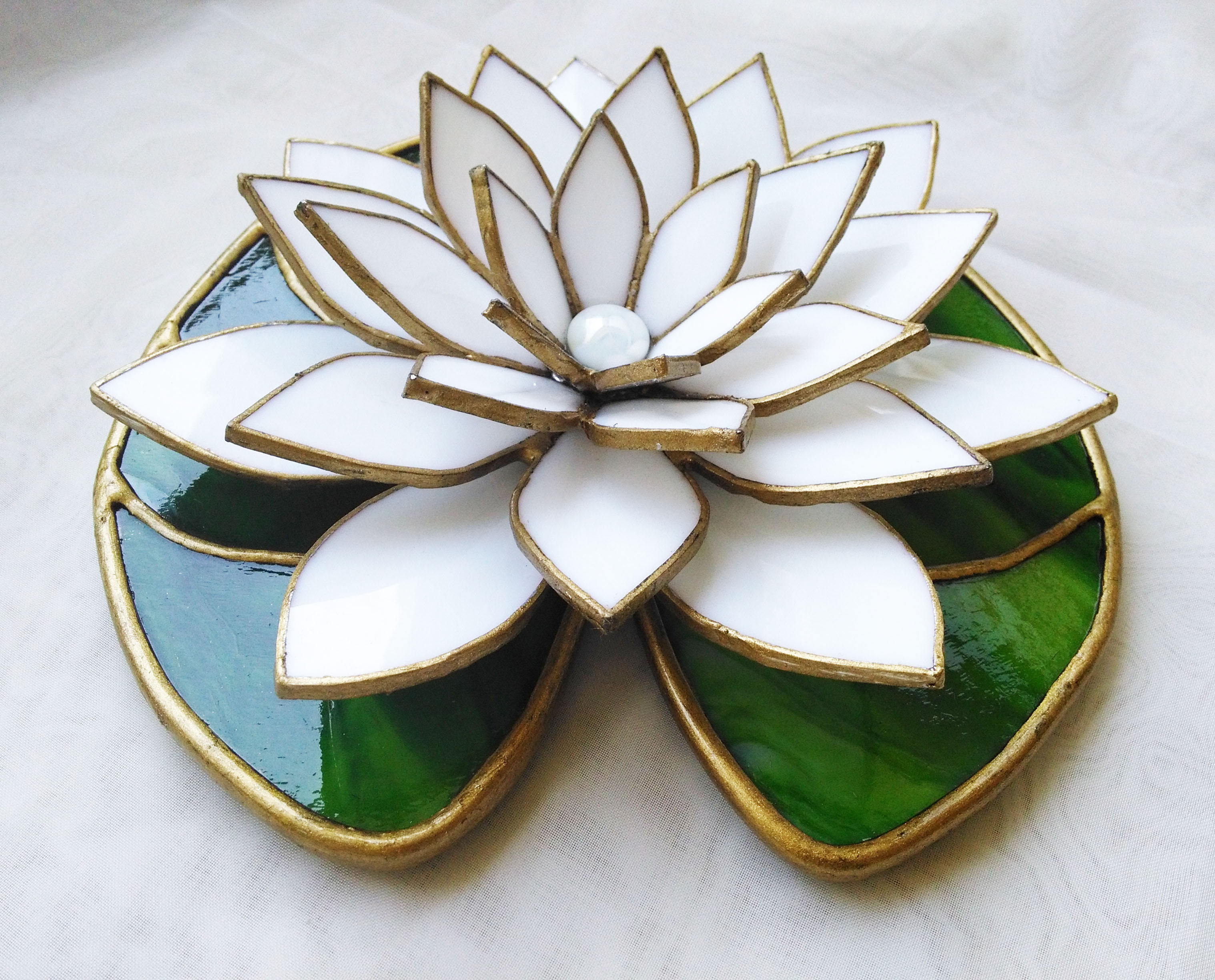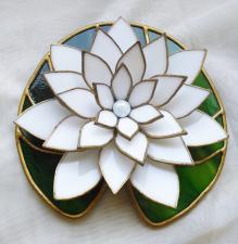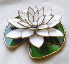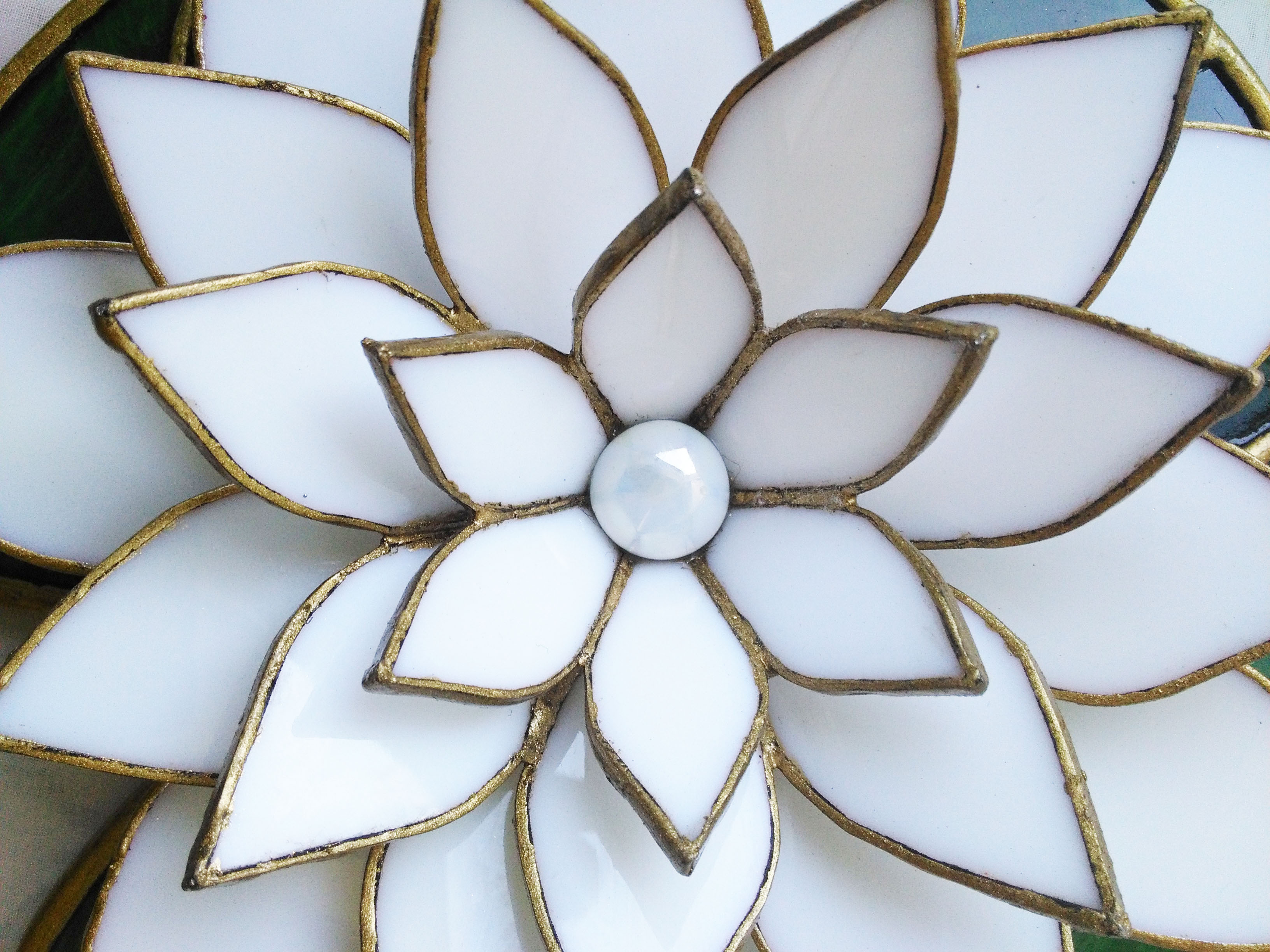 Hófehér sziromrengeteg, mandalaszerű körkörös bontakozása egy csodaszép, nemes virágnak. Sima asztalidíszként és füstölőtartóként is funkcionálhat utóbbi esetben a középső gyöngy átfúrásával.