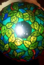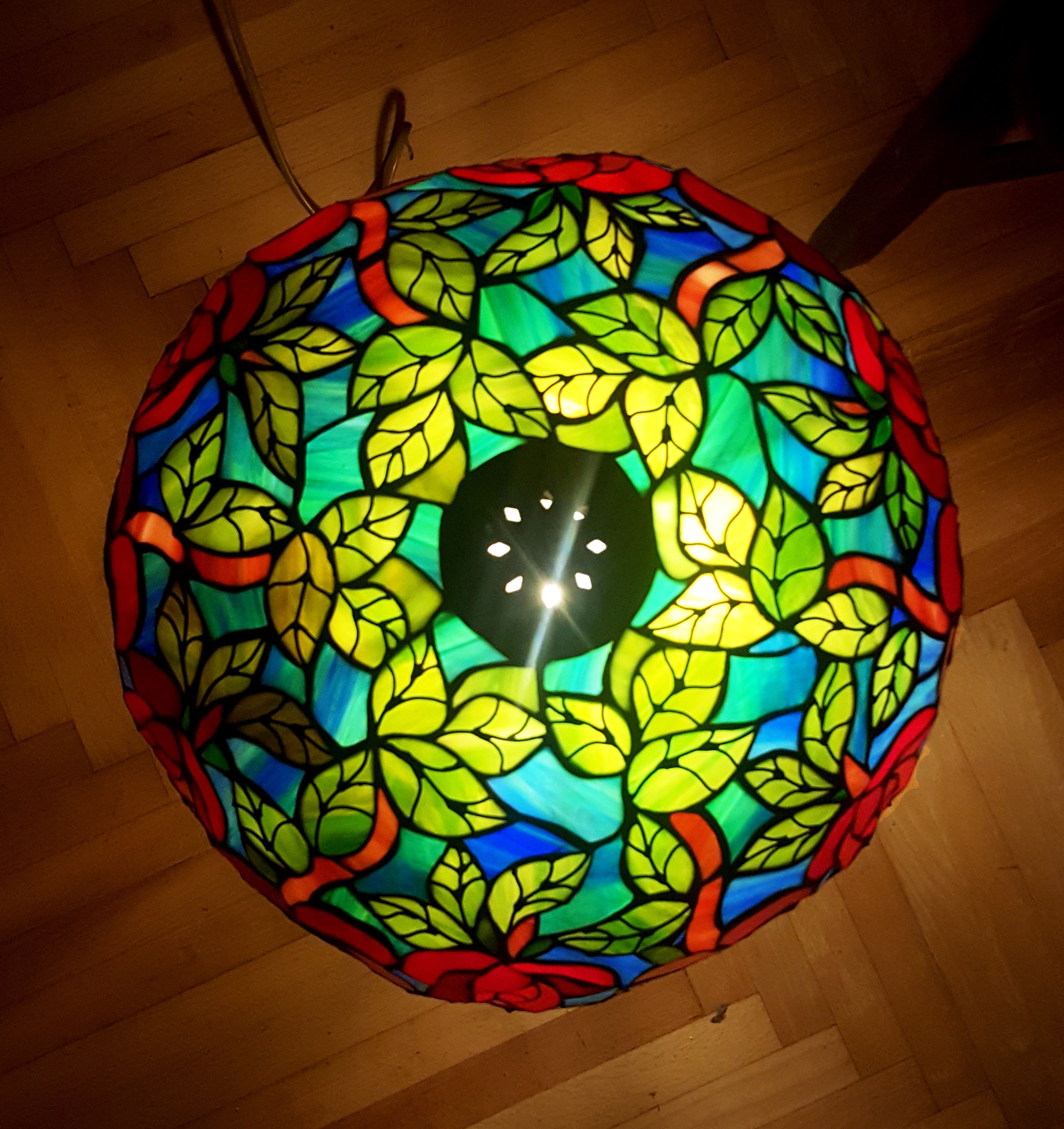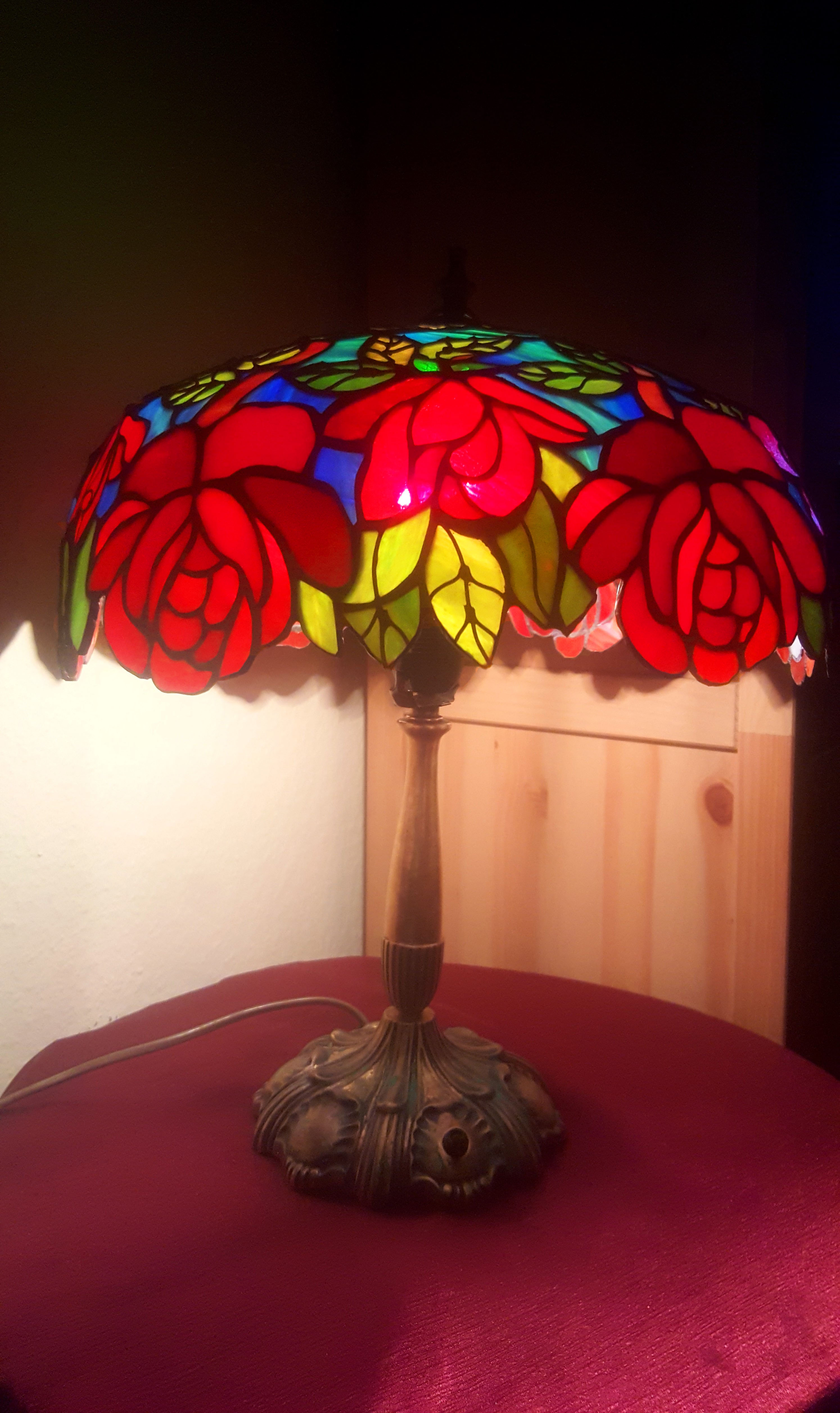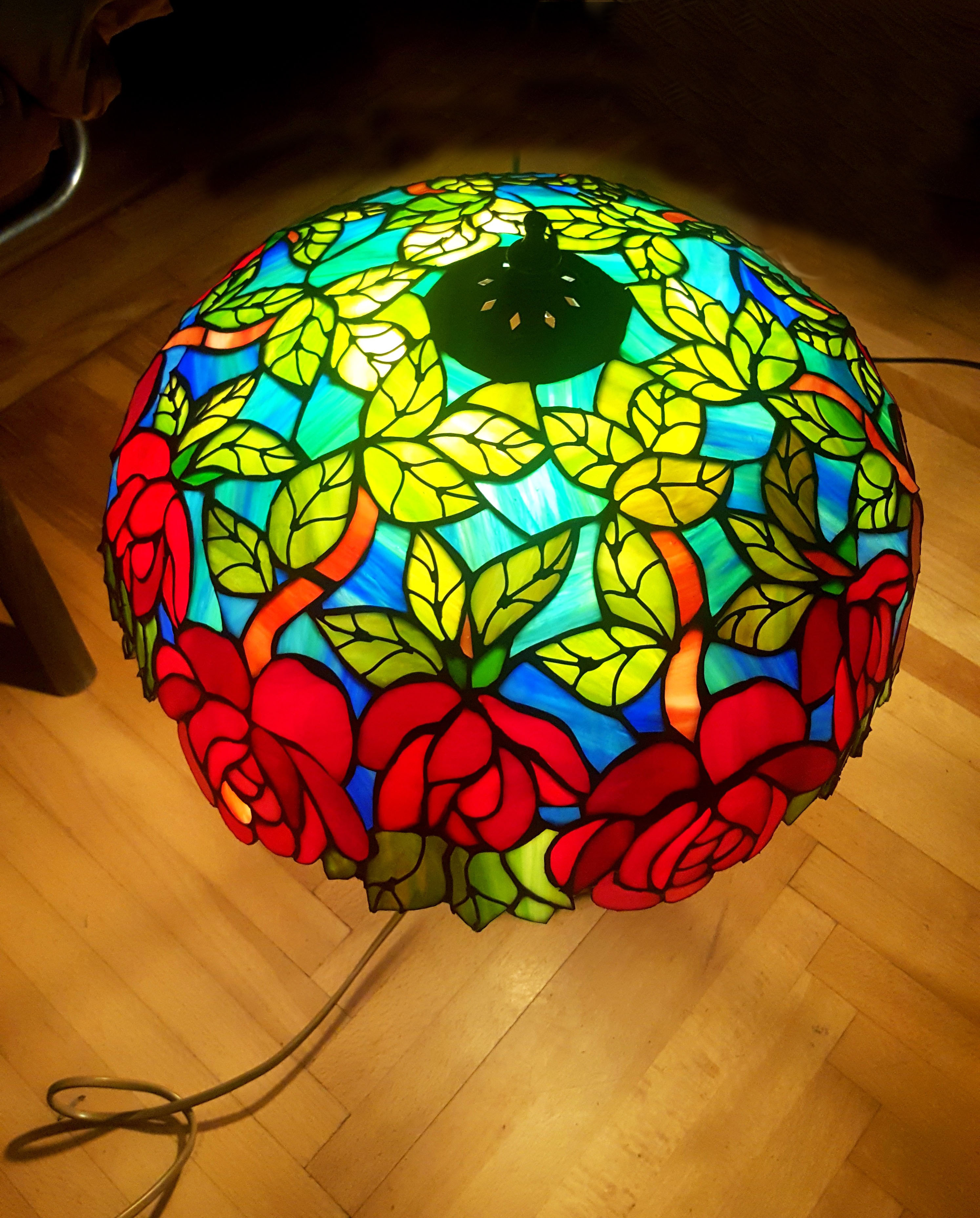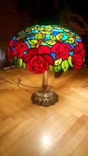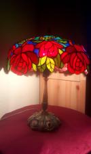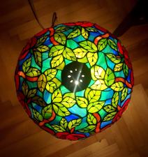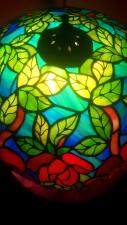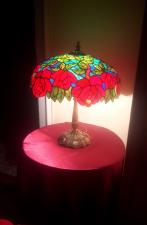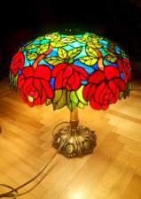 Rendelésre készült részletgazdag, filigrán munka, mely bíbor színben pompázó, szecessziós rózsákat ábrázol dús levélzettel. A bíbor színű üveg, az olajzöld levelek és a türkiz háttérszin csodásan összehangolt üvegválogatás, mely színes fénybe öltöztet minden teret. A szabályosan ismétlődő minták felülről nézve mandala alakot formálnak. 650 darabból álló, saját tervezésű munka. A búra átmérője 40 cm, a lámpa teljes magassága 52 cm.