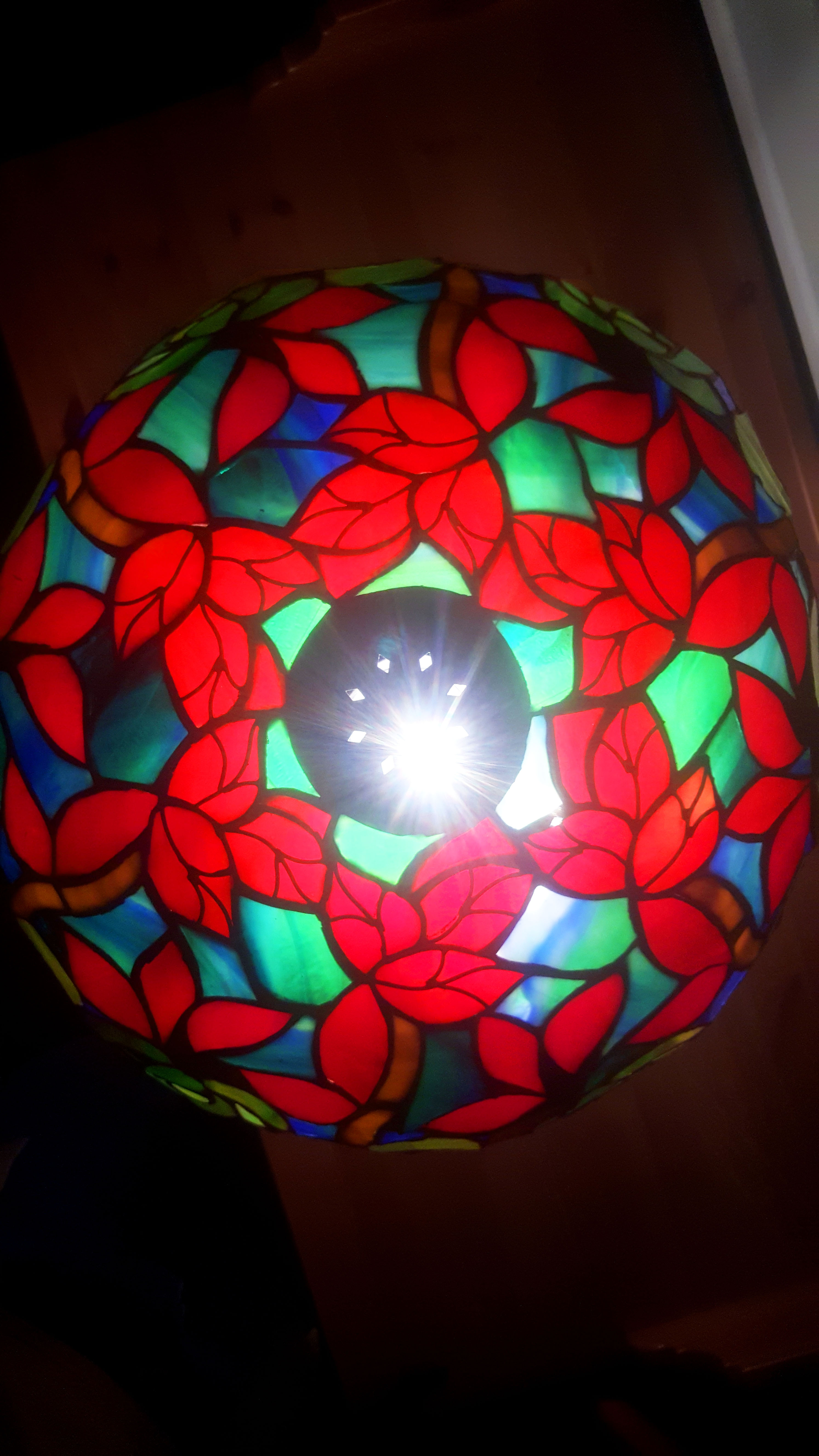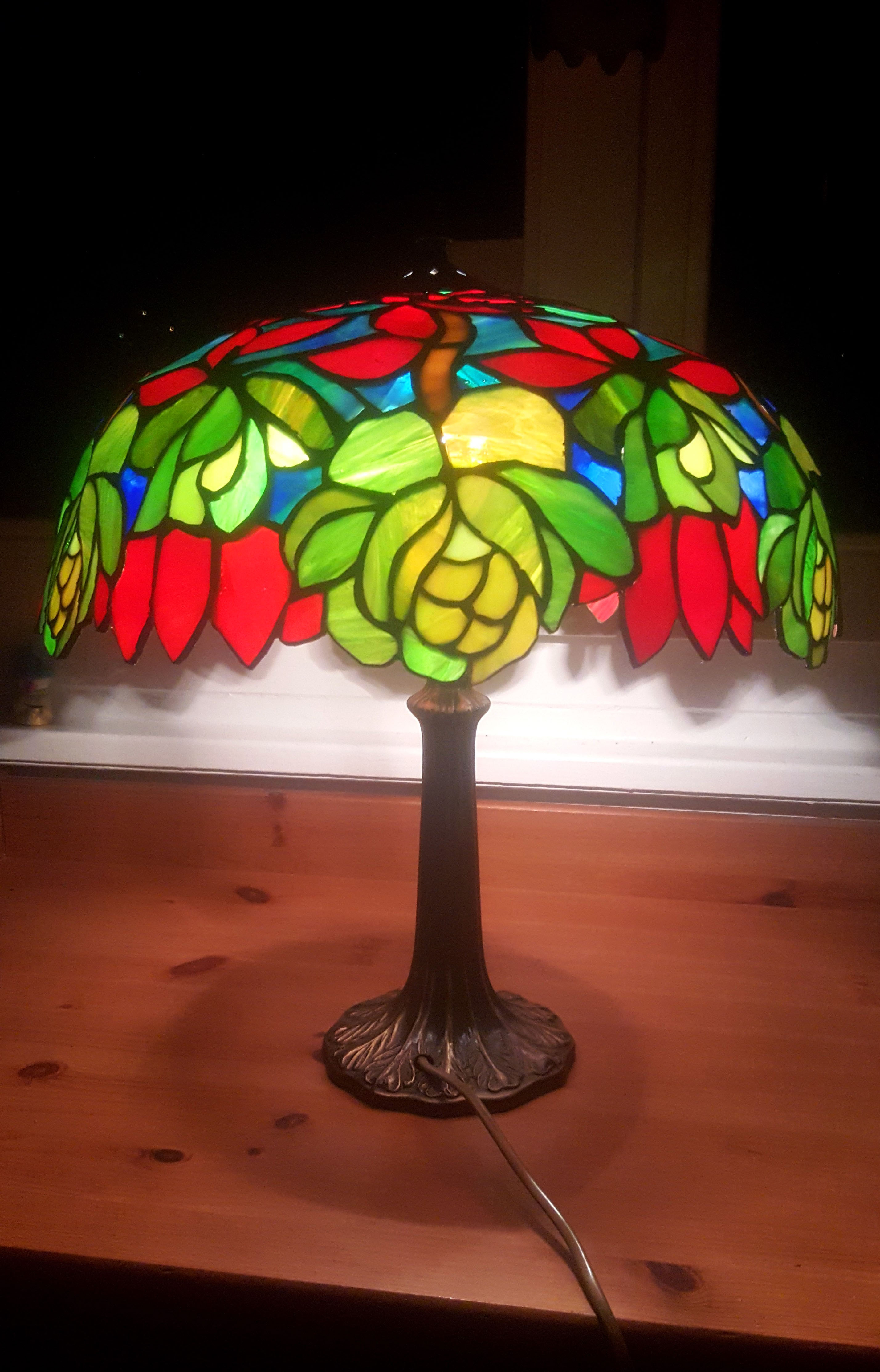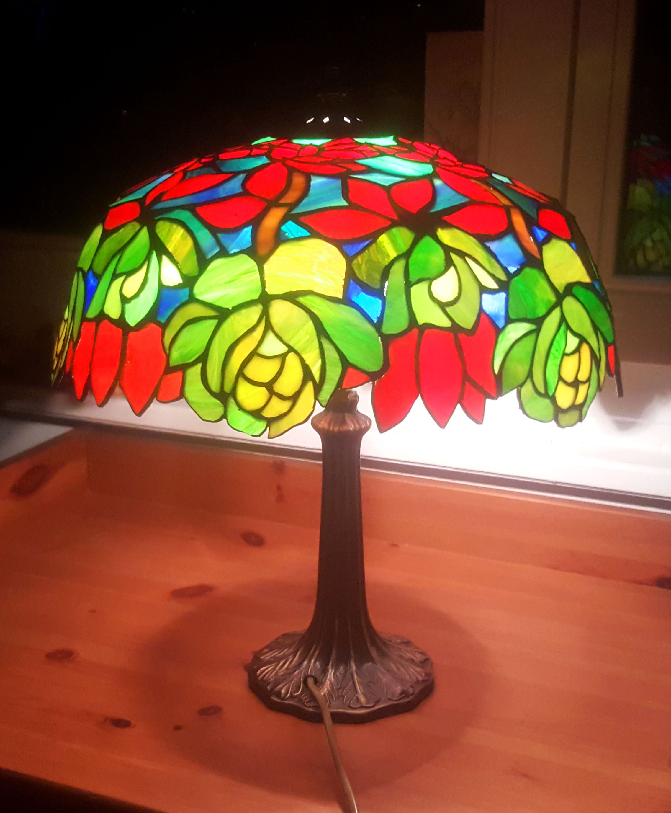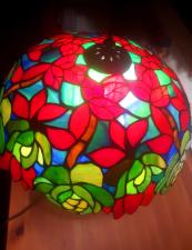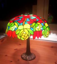 Rendelésre készült részletgazdag filigrán munka, mely olajzöld színben pompázó szecessziós rózsákat és bíbor leveleket ábrázol. Színeiben éppen ellentétesen hasonul párjához, a vörös rózsabokor -lámpához, a megrendelő kérésére a színeket inverzben alkalmaztam. Türkiz hátterével csodásan összehangolt üvegválogatás, mely színes fénybe öltöztet minden teret. A szabályosan ismétlődő minták felülről nézve, mandala alakot formálnak. 650 darabból álló saját tervezésű munka. Talpa értékes rézszínű fémötvözet. Méretei: 40cm átmérőjű búra x 52 cm-es magasság.