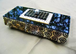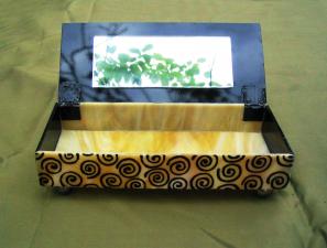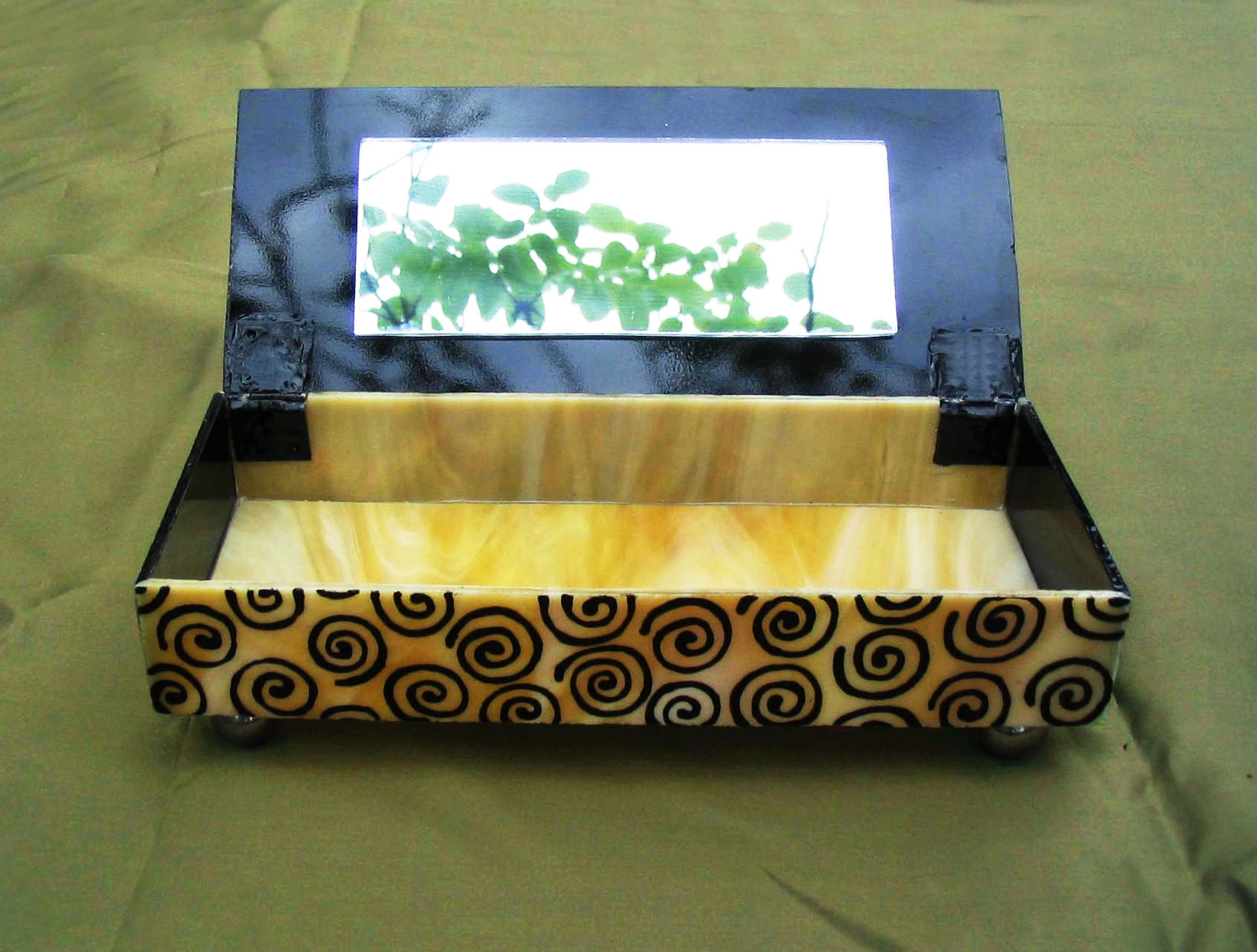 Belülről két oldalt kialakított zsanérral nyitható - zárható, a fedelén belül tükörrel, alul a felső gyönggyel azonos 4 lábbal ellátott. Belső elválasztó rekesszel, bársonyborítással is kérhető.