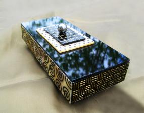 Modern és elegáns ékszerdoboz hölgyeknek. Tetején és alján gyönyörű fémgolyók, csapágyak. Oldalán izgalmas spirális mintázattal, tetején csíkokkal pöttyökkel és más egyéb motívumokkal gazdagított ajándék különlegesség, amely szinte minden korosztály tetszését elnyeri. Ékszerek és kisebb értékek tárolására alkalmas, Bármely különleges alkalomra is fényűző egyedi meglepetés lehet.