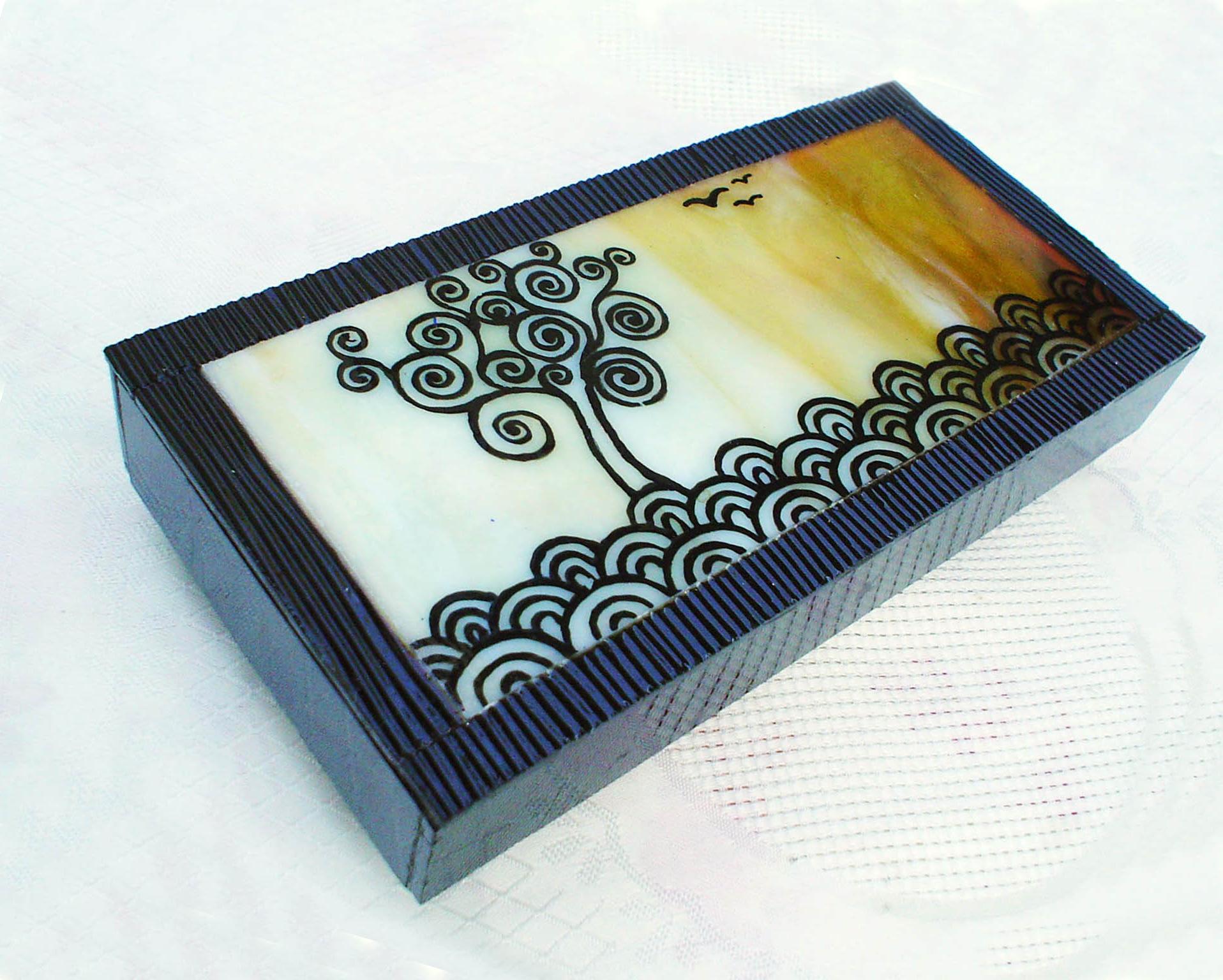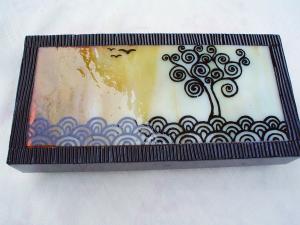 Kellemes vidéki esőt idéz ez a kis dobozka mely madarakkal, fákkal népies motívumaival s a modern fekete-csíkos üvegek keverékével rendkívüli hatást ér el. belül tükröcske.