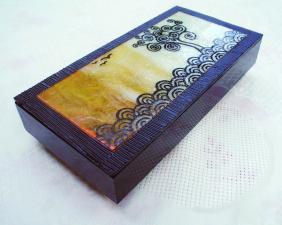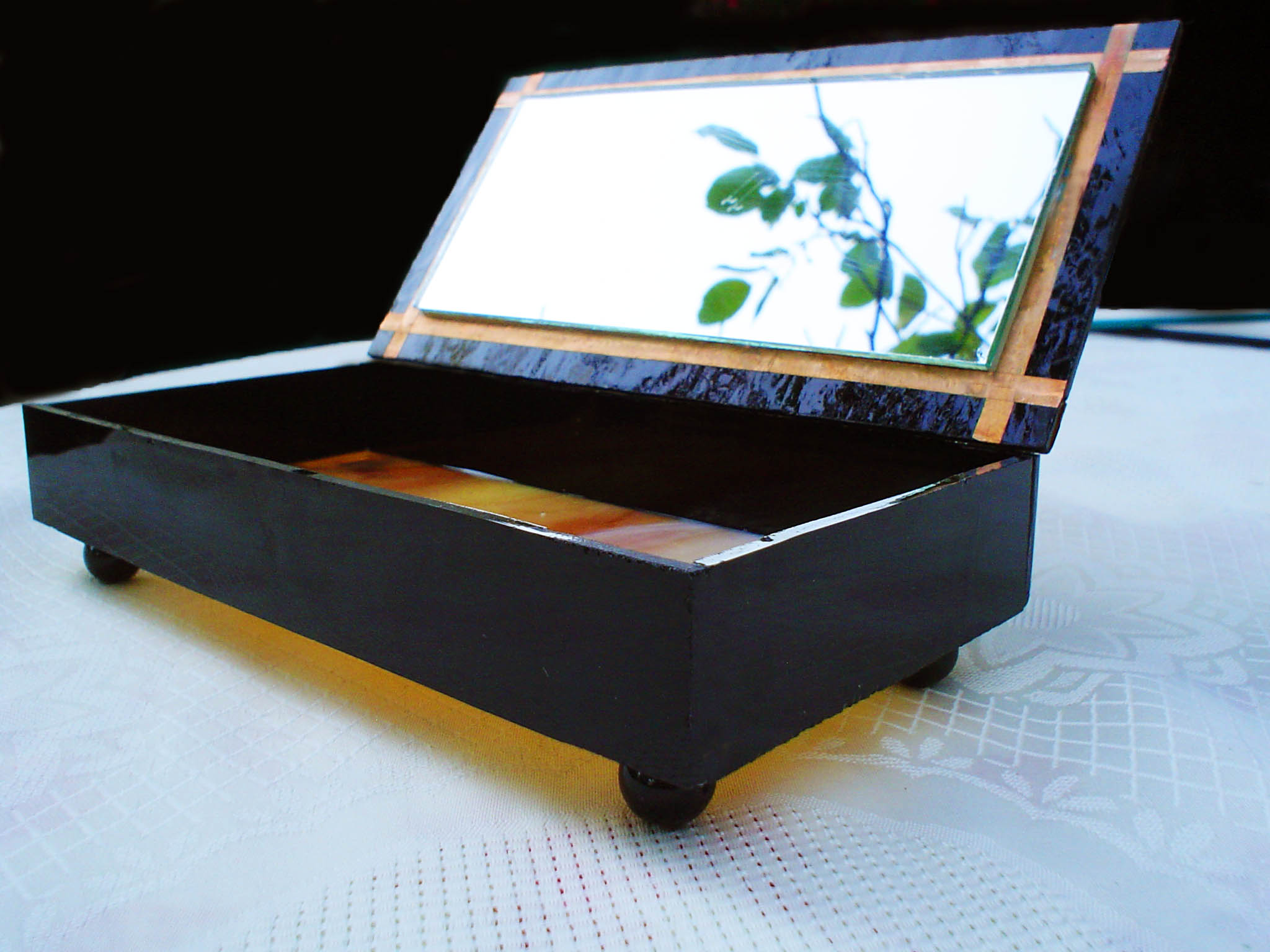 Nagyon dekoratív, zsanérral, üveggyöngy lábakkal ellátva, belső bársonyborítással is kérhető.