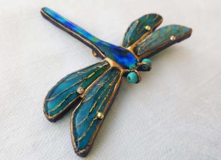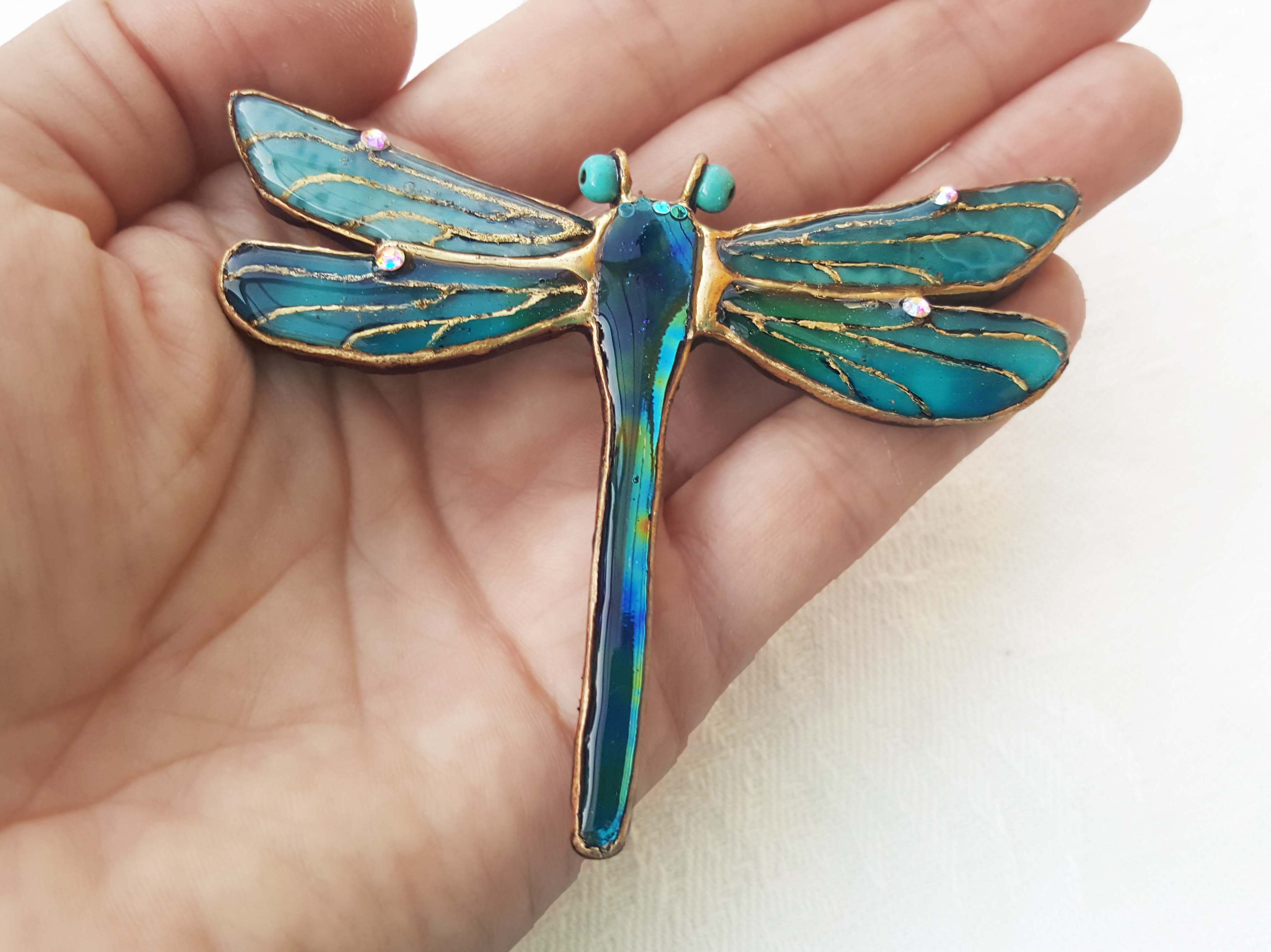 Részletgazdag kidolgozású, gyönyörű bullseye üvegből készült türkizkék szitakötő. Ehhez a munkához ékszerész -precizitás volt szükséges, minden részlete a szárnyak erezetétől kezdve a reá aplikált csillogó strasszokon át nagy figyelmet és szeretetet igényelt. Végezetül 3D üveglakkal domborúra száradt, mely mégjobban kiemelte a csillogó üvegfelületeket. Folyékony fémmel aranyoztam, de galván-bevonat is kérhető rá rezezve, ezüstözve, de (felárral) valódi aranybevonattal is, sőt külön utánajárásra a köveknek is kérhető cirkon.
