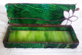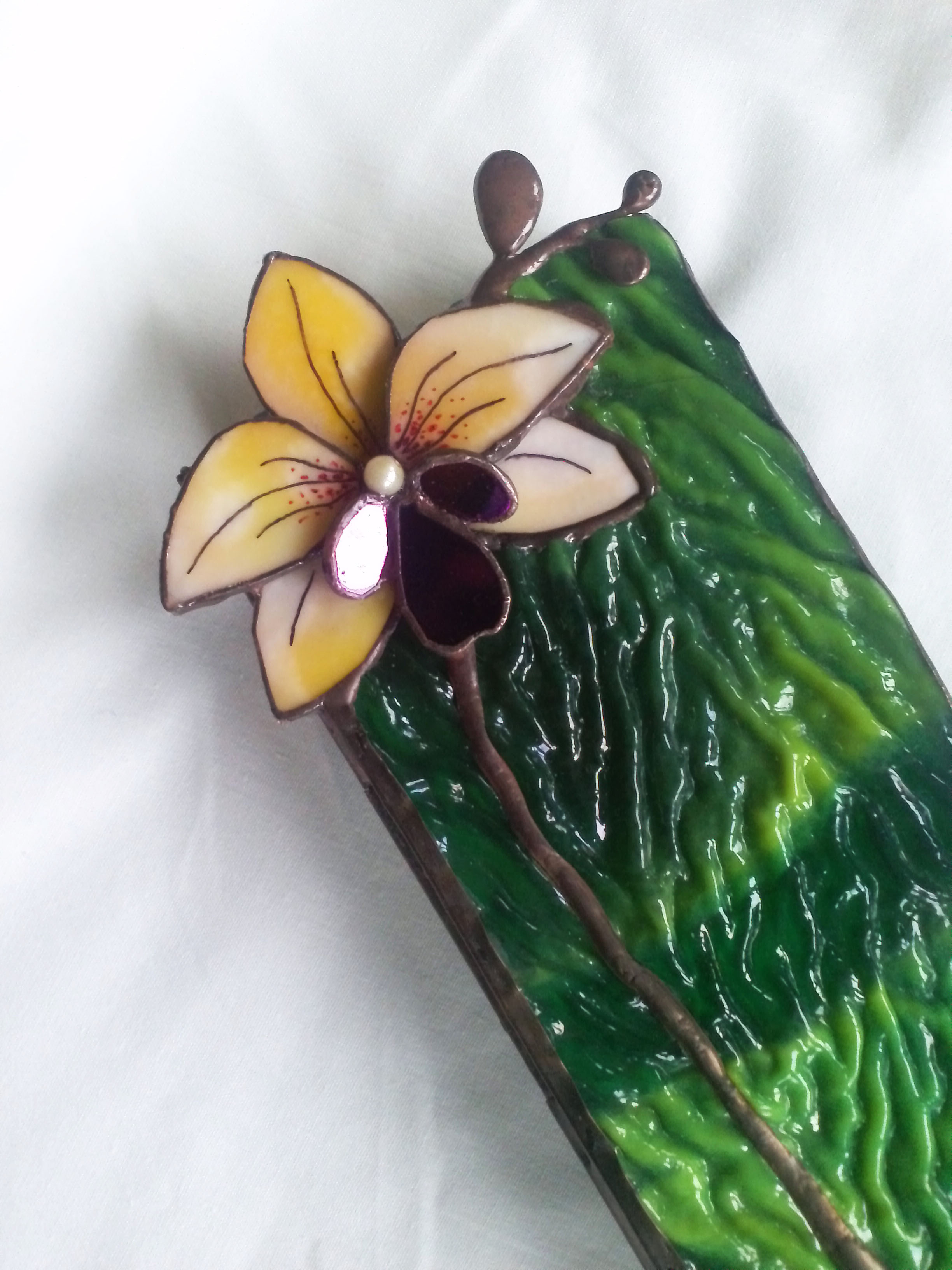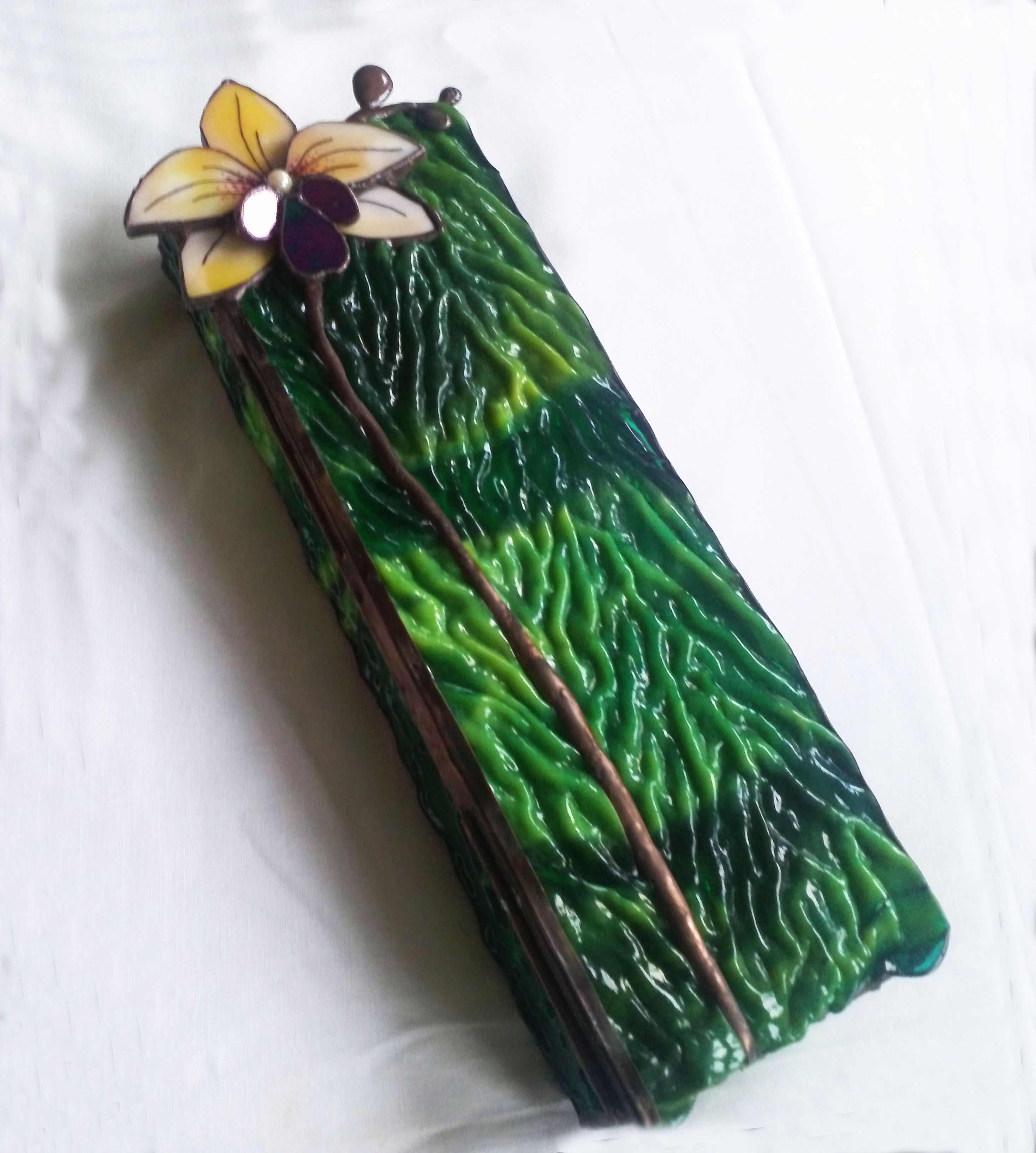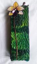Dús, buja zöld színű szépen strukturált, hullámos fedelű üveg alaphoz társítottam egy sárga, trópusi orchideát. Egzotikus hangulatú, színes és tele van élettel.
