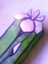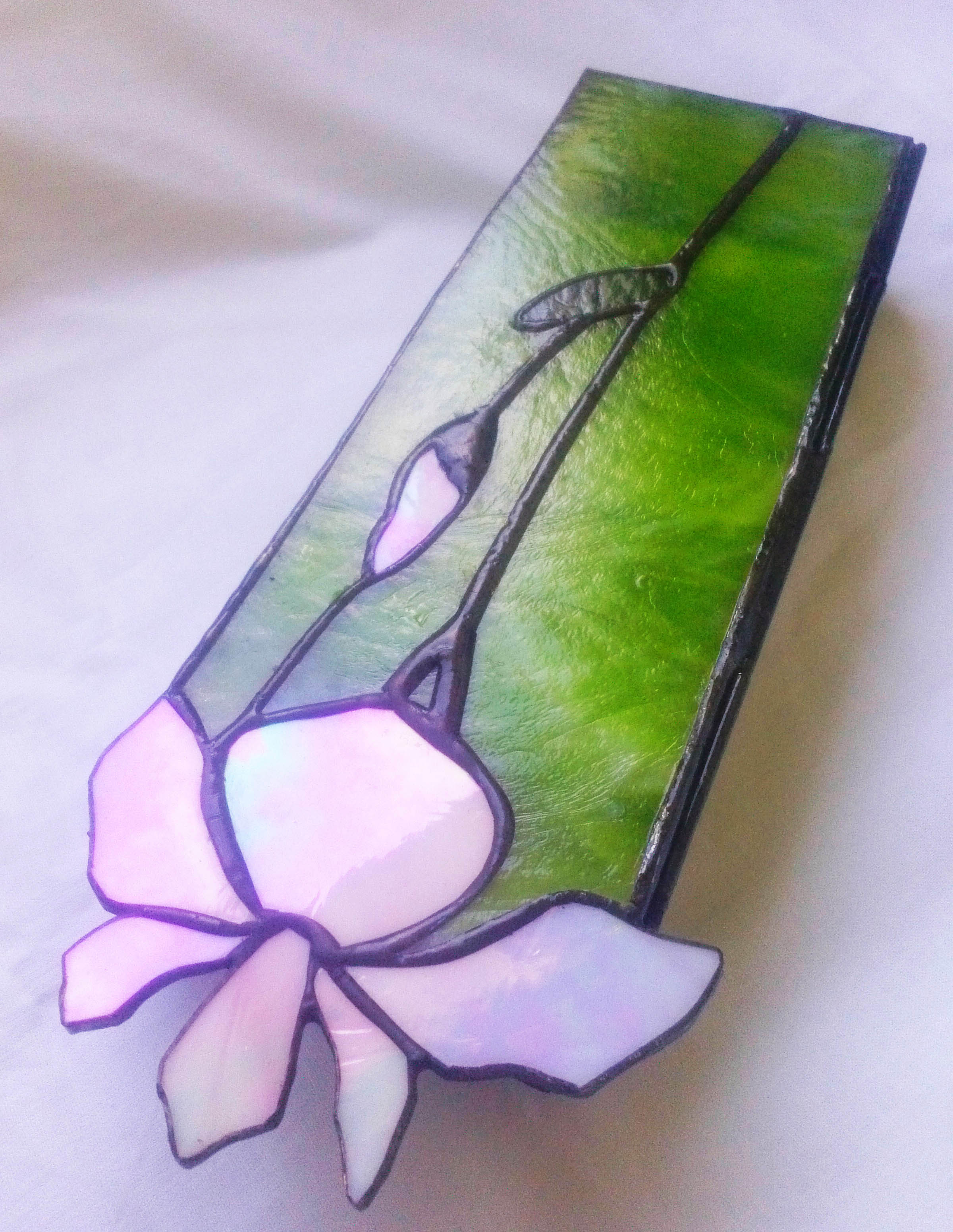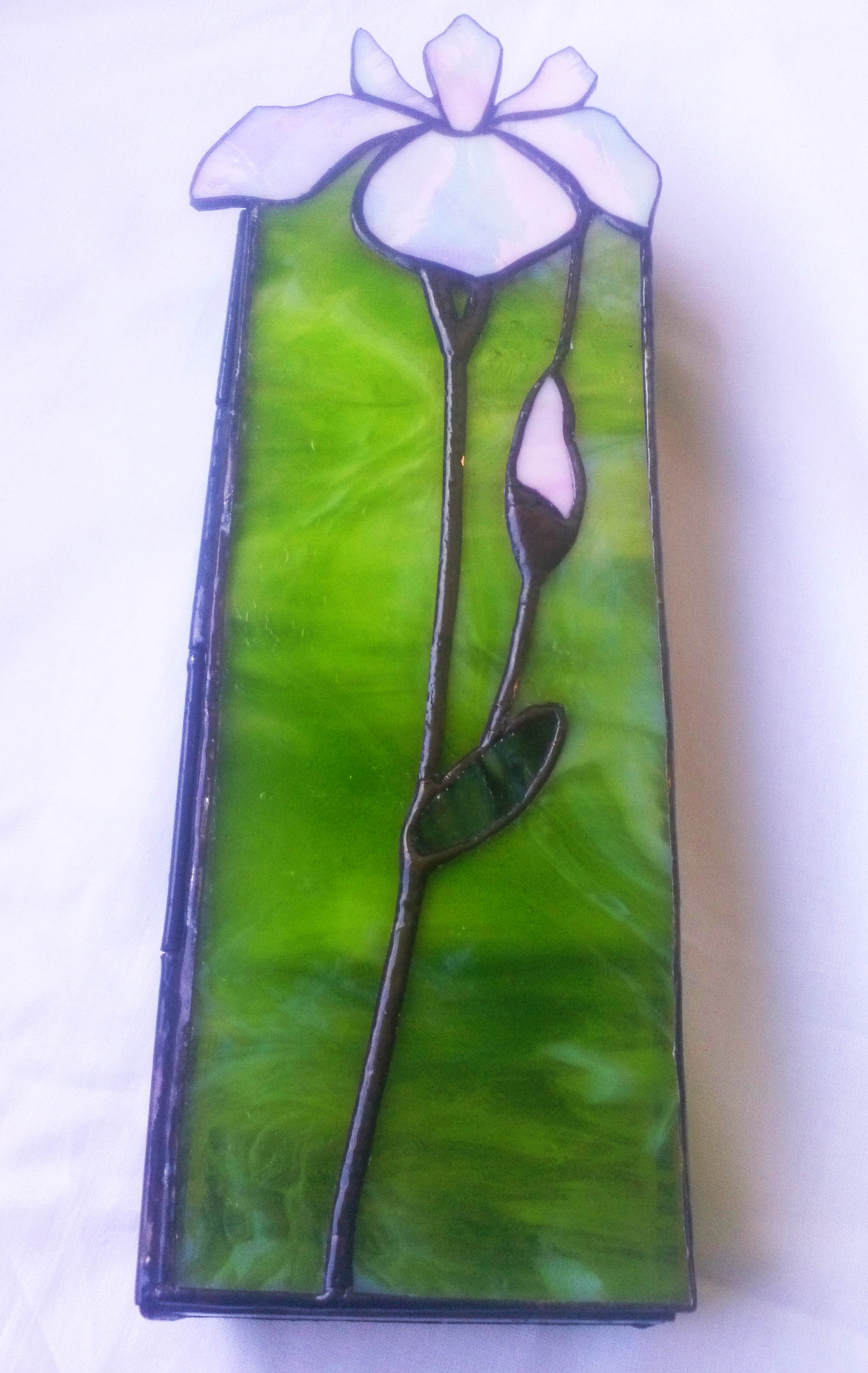 Világos fűzöld üveg egy kis szivárványosan fehér nőiességgel párosulva, hölgyek részére kitűnő ajándék. Ékszereket vagy kisebb értékeket lehet benne tárolni. Üveggyöngy talpak, zsanérral nyitható fedő, és üveg elválasztó rekesz is kérhető hozzá a többféle ékszer részére. Aprólékosan elkészített munka. Ajánlom mindazokat, akik szeretik a virágokat, az íriszt s vele együtt a természetessel megegyező hasonló színpompát. A virág színét kérésre bármilyen más színnel is elkészíthetem.