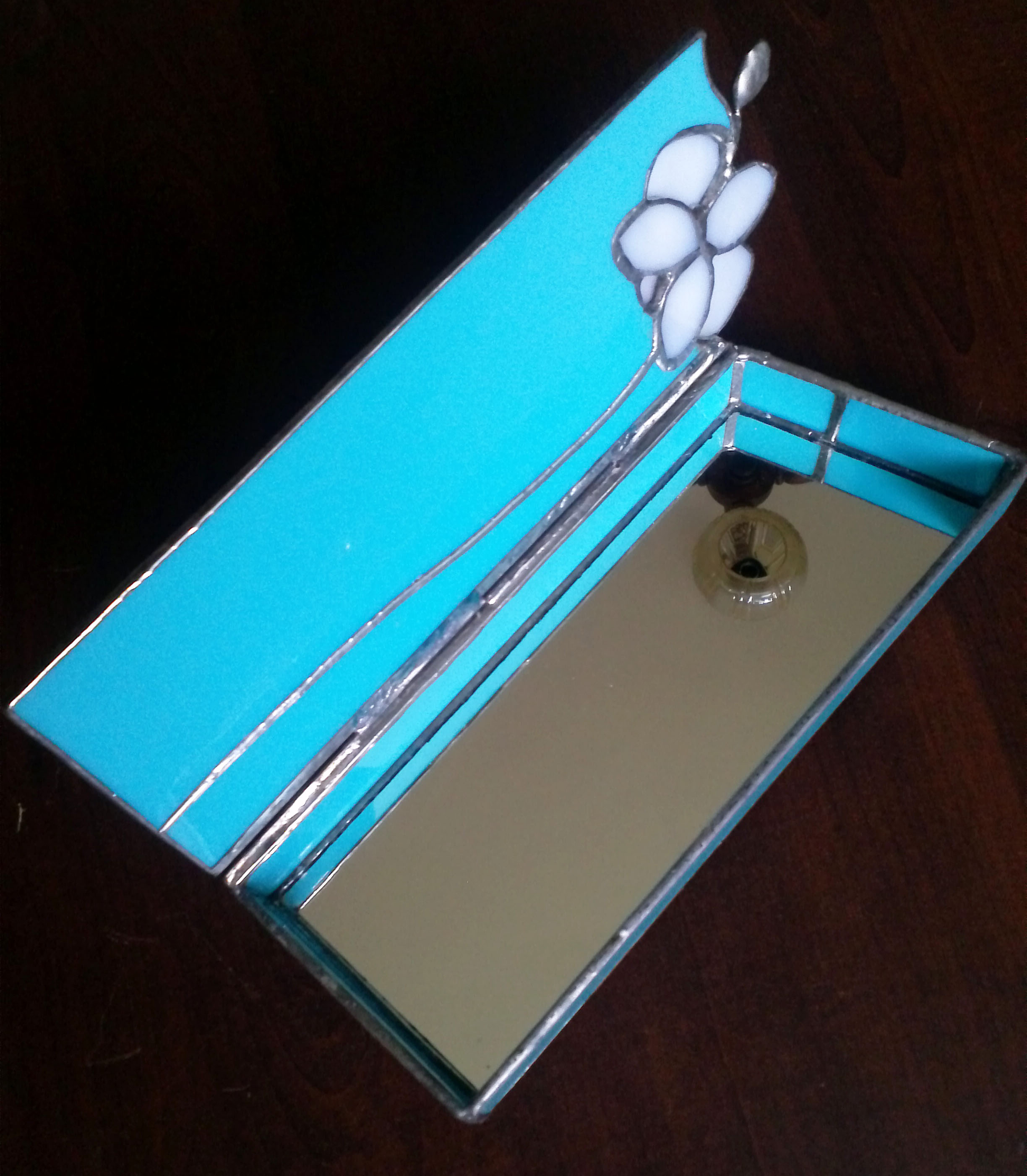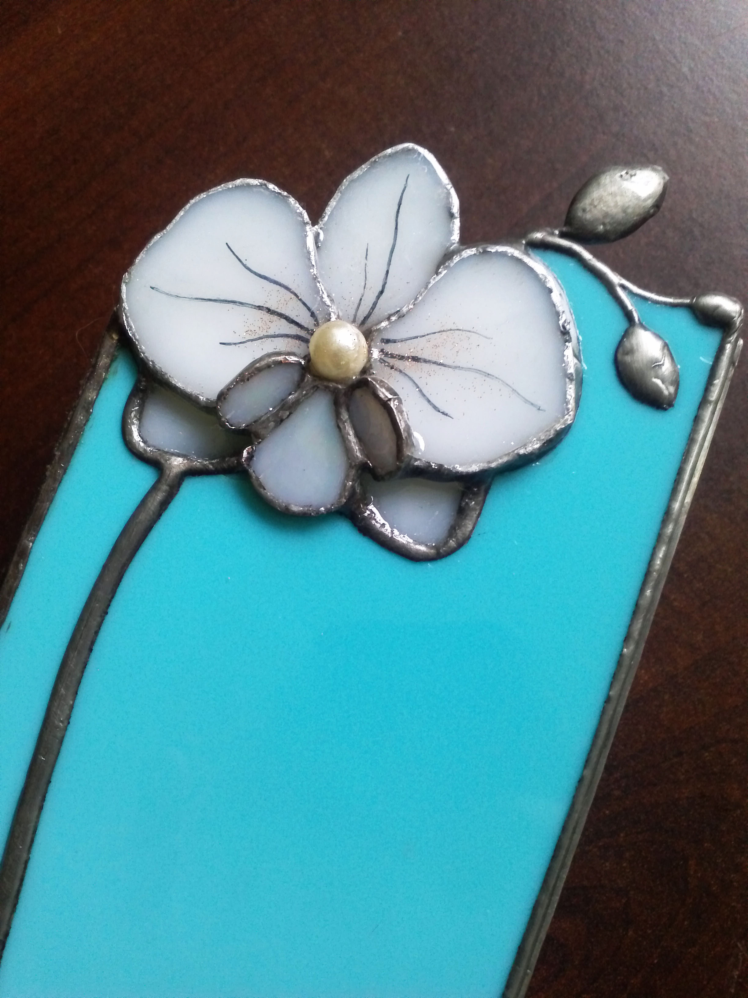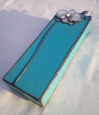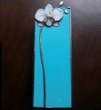 A megrendelő kérésére ciánkék alapon hófehér orchideavirágot készítettem ékszerdoboz formába költve A színe mellé illik a selyem és a gyöngy fénye, ezeket próbáltam meg összekombinálni.