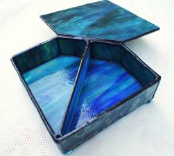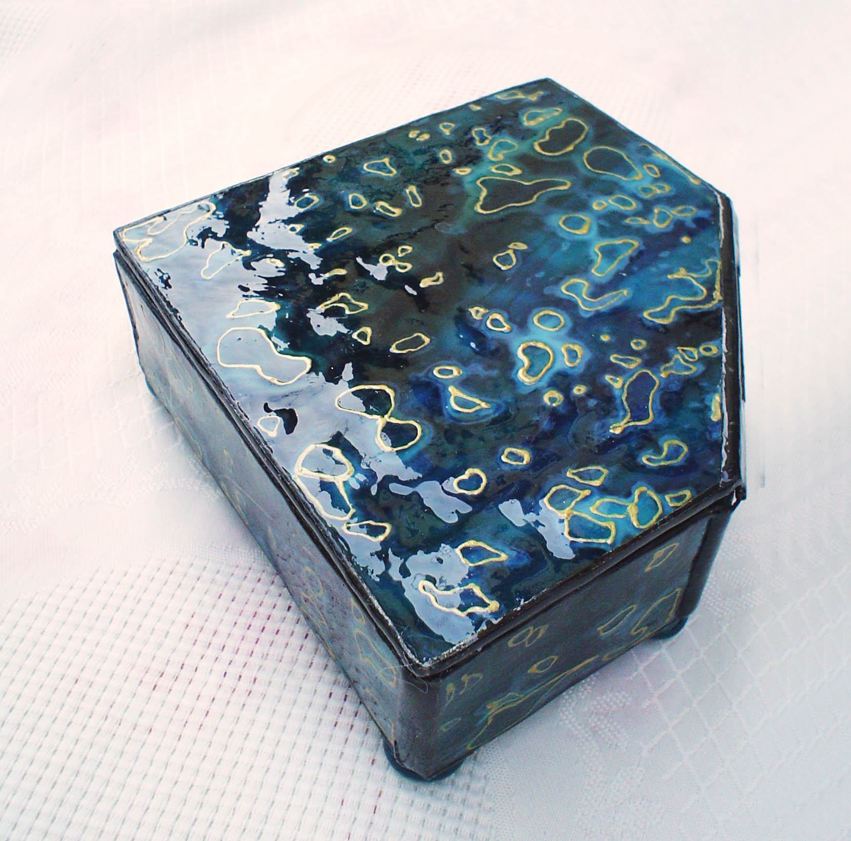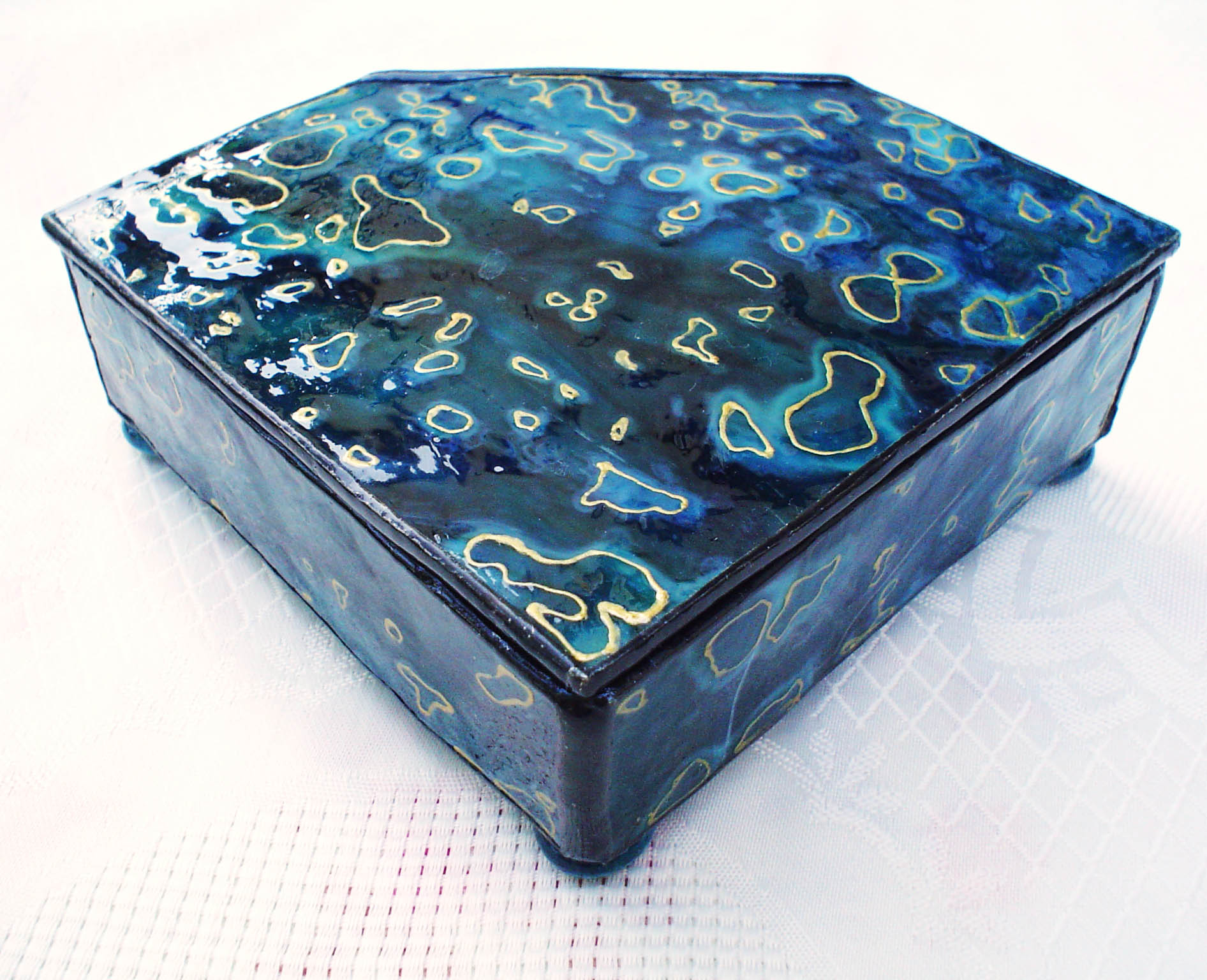A mélységes óceán színeivel, annak minden tüneményével és életével átitatva, kívül arany festés, ami mintha medúzák vagy légbuborékok lennének. Csillogó lakkréteggel van borítva a tartósság érdekében. Belül kivehető üveg elválasztórekesz, ha többféle ékszert szeretnénk benne tárolni.