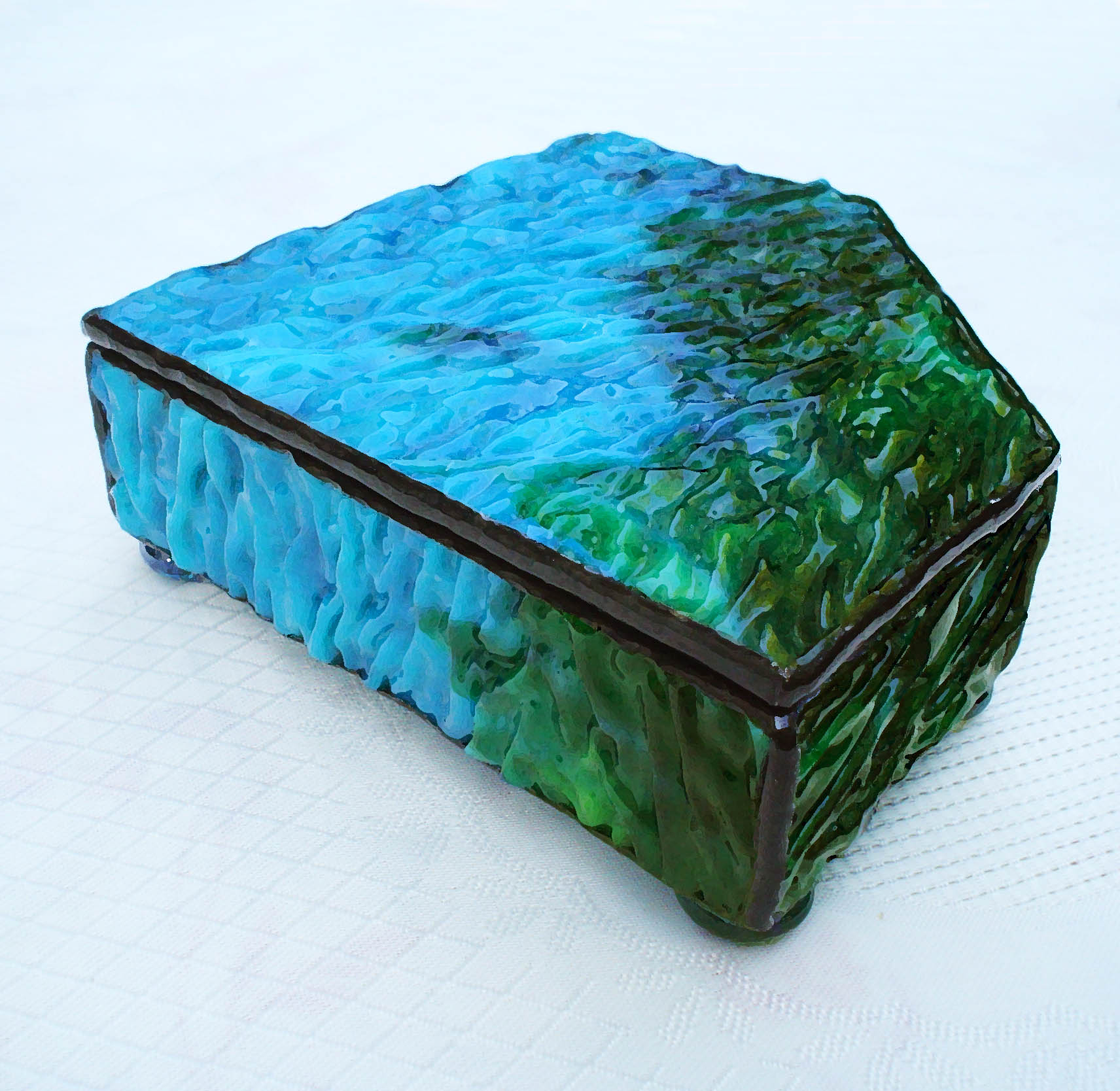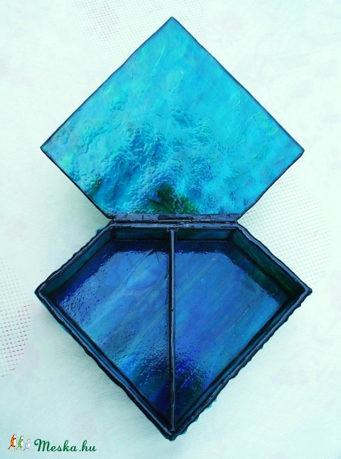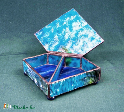 A lagúna kékségével és sekély tengervíz tisztaságával, egy kivételesen szép strukturált felületű üvegből. Belül kivehető üveg elválasztórekesz, ha többféle ékszert szeretnénk benne tárolni. Üveggyöngy talpai vannak.