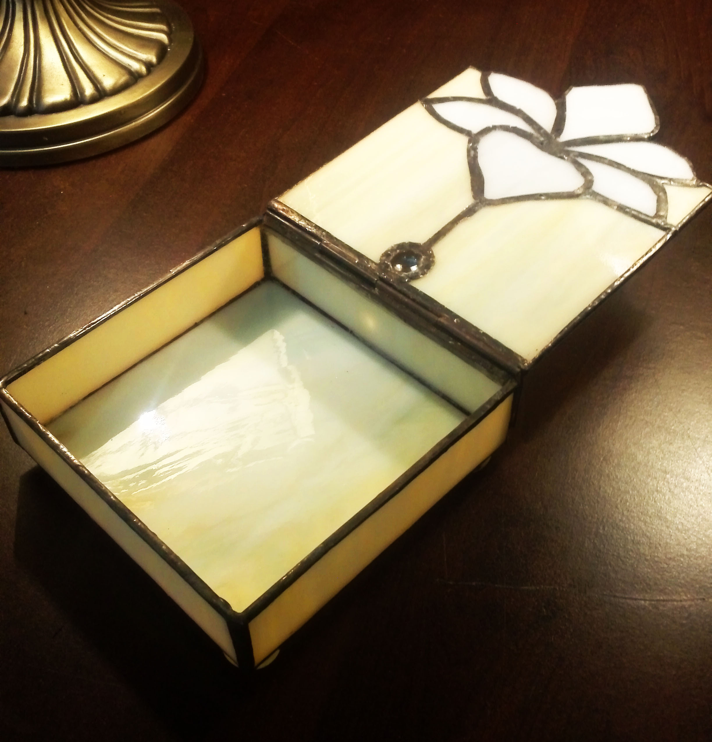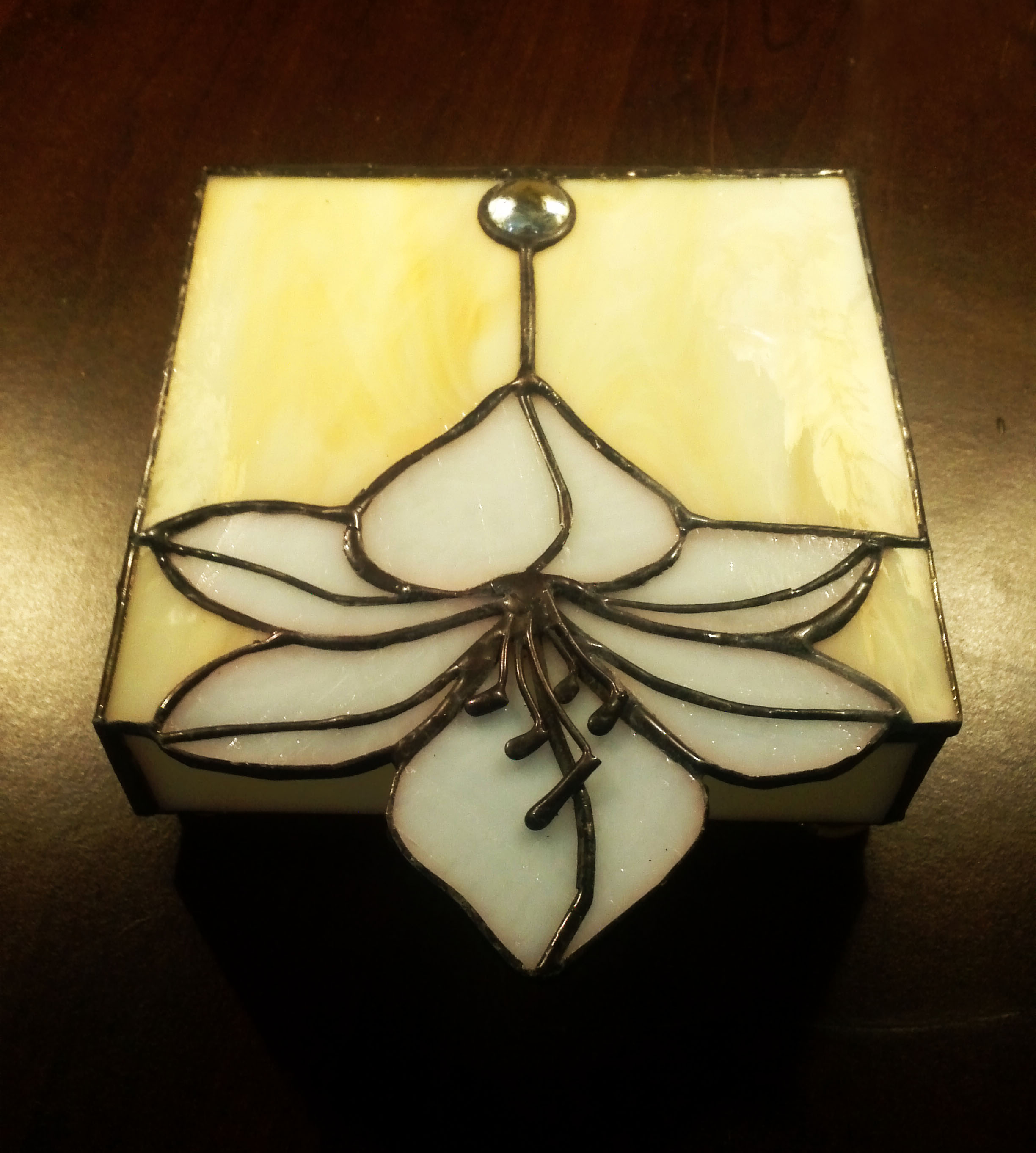Letisztult, nőies, finom színekből és formákból megalkotott ékszerdoboz. Eredetileg a liliomos lámpa szett egyik eleme, hozzá hasonló tiffany lámpát is lehet rendelni. a virág porzói 3D-ben kiemelkednek a dobozból.