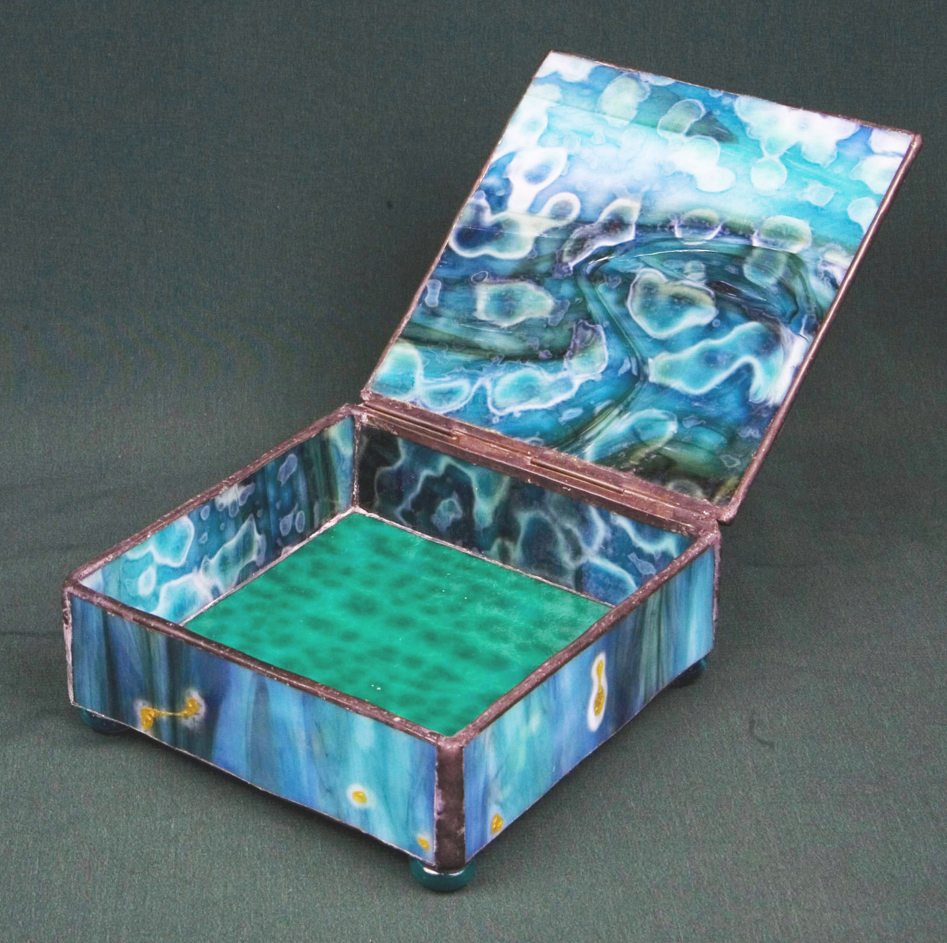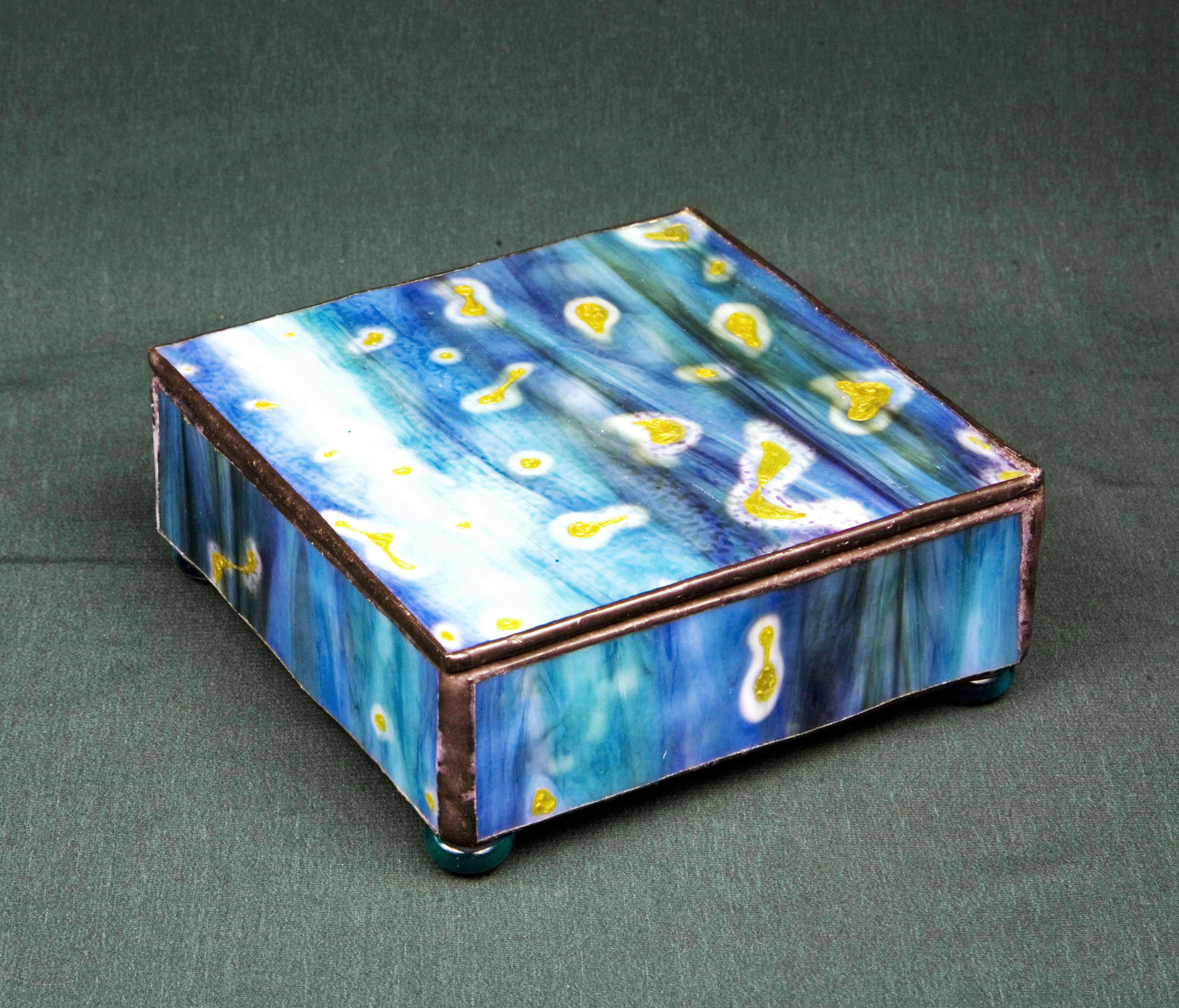 Gyönyörű óceán kék Uroboros üveg, arany gyöngyszemekkel, melyek mintha milliónyi tengeri élőlény vagy gyöngyszemek lennének. Belül üveg rekesszel is kérhető, ha többféle ékszert szeretnénk benne tárolni. Üveggyöngy talpai vannak.