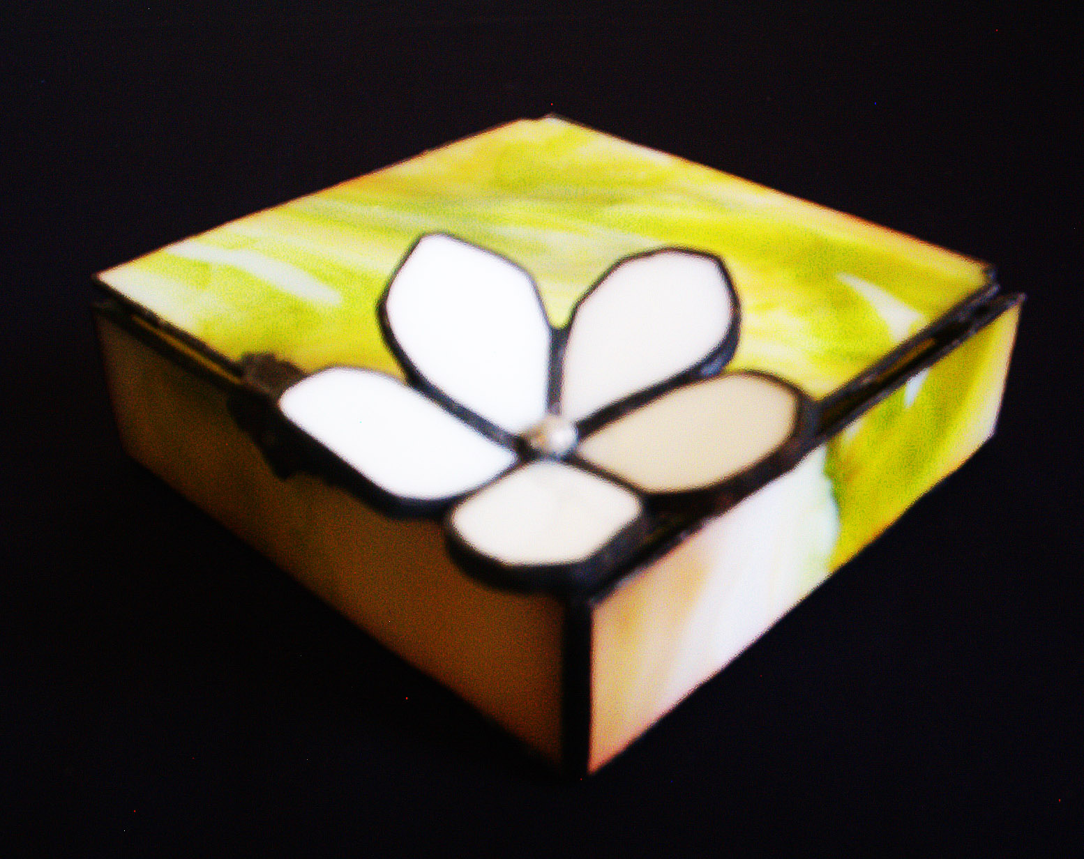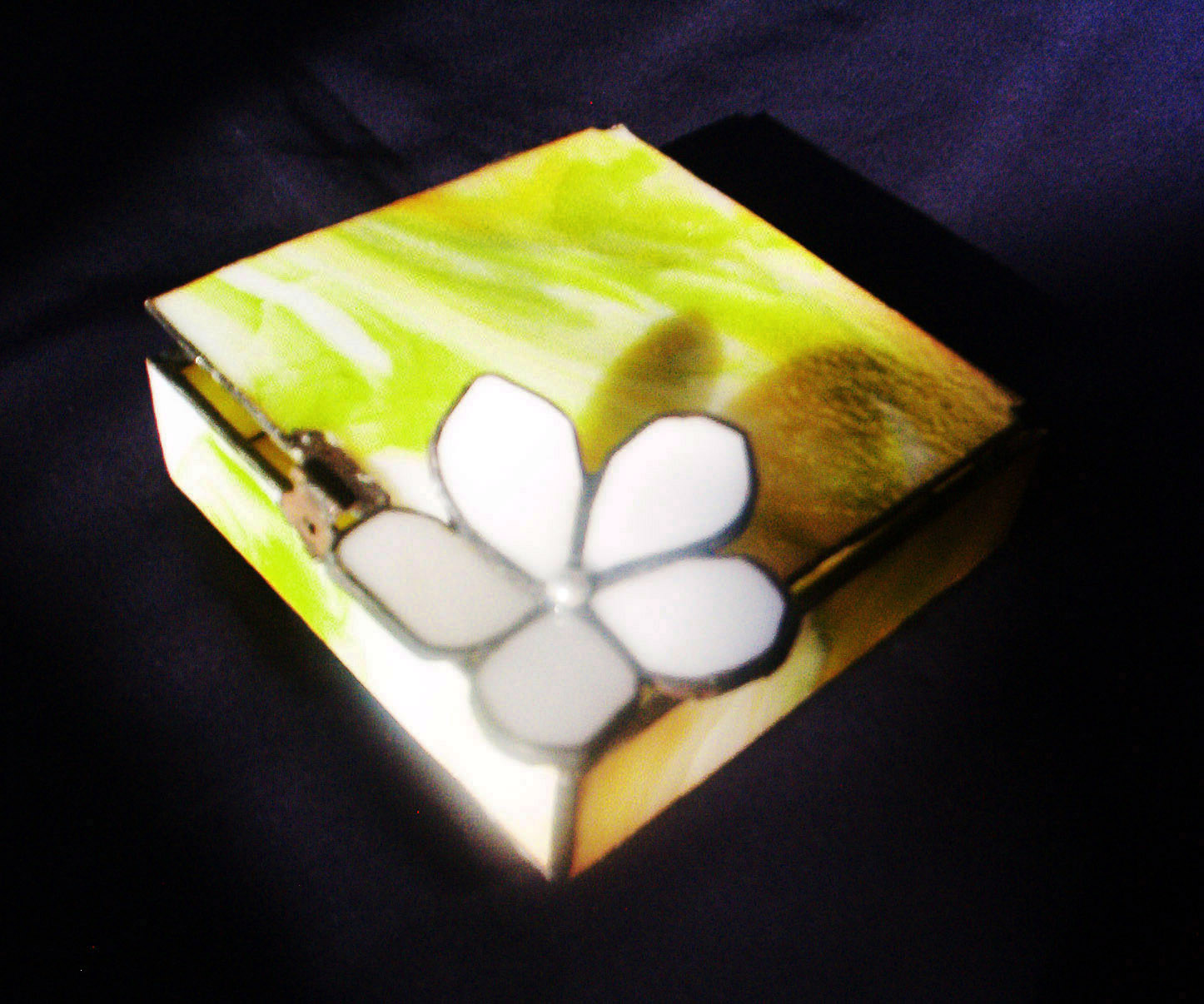 Apró térbeli virág a sarokban, lezárókallantyúval, zsanérral, gyömngy lábakkal ellátva. Lányoknak, hölgyeknek ajánlom és bármilyen színben rendelhető, kék piros... a szemléltetés kedvéért beszerkesztettem egy másmilyen színű képet is. Bársony és fedelet tartó láncocska valamint kis belső tükör is kérhető hozzá.