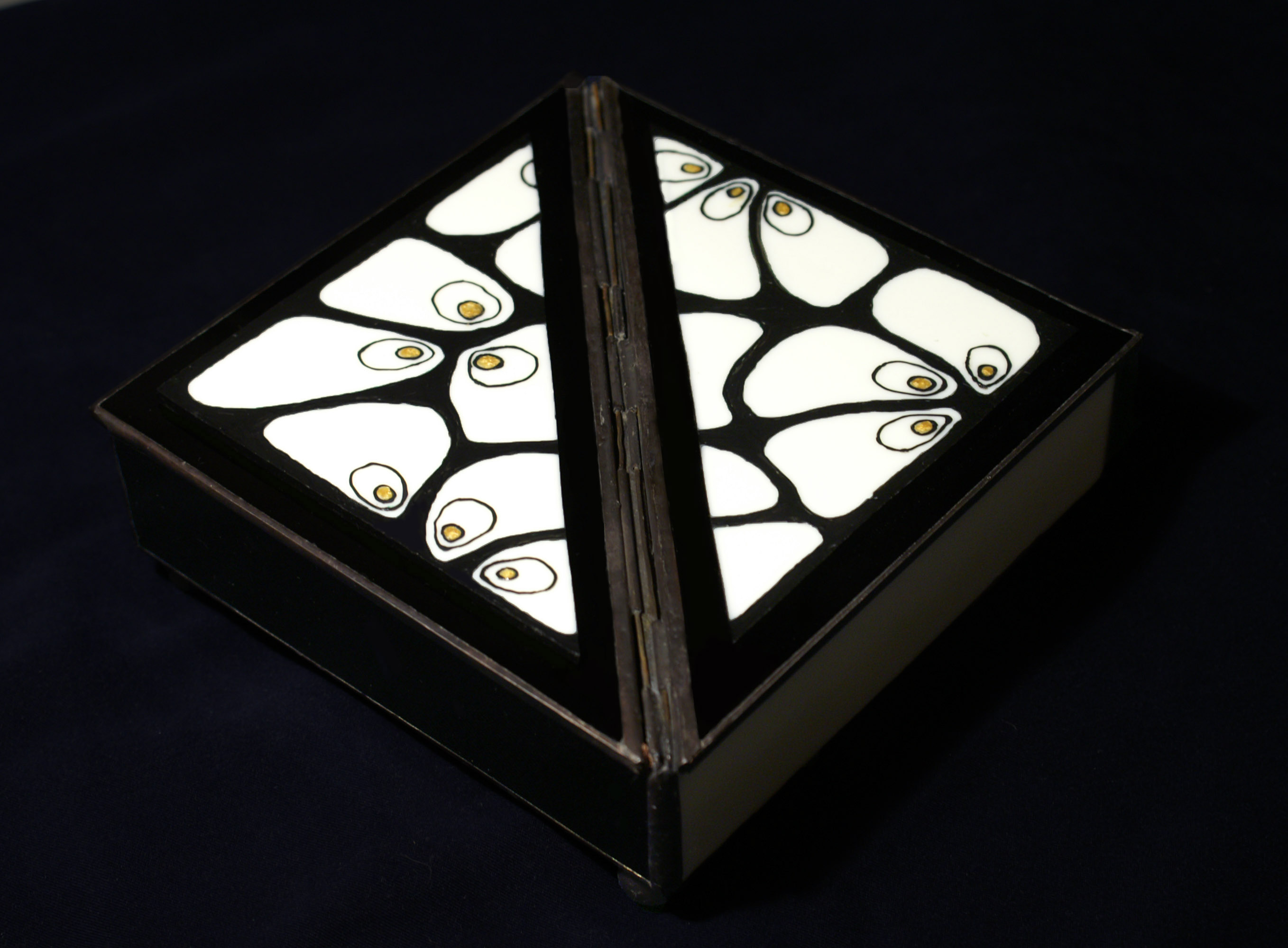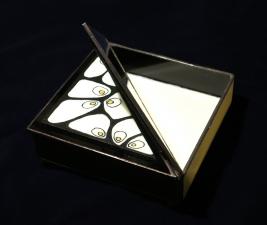 Különleges mintázatú doboz ékszereknek és apró értékeknek. Mindkét oldalán nyílik, egyedi tervezésű, játékos ugyanakkor jellegre modern dísztárgyacska. Egy almacsutka adta az ötletet az elkészítéshez-jobban mondva egy félbevágott alma, ami nagyon jól illeszkedik a fekete és fehér kontrasztjához. Valaki inkább halhólyag motívumot vagy egysejtű élőlények csoportját látja bele, kinek mi...