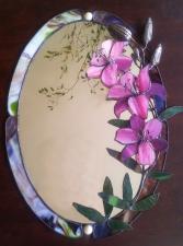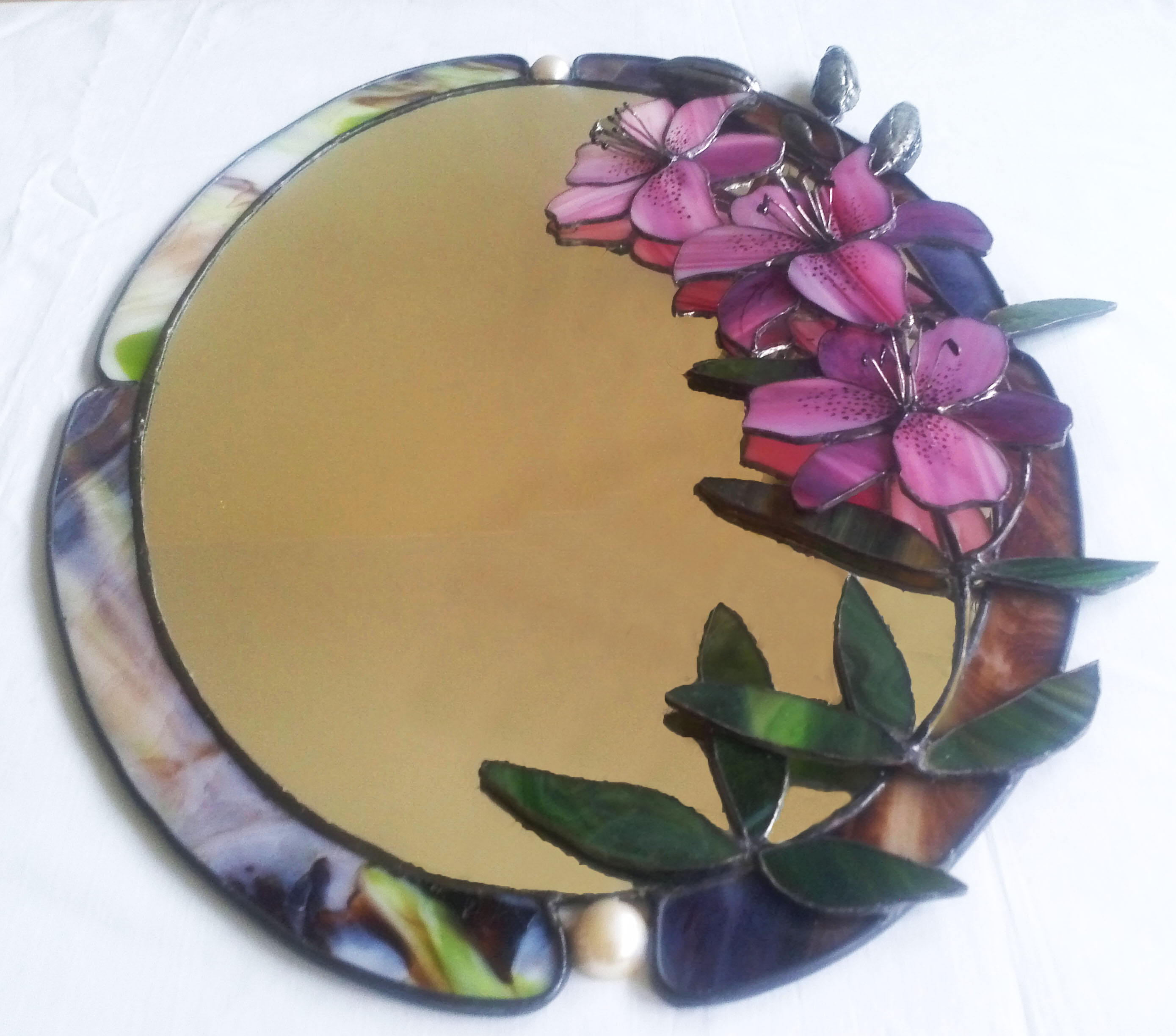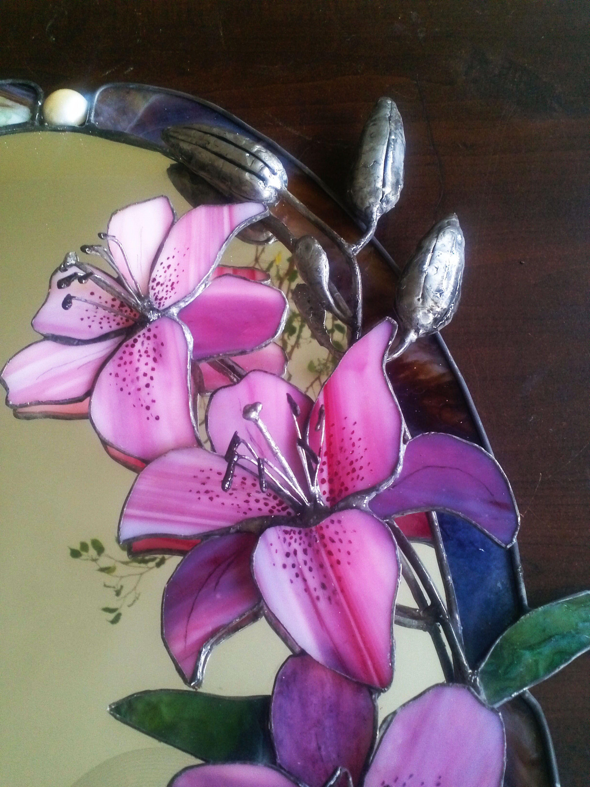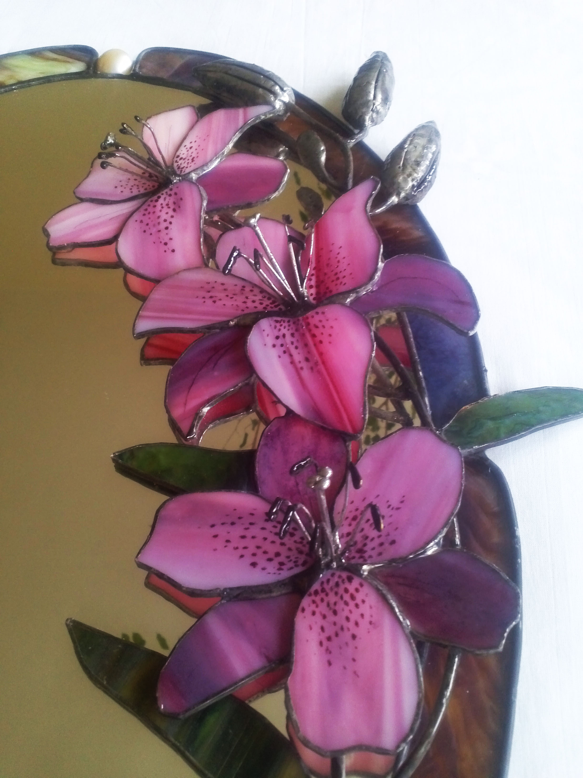 Monumentális tükör, gyönyörű, élethű külsejű és nagyságú királyliliomokkal, melyek térben kiemelkednek a síkból. Valódi 3 dimenziós hatás, fémből konstruált bimbókkal, porzókkal, bibével, mindennel ellátva akárcsak a valódi virág. Színeiben mesés lilásrózsaszín, mellé sötétzöld levelek, fémből készült patinás-ezüst színű bimbók, háttérüvegnek visszafogott barnás fehér üveg. A tükör tetejét és alját egy-egy nagyméretű gyöngy díszíti. Megrendelésre készült darab.