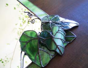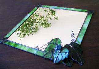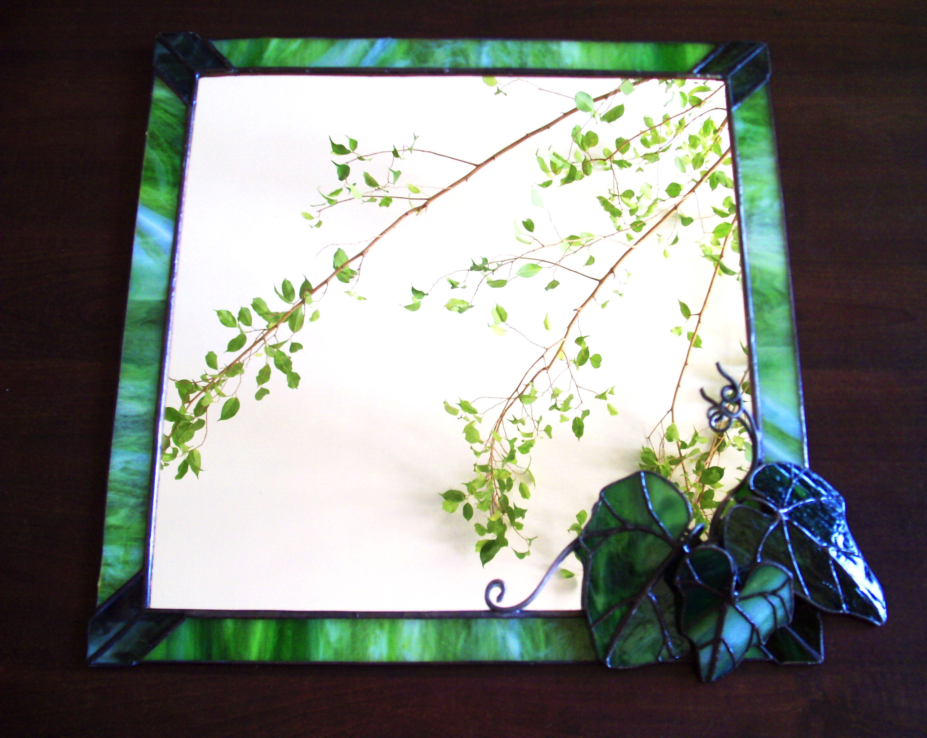 Hogy ne csak kívül legyen a falakon. Ez az elbűvölően egyszerű és puritán levélcsokor sokak kedvence lehet, mert a borostyán nagyon romantikus hangulatot ébreszt. Térbeli levelekkel, hogy egy kicsit megfoghatóbb legyen a természet. Üde levélzöld színben. Természetesen mint minden tiffany tárgy ennek is minden darabja táblaüvegből egyenként van kivágva, csiszolva, fóliázva és forrasztva, hogy végül ez legyen a végeredmény. (A tükör formája és mérete kérésre változtatható).
