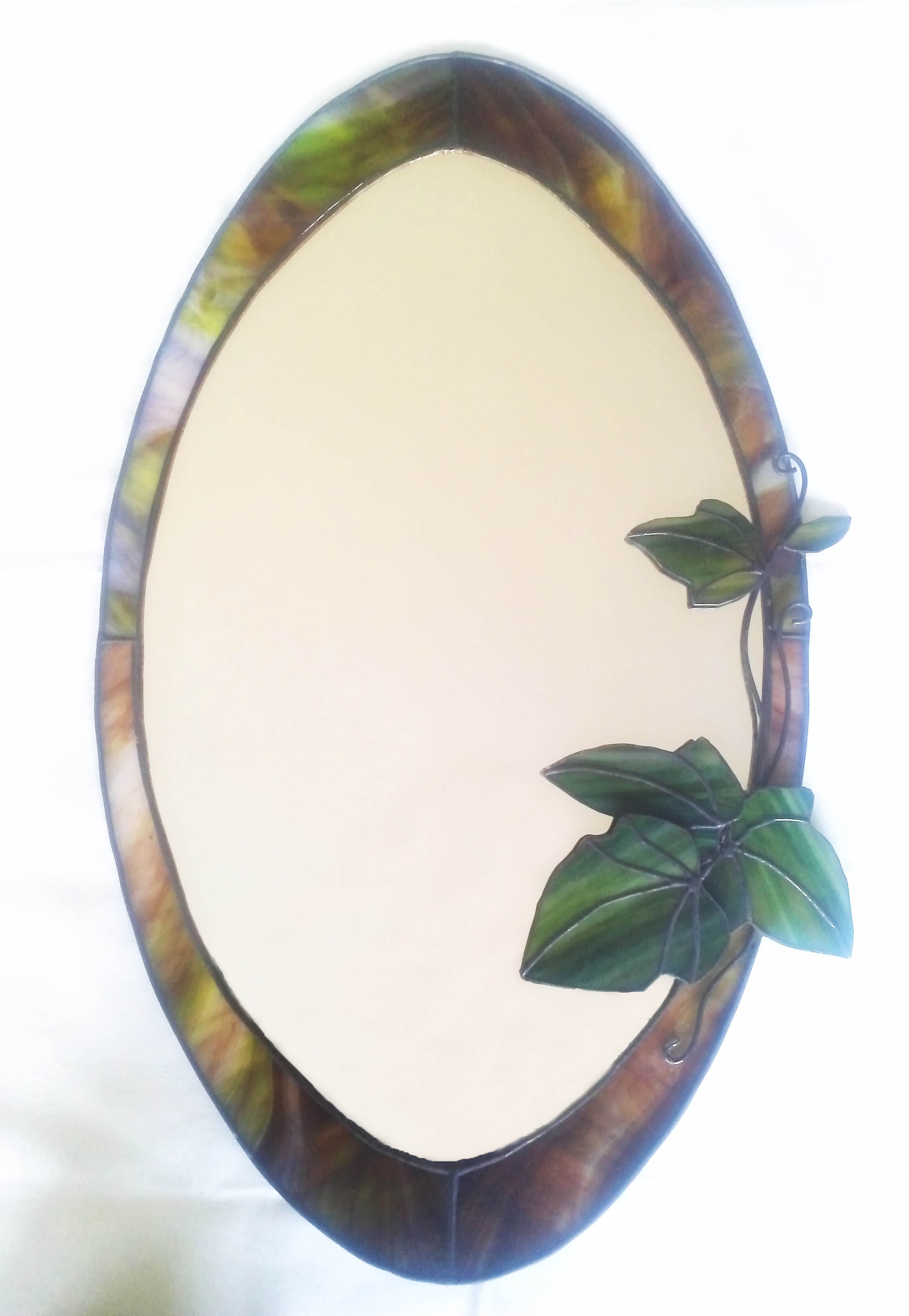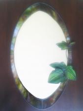 Karakteres ovális forma szolid díszítéssel, néhány egyszerű borostyánlevéllel, hangulatos, nem hivalkodó. Szépségét a forma és az egyszerű dekorációs elemek teszik teljessé. Nagy méretű tükör.