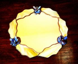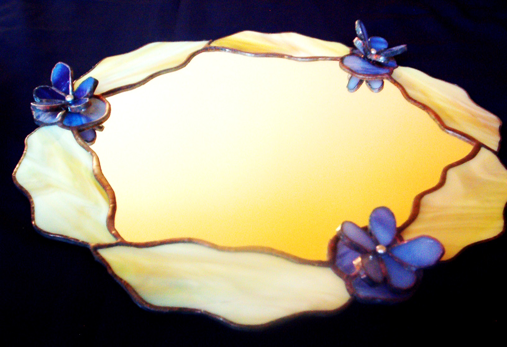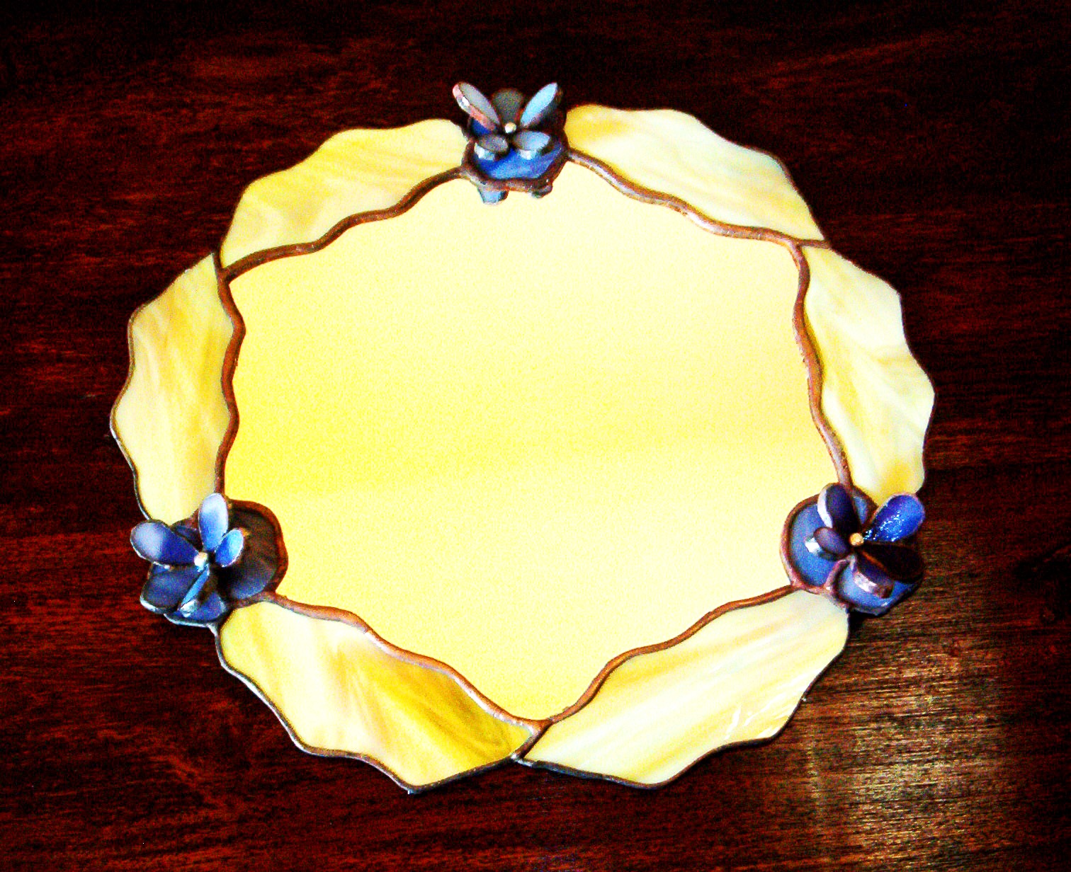 Egy füzérnyi kedvesség azoknak, akik szeretik a természetet és az időtálló értékeket is egyszerre. Saját terveim alapján kombináltam össze ezt a bájos térbeli tiffany ibolyacsokrocskát a kör alakú tükörrel. Elkészíteni és birtokolni is nagy öröm és vidámság. Színes és élettel teli, ugyanakkor lányos és nőies, van egy finom diszkréció benne akárcsak az igazi ibolyában, ami szelíden bújik meg az erdők avarában. Gyönyörűbb és kedveskedőbb ajándék nem is kell.