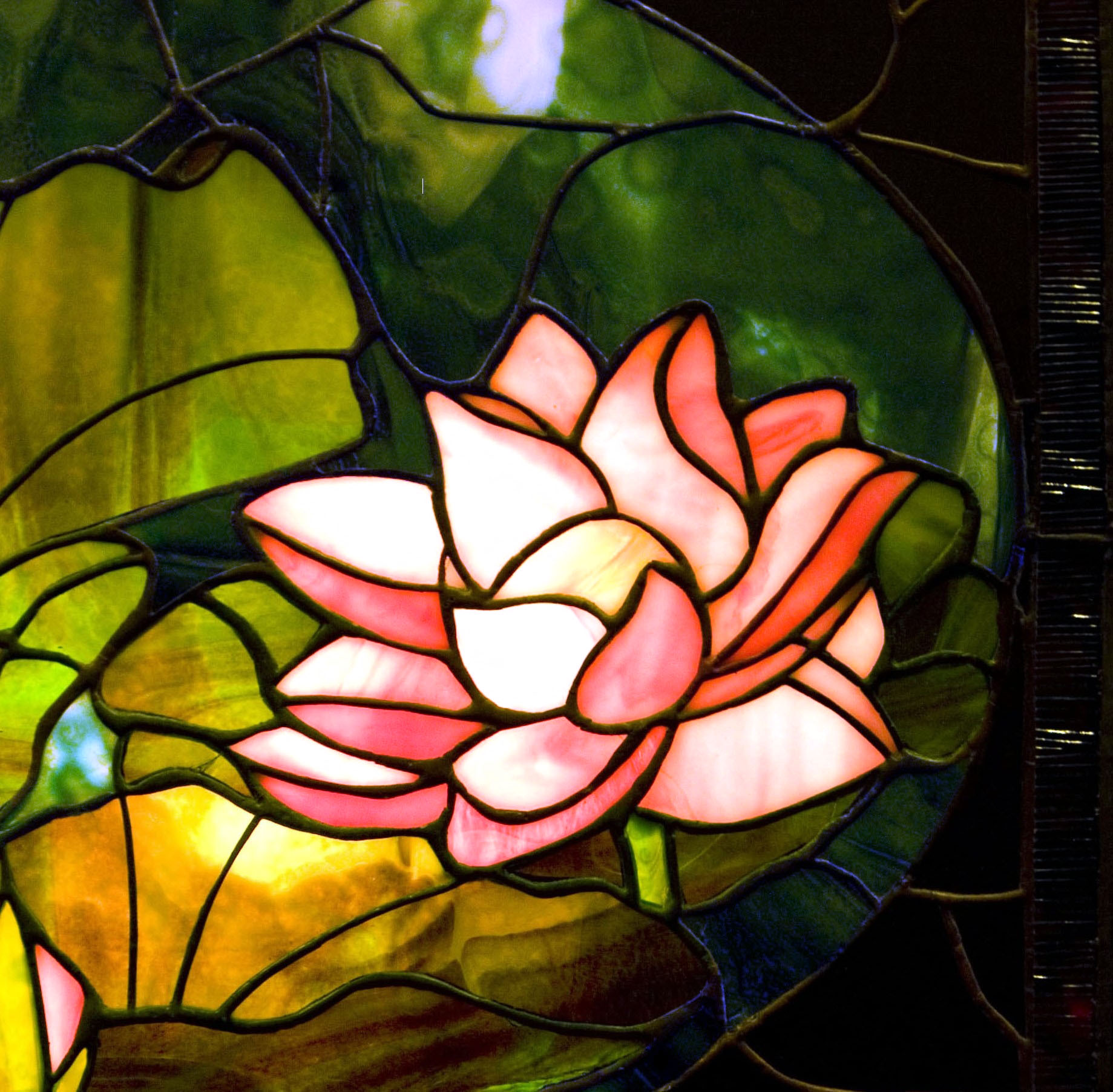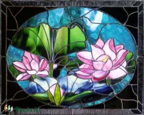 Szikrázó, fényes és elegáns lótuszvirágok egy illatos tavon. Kecses és természetes formák, sugárzó színek és fények egy gyönyörű VILÁGÍTÓ!!! faliképen, amely a lakás és egy előkelő nappali legbecsesebb ékessége lehet. Eredetileg Robert N. Oddy tervei apján dolgoztam tovább ezt a témát. Minden egyes üvegdarabot egy nagy üvegtáblából vágtam ki, egyenként megcsiszoltam és foglalatuknál fogva illesztettem és forrasztottam össze őket. Az ötlettől és tervrajztól a végső kivitelig fb 3-4heti munkámba tellt ennek a képnek az elkészítése, melyhez egy különleges szintén saját fejlesztésű 5 mm vastag világító fénypanelt is hozzászereltem, ennél fogva a képnek saját fénye van, falra rakva egy apró kapcsolóval fel és lekapcsolható. Energiafogyasztása kb annyi, mint egy monitornak, vagyis elég takarékos. Nagyon szép és élénk, élettel teli ez a kép, bármilyen környezetben csodásan mutat. Kiváló ajándék egy különleges alkalomra, házassági évfordulóra, házavatóra, esküvői ajándéknak, vagy csak úgy magunknak egy kis fényűzés. - (szószerint)