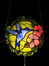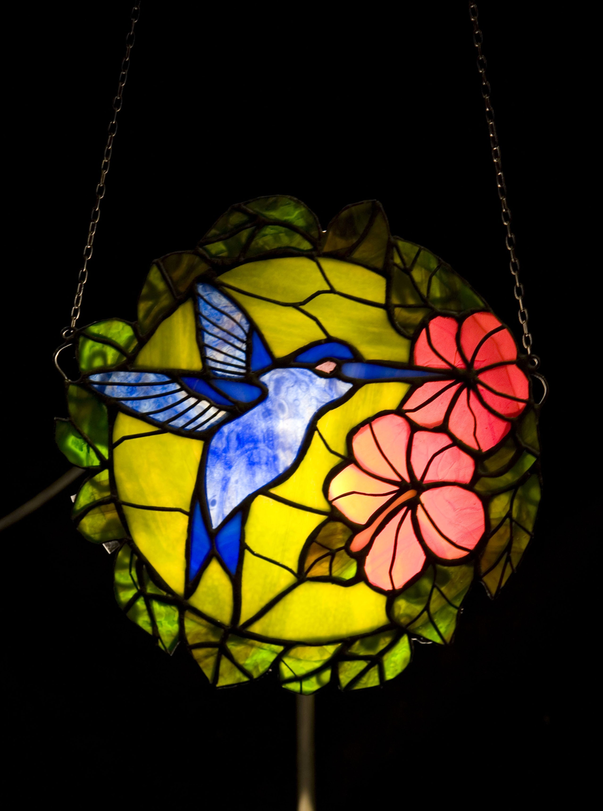Akárcsak a déli napsütötte vidékek és fülledt trópusi őserdők vibrálása, úgy ennek a képnek is nagyon élénkek a színei így napfény nélkül is elképesztően dekoratív, pláne ha fényben tündököl. A kolibri fejbúbján, szárnytövein és farktollán irizált kék üveget raktam, hogy méginkább hasonlítson az élő kolibrimadár fénylő színeire.