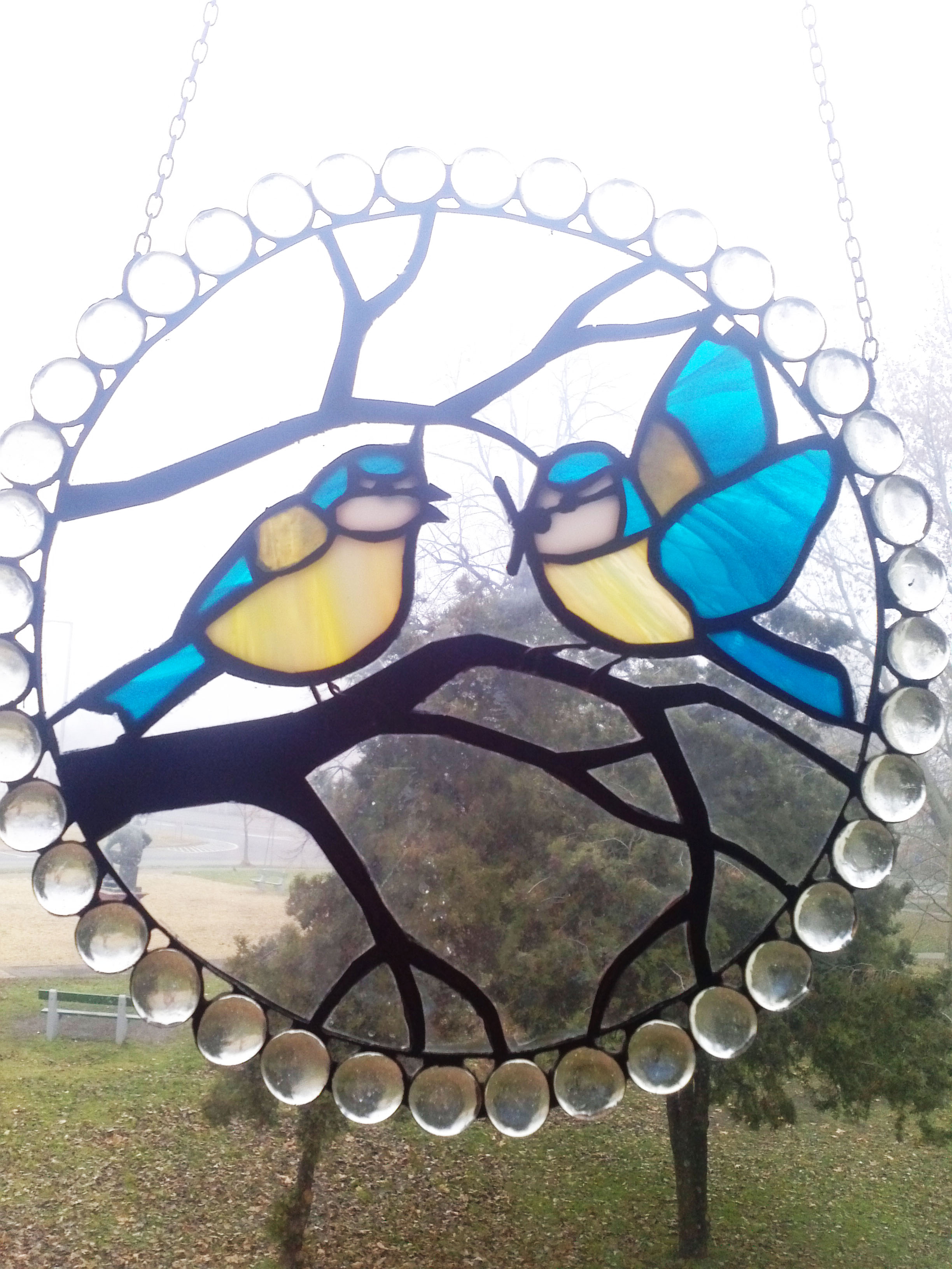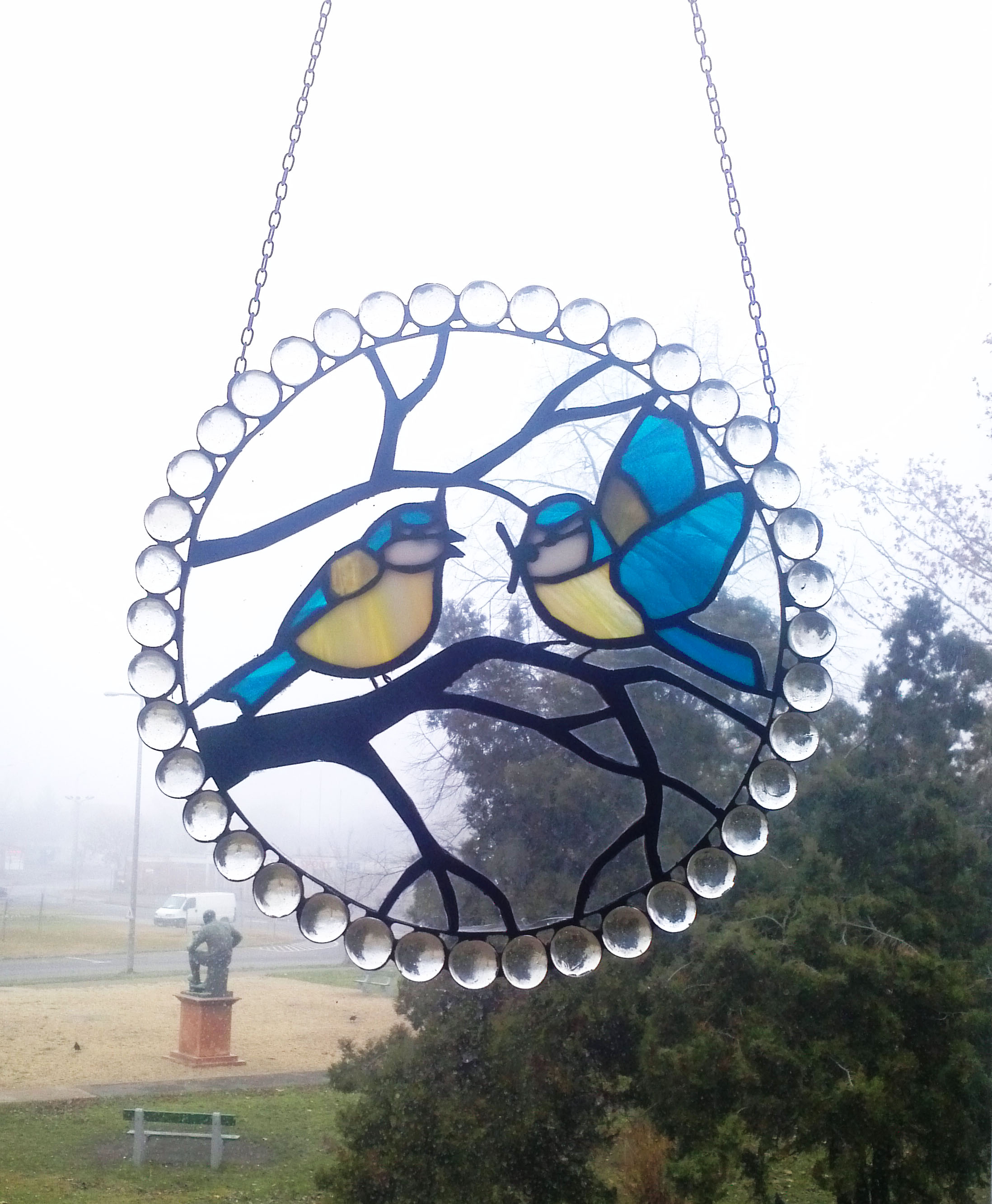 A háttér színe áttetsző, hogy áteressze a fényt és kiemelje a színeket, széle üveggyöngyből; aprólékos kidolgozású.