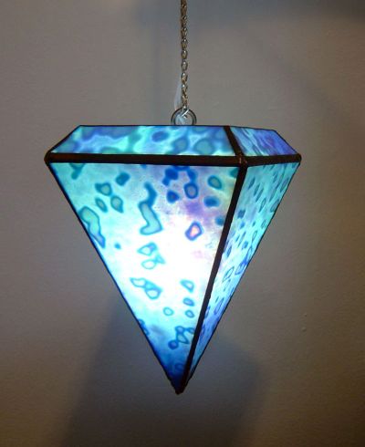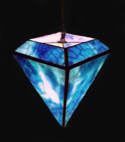 Rendelésre készült, egyedi, gyémánt formájú, színpompás függőlámpa. Mutatós és hangulatos, színessége révén pedig feldobja a teret különleges fényt árasztva magából.